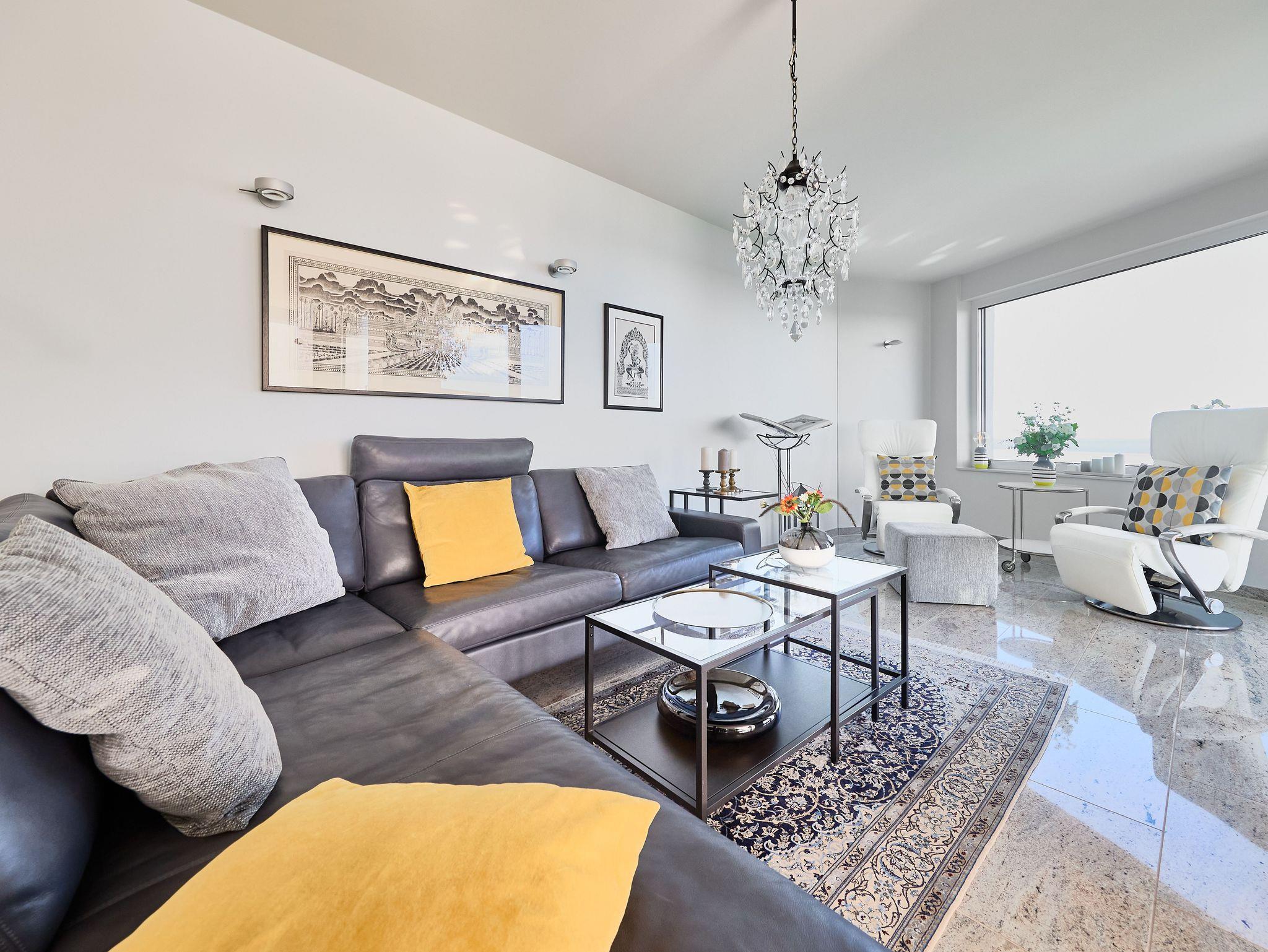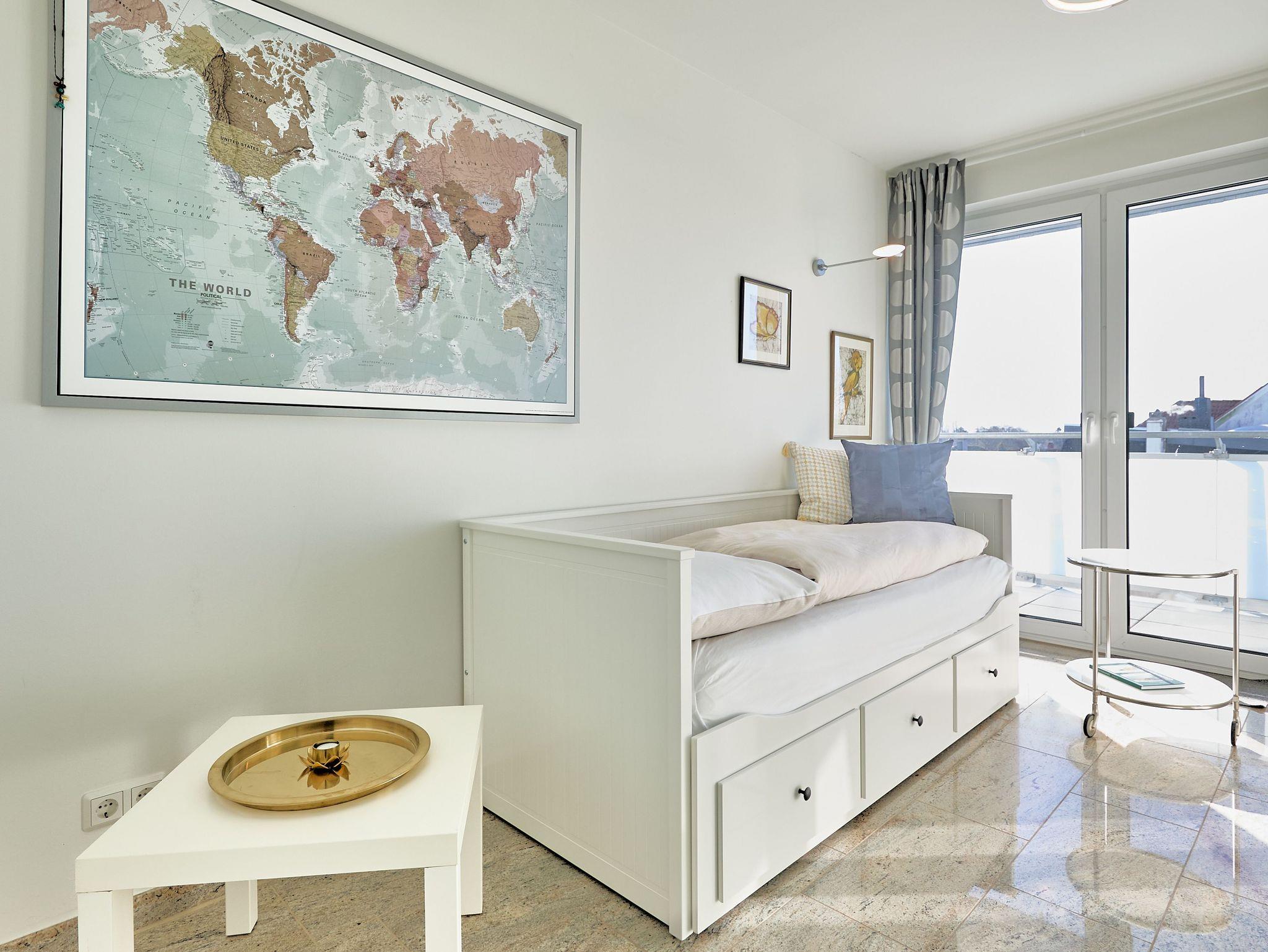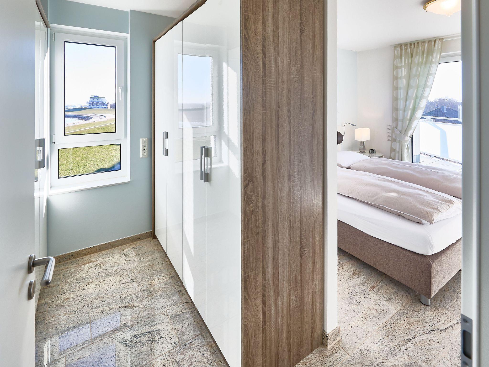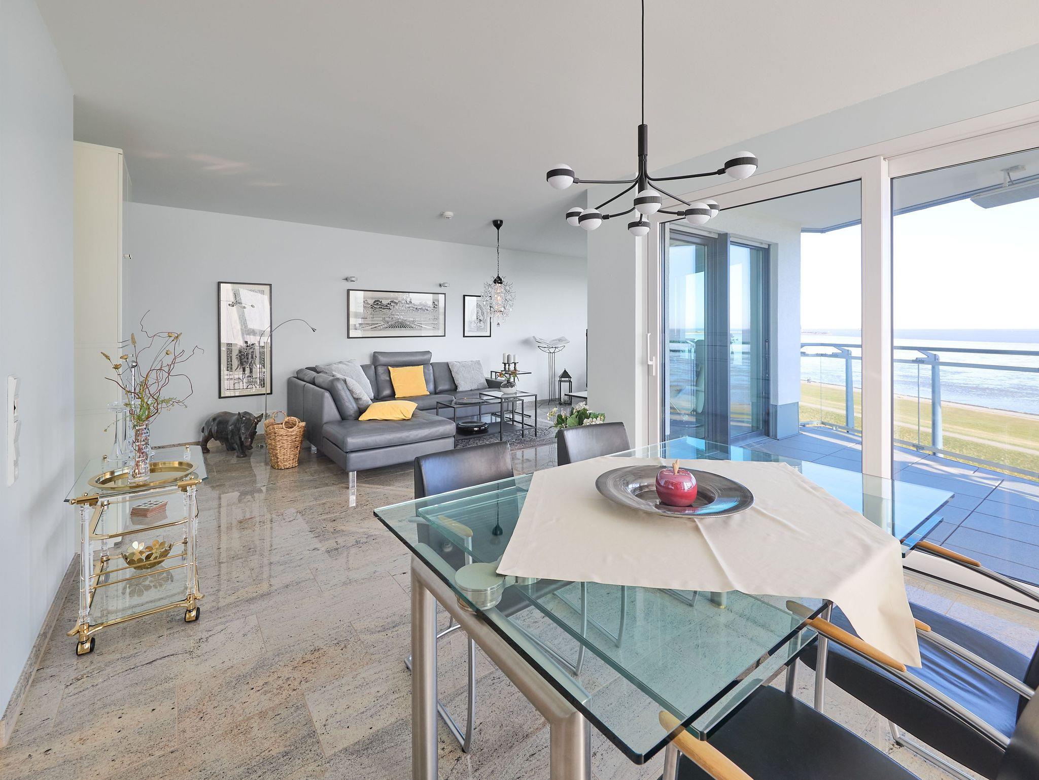Im Wohnbereich sorgen eine hochwertige Eck-Ledercouch und zwei Sessel, die zum Fenster ausgerichtet sind, für eine gemütliche Atmosphäre. Hier können Sie entspannen und den Blick auf die Elbmündung oder die vorbeiziehenden Schiffe genießen. Der Balkon bietet einen geschützten Platz, um die frische Meeresluft zu genießen ? selbst bei kühleren Brisen. Die gesamte Wohnung ist mit hochwertiger Beleuchtung und zur zusätzlichen Komfortverbesserung auch mit Lichtbewegungsmeldern, z.B. im Flur ausgestattet. Im Flur finden Sie neben der offenen Garderobe auch einen großen Garderobenschrank vor.