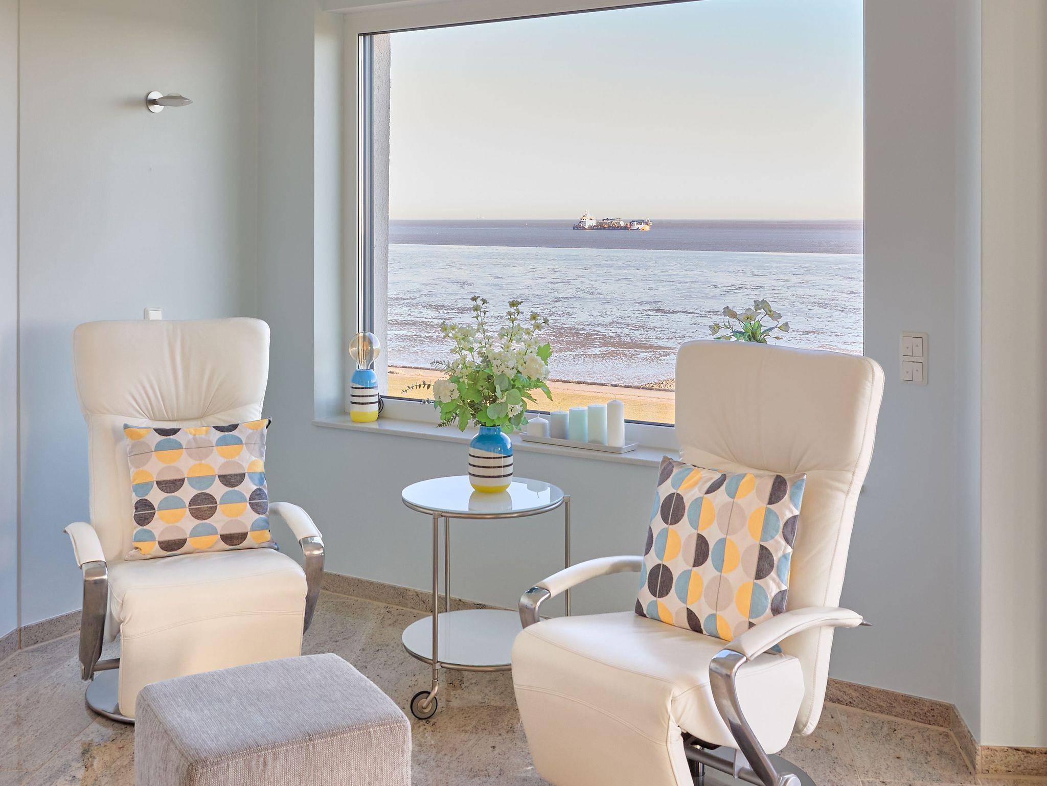 Im Wohnbereich sorgen eine hochwertige Eck-Ledercouch und zwei Sessel, die zum Fenster ausgerichtet sind, für eine gemütliche Atmosphäre. Hier können Sie entspannen und den Blick auf die Elbmündung oder die vorbeiziehenden Schiffe genießen. Der Balkon bietet einen geschützten Platz, um die frische Meeresluft zu genießen selbst bei kühleren Brisen. Die gesamte Wohnung ist mit hochwertiger Beleuchtung und zur zusätzlichen Komfortverbesserung auch mit Lichtbewegungsmeldern, z.B. im Flur ausgestattet. Im Flur finden Sie neben der offenen Garderobe auch einen großen Garderobenschrank vor.
