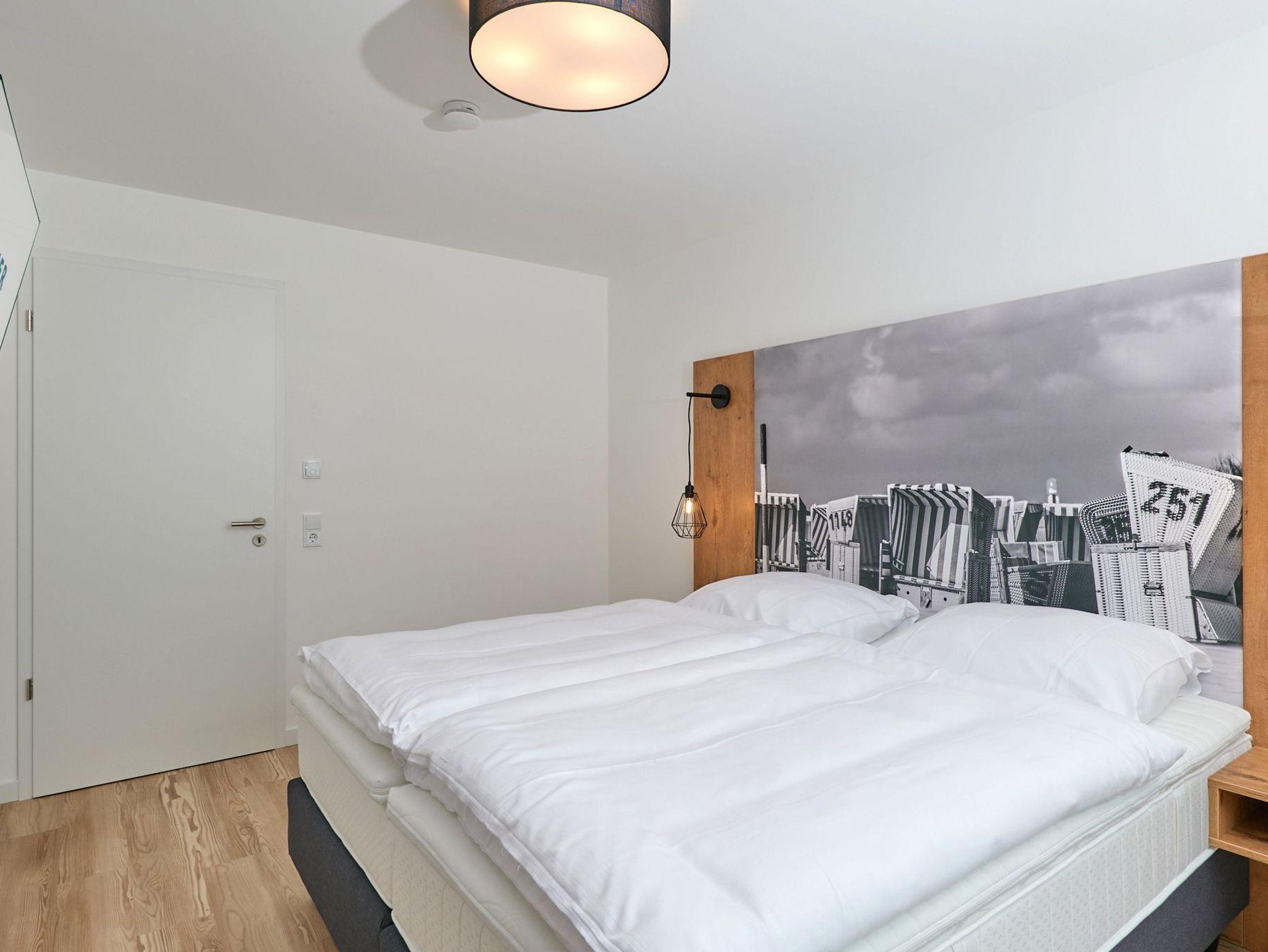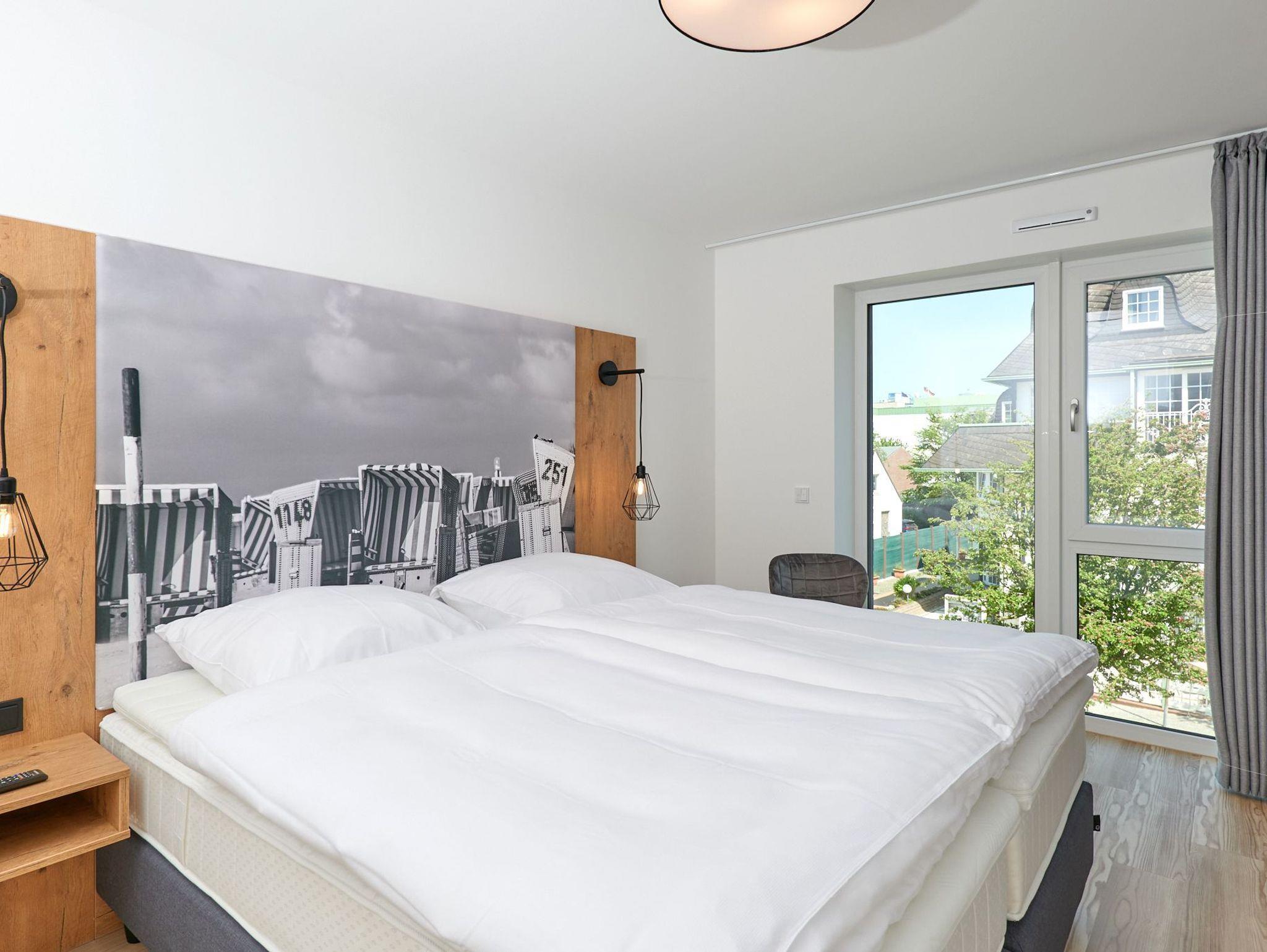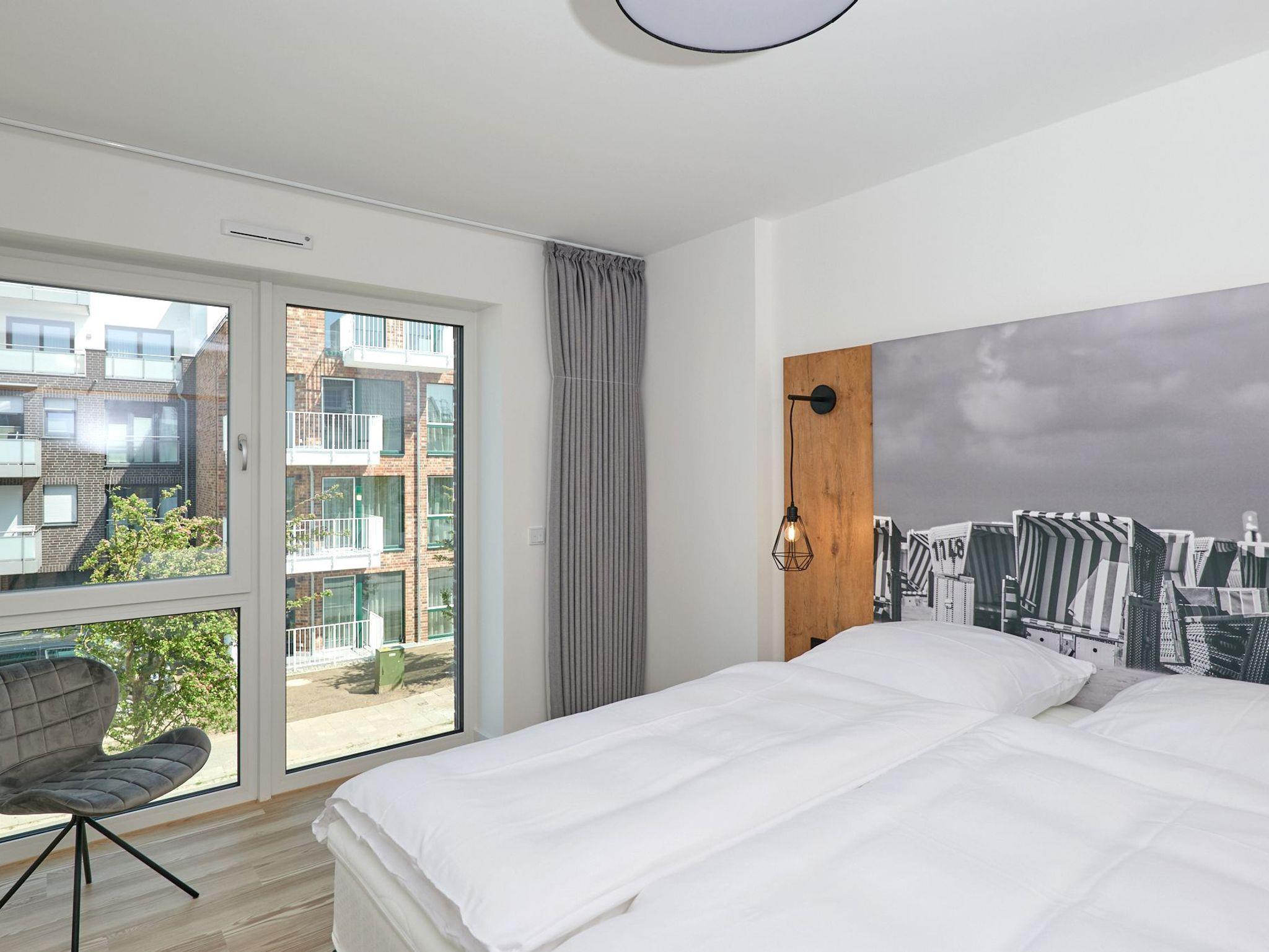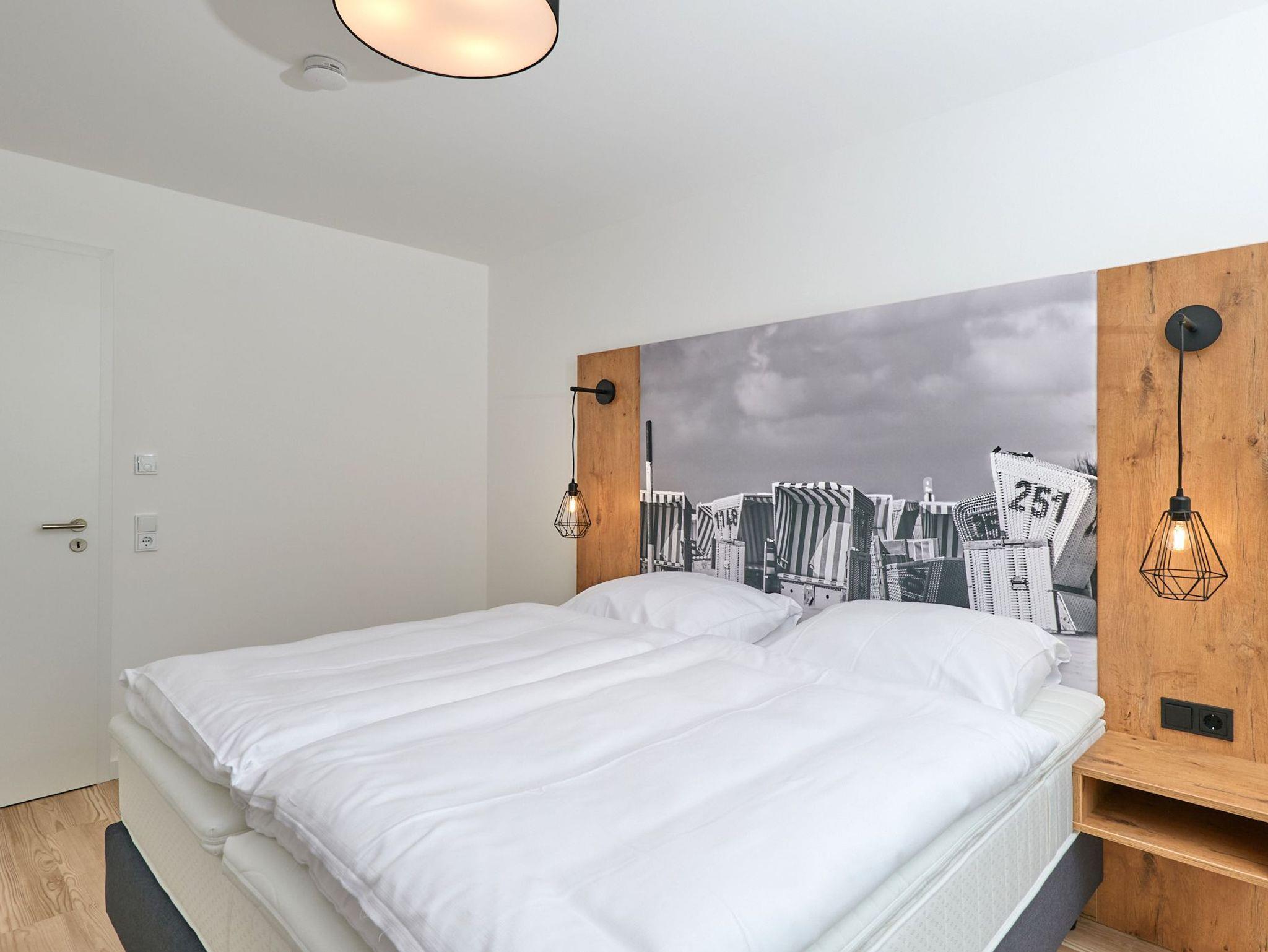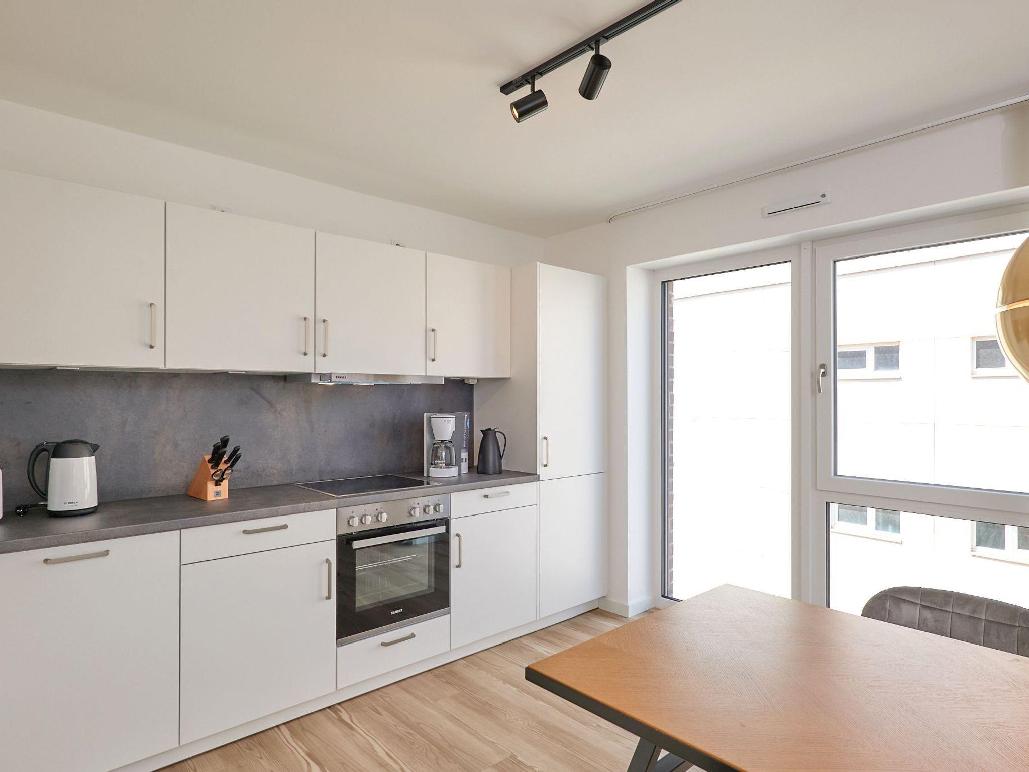 Neubau Mai 2023! Sehr schöne, moderne 3-Raum-Wohnung bis 4 Pers. voll ausgestattet auf ca. 91 m² in der 2.Etage gelegen, 2 Schlafzimmer mit komfortablen Doppelbetten (Bettwäsche inkl.) und Außenjalousien an allen Fenstern, ebenerdige Dusche/WC, Wohnzimmer mit großer Küchenzeile (Backofen, Geschirrspüler, Mikrowelle), 3x Kabel-TV, Radio, kostenfreies W-LAN-Internet, kleiner Balkon (nord) mit Teilseesicht, Personenaufzug, reservierter Pkw-Stellplatz in der Tiefgarage inkl., es sind keine Haustiere erlaubt und natürlich Nichtraucher. Durchfahrtshöhe Tiefgarage: 2,05m.
