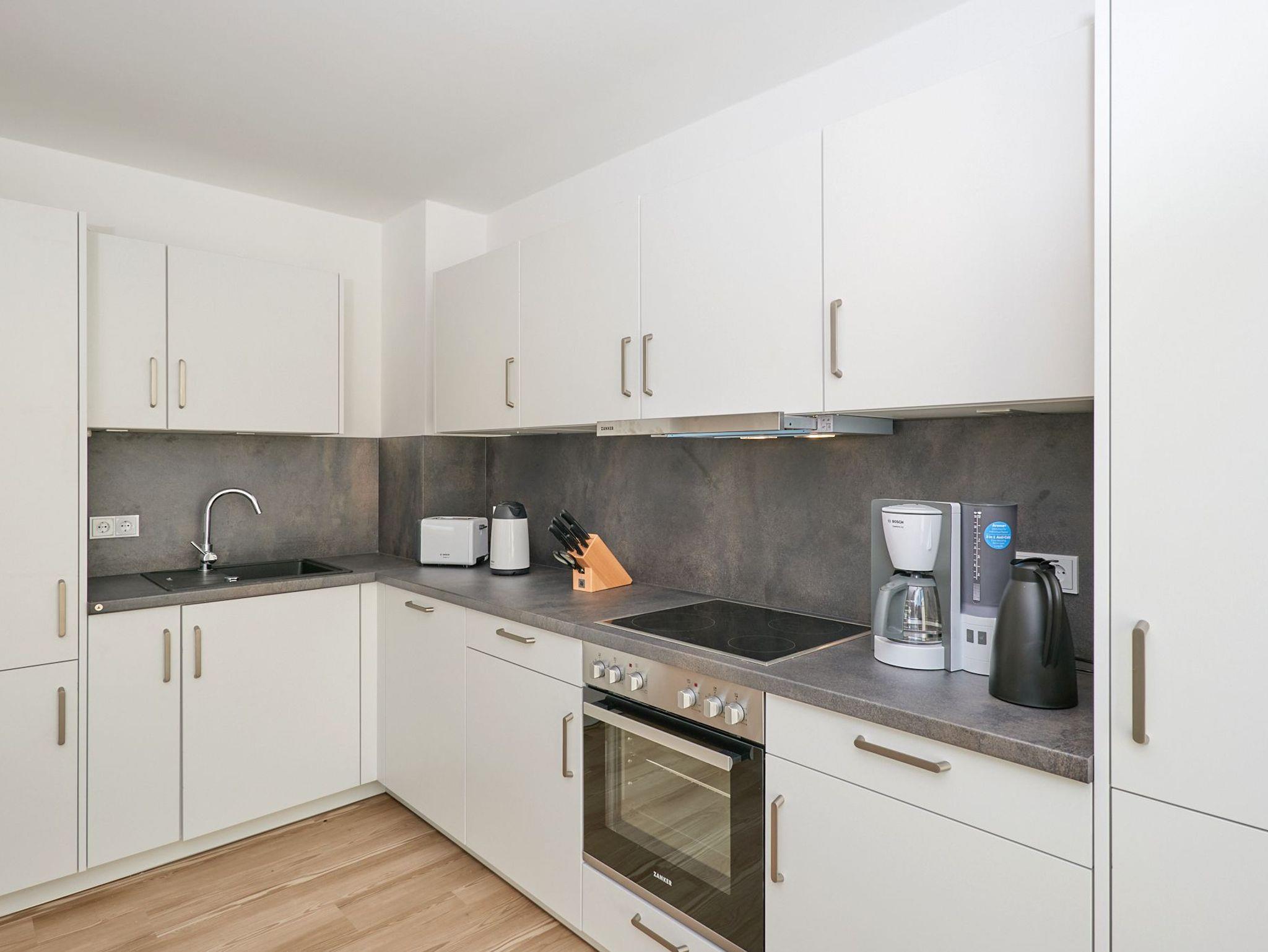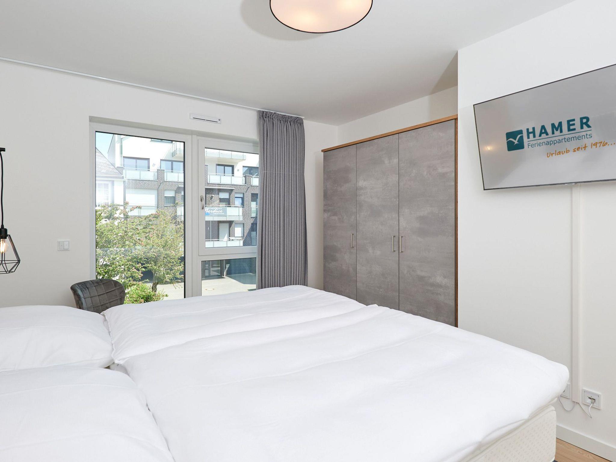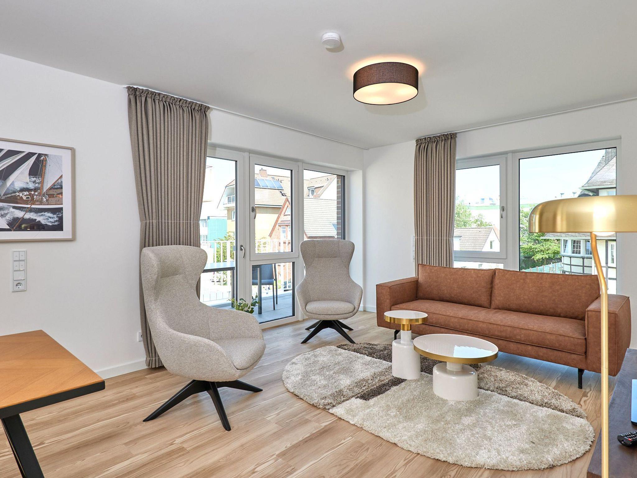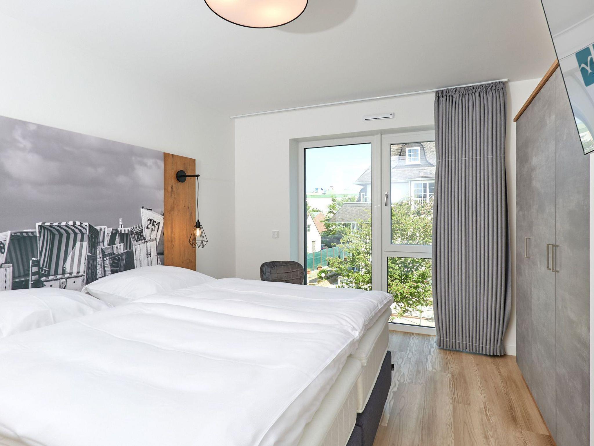 Neubau Mai 2023! Sehr schöne, moderne 3-Raum-Wohnung bis 4 Pers. voll ausgestattet auf ca. 91 m² in der 2.Etage gelegen, 2 Schlafzimmer mit komfortablen Doppelbetten (Bettwäsche inkl.) und Außenjalousien an allen Fenstern, ebenerdige Dusche/WC, Wohnzimmer mit großer Küchenzeile (Backofen, Geschirrspüler, Mikrowelle), 3x Kabel-TV, Radio, kostenfreies W-LAN-Internet, kleiner Balkon (nord) mit Teilseesicht, Personenaufzug, reservierter Pkw-Stellplatz in der Tiefgarage inkl., es sind keine Haustiere erlaubt und natürlich Nichtraucher. Durchfahrtshöhe Tiefgarage: 2,05m.