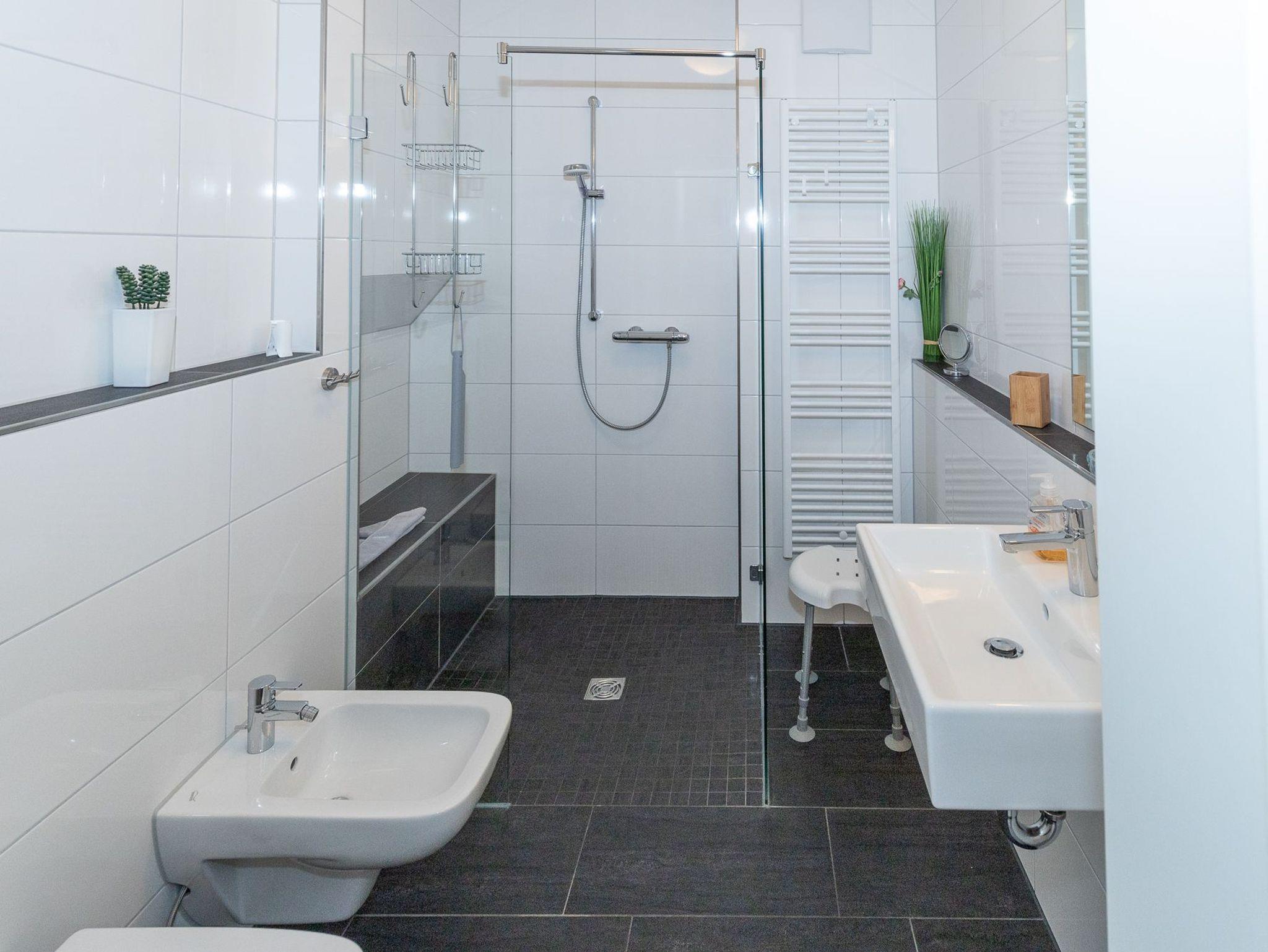 Die Aufteilung der Wohnung umfasst neben dem Wohn- und Essbereich auch ein Schlafzimmer mit Boxspringbetten und direktem Zugang zur Dachterrasse. Ein geräumiges Duschbad mit WC und Bidet steht Ihnen ebenfalls zur Verfügung. Für eine dritte Person steht im Wohnbereich eine bequeme Schlafcouch bereit.