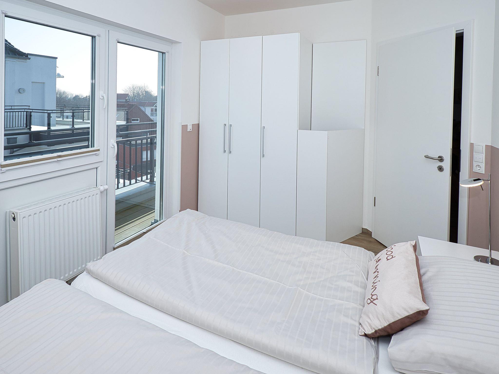 Die Nichtraucherwohnung ist besonders für Asthmatiker geeignet und bietet Platz für bis zu drei Personen. Auf der dritten Etage erwartet Sie ein helles und komfortables Ambiente mit einer großzügigen umlaufenden Dachterrasse, die über eine Markise (Süd/Ost) und Sonnenliegestühle verfügt. Bitte beachten Sie, dass das Rauchen sowohl innerhalb der Wohnung als auch auf der Dachterrasse nicht gestattet ist.