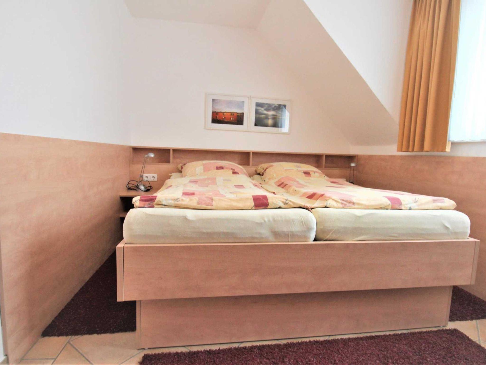 Rechts befindet sich der große Schlafraum. Dieser ist mit einem modernen großen Bett für zwei Personen ausgestattet. Ein Einbauschrank mit vielen Unterbringungsmöglichkeiten steht Ihnen hier zur Verfügung. Ein Flachbildfernseher und DVD-Player sind ebenfalls in diesem Raum integriert.