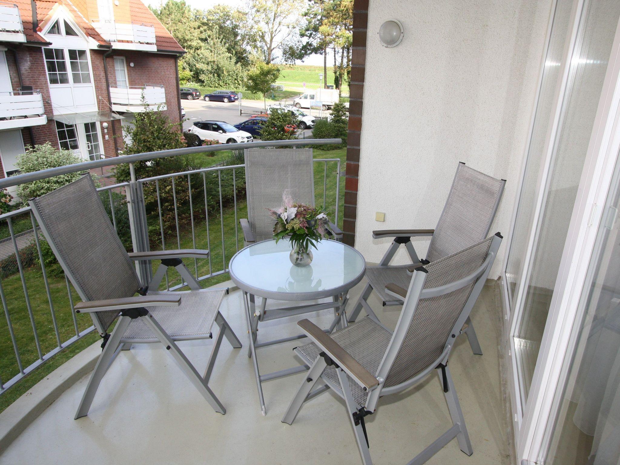 Großzügiger möblierter Balkon in Süd-/Westlage mit Blick auf den Deich und die Nordsee.