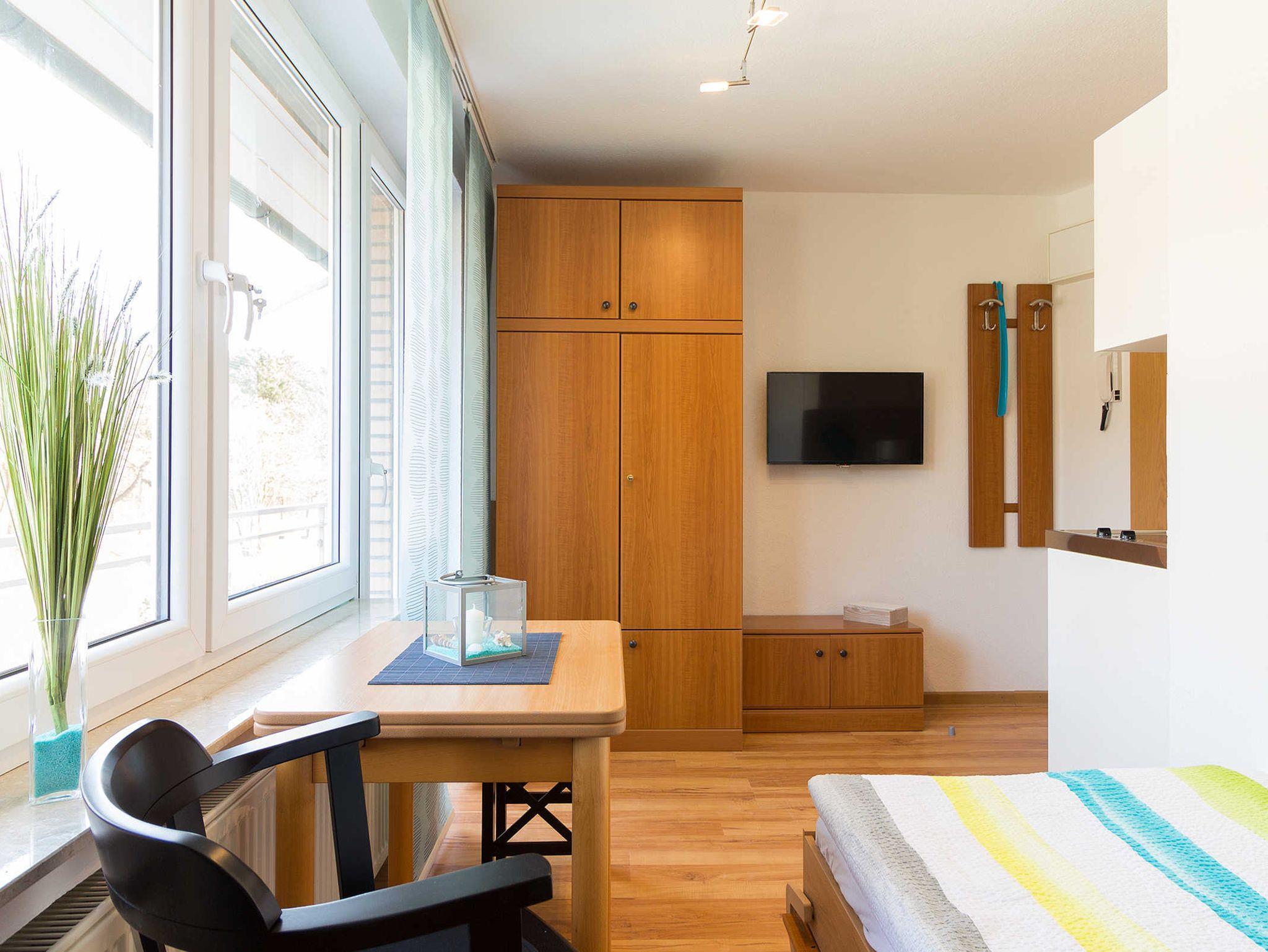 In dem Wohn - Schlafraum befindet sich ein moderner Flachbild - Fernseher.