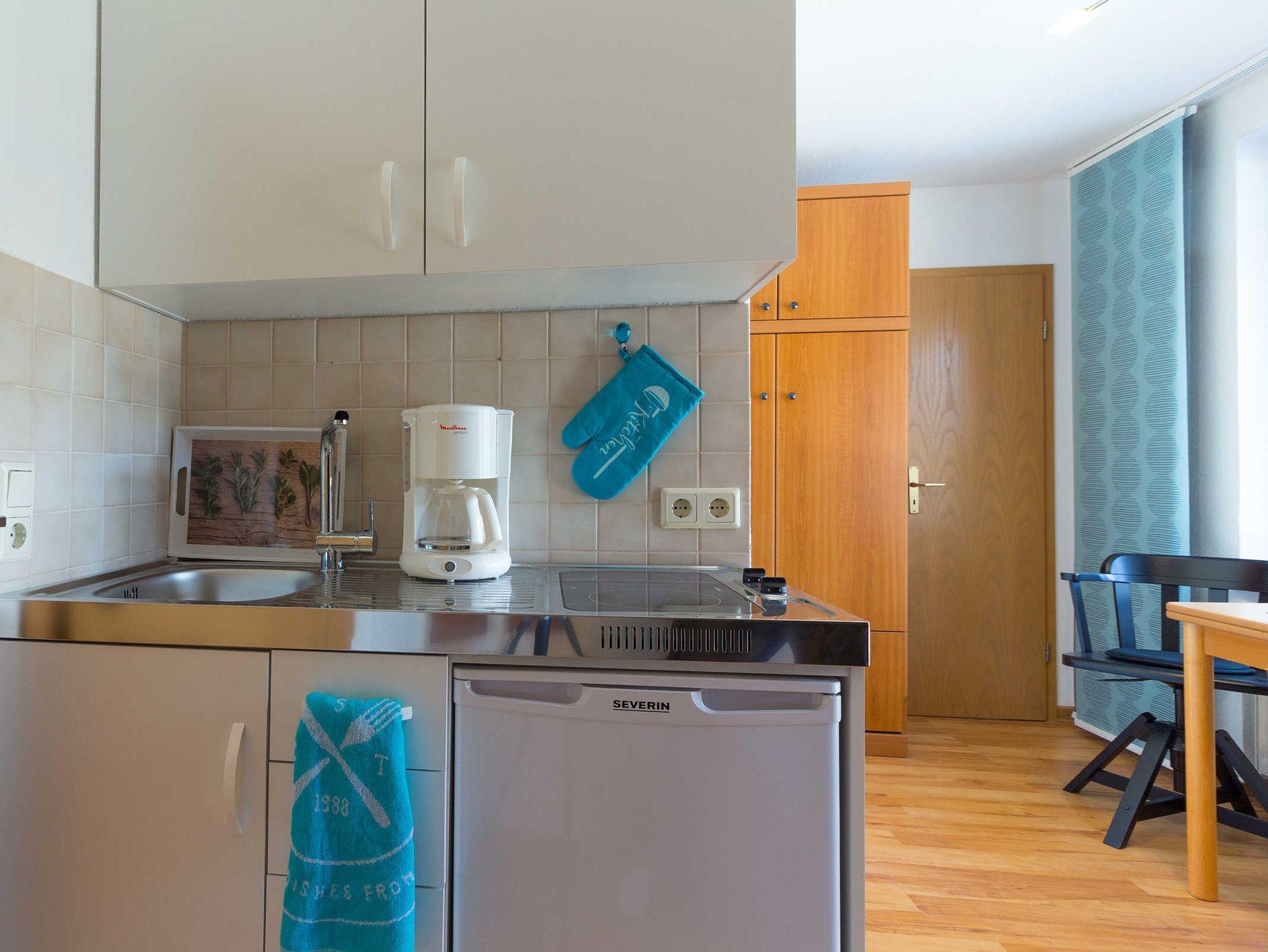Eine gut ausgestattete Pantry - Küche, sowie einen Tisch mit gemütlichem Stuhl. Ein Kleiderschrank sowie eine Garderobe bieten ausreichend Platz für die Unterbringung der Kleidung. Das gemütliche Bett befindet sich in einem praktischen Wandschrank. Das großzügige Bad ist modern ausgestattet.