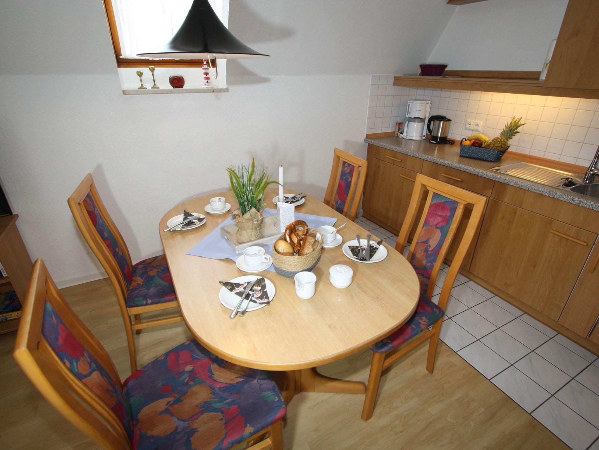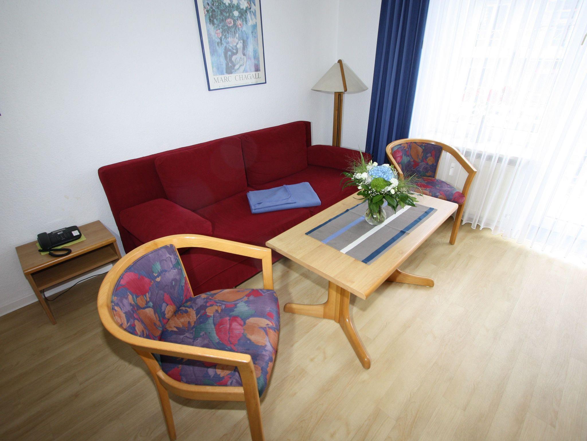 Bei der Sitzgruppe im Wohnzimmer können Sie die Couch bei Bedarf zu einem Doppelbett ausziehen. Digital-SAT-TV und Telefon (für Sie innerhalb Deutschlands kostenlos) sind selbstverständlich vorhanden. Der große Esstisch wird vielleicht zum Mittelpunkt.