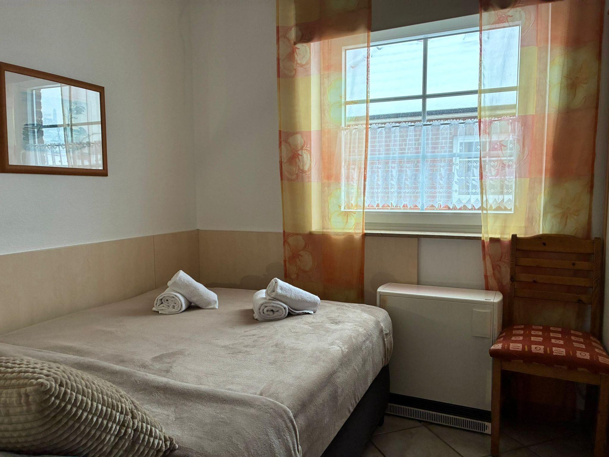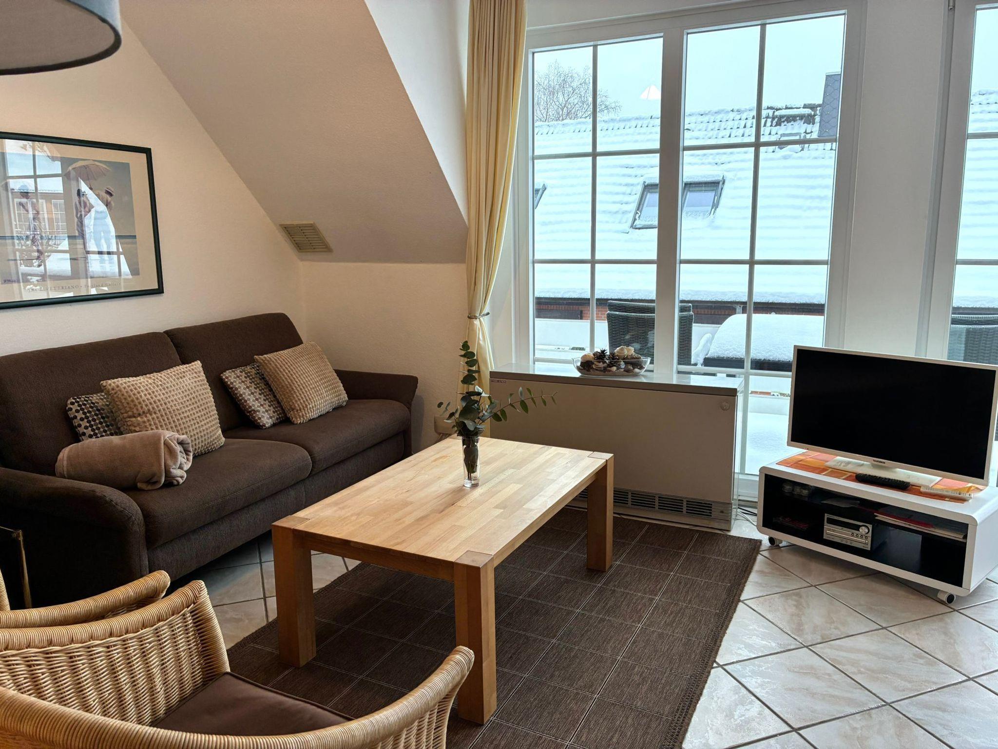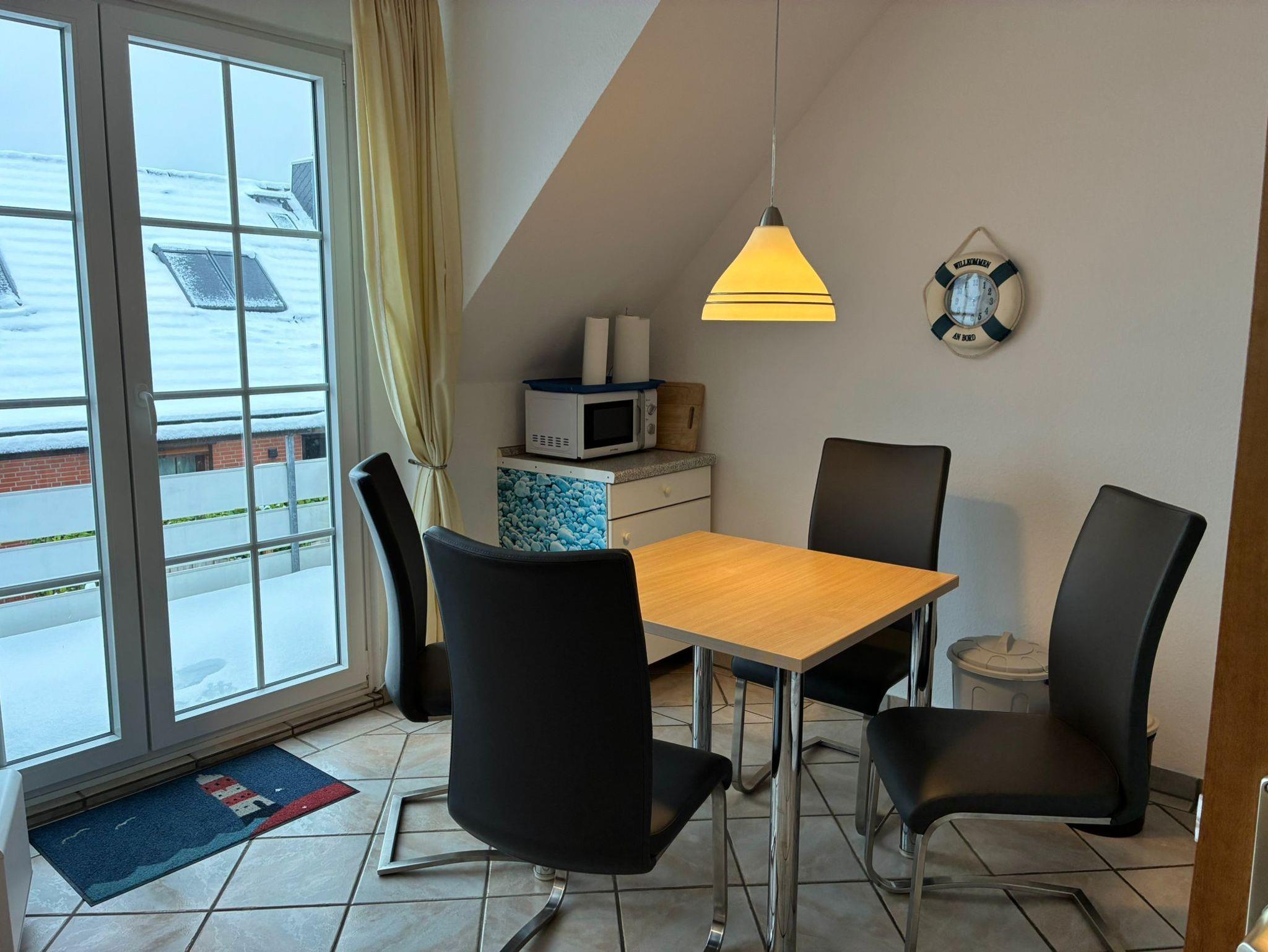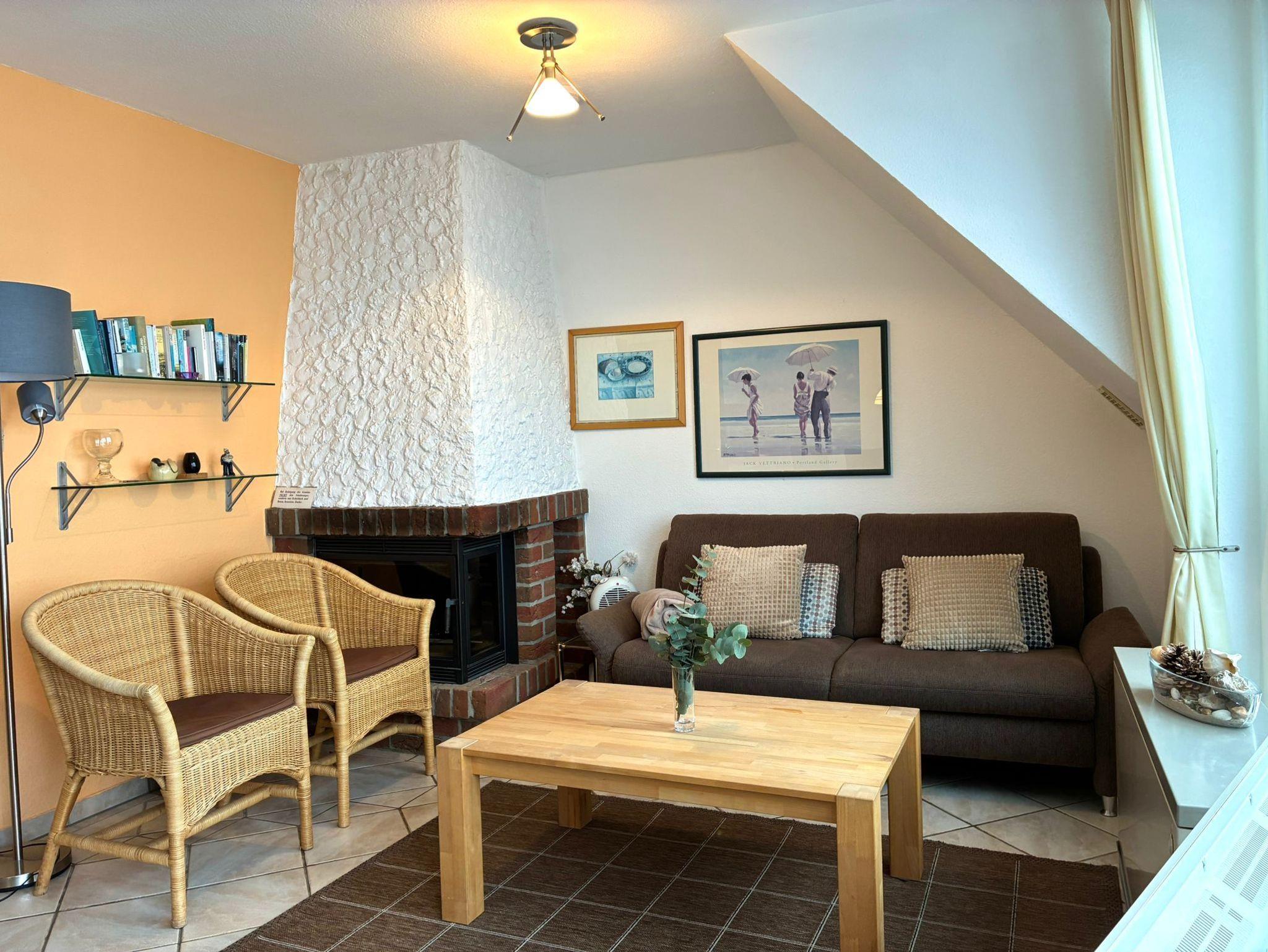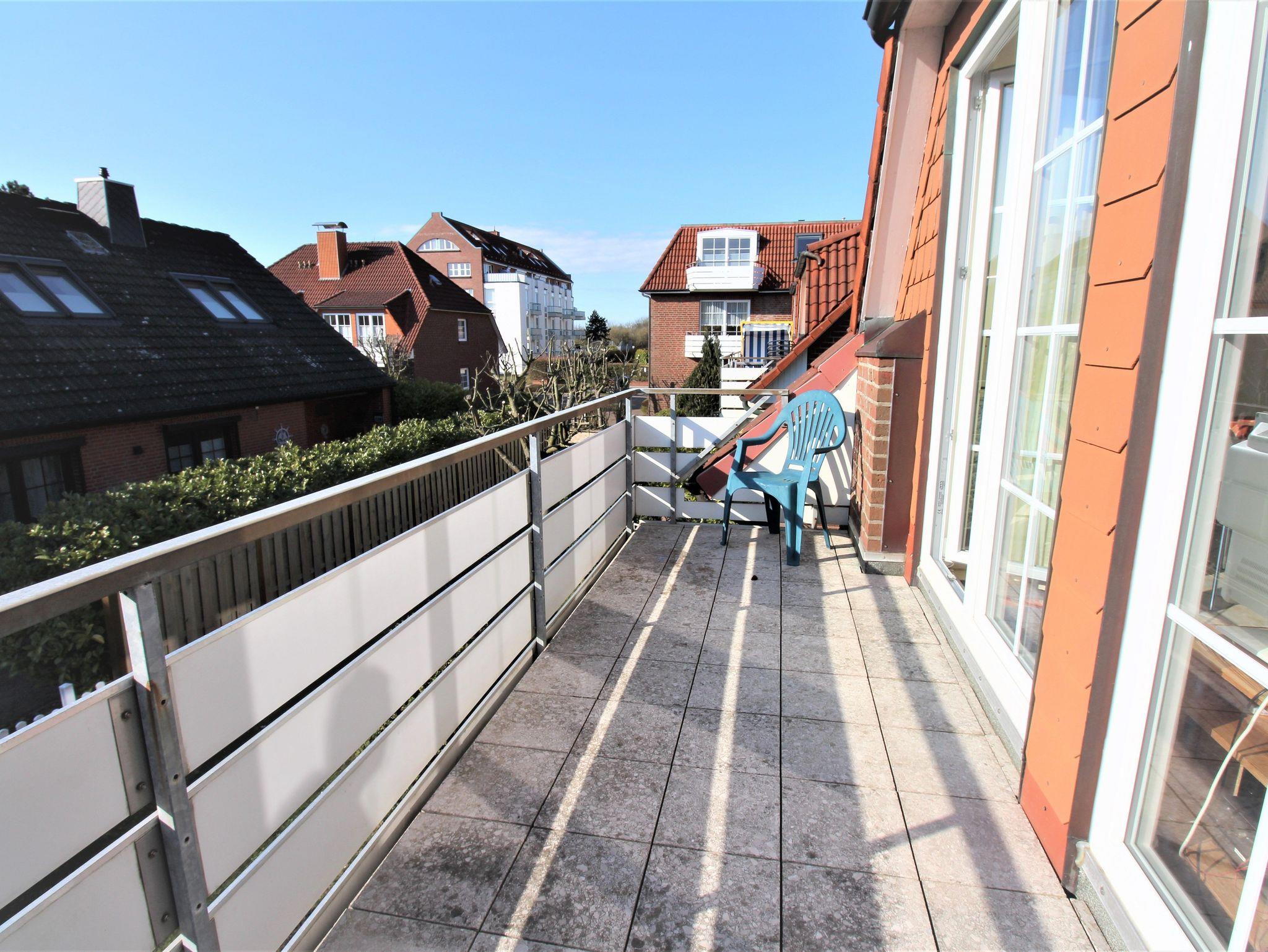 Sie wohnen in einem 3-Zimmer-Appartement für bis zu 4 Personen auf ca. 49 m² im Dachgeschoss des Friesenhauses. EIn Schlafzimmer mit Doppelbett (180 cm x 200 cm), ein kleineres Schlafzimmer mit Doppelbett (140 cm x 200 cm), Wohnraum mit gemütlicher Couch und Kamin, separater Essplatz, voll ausgestatteter Küchenbereich mit Geschirrspüler, Mikrowelle, SAT-Flachbild-TV. Renoviertes Bad: Dusche/WC, Westbalkon mit der Nachmittags- und Abendsonne.