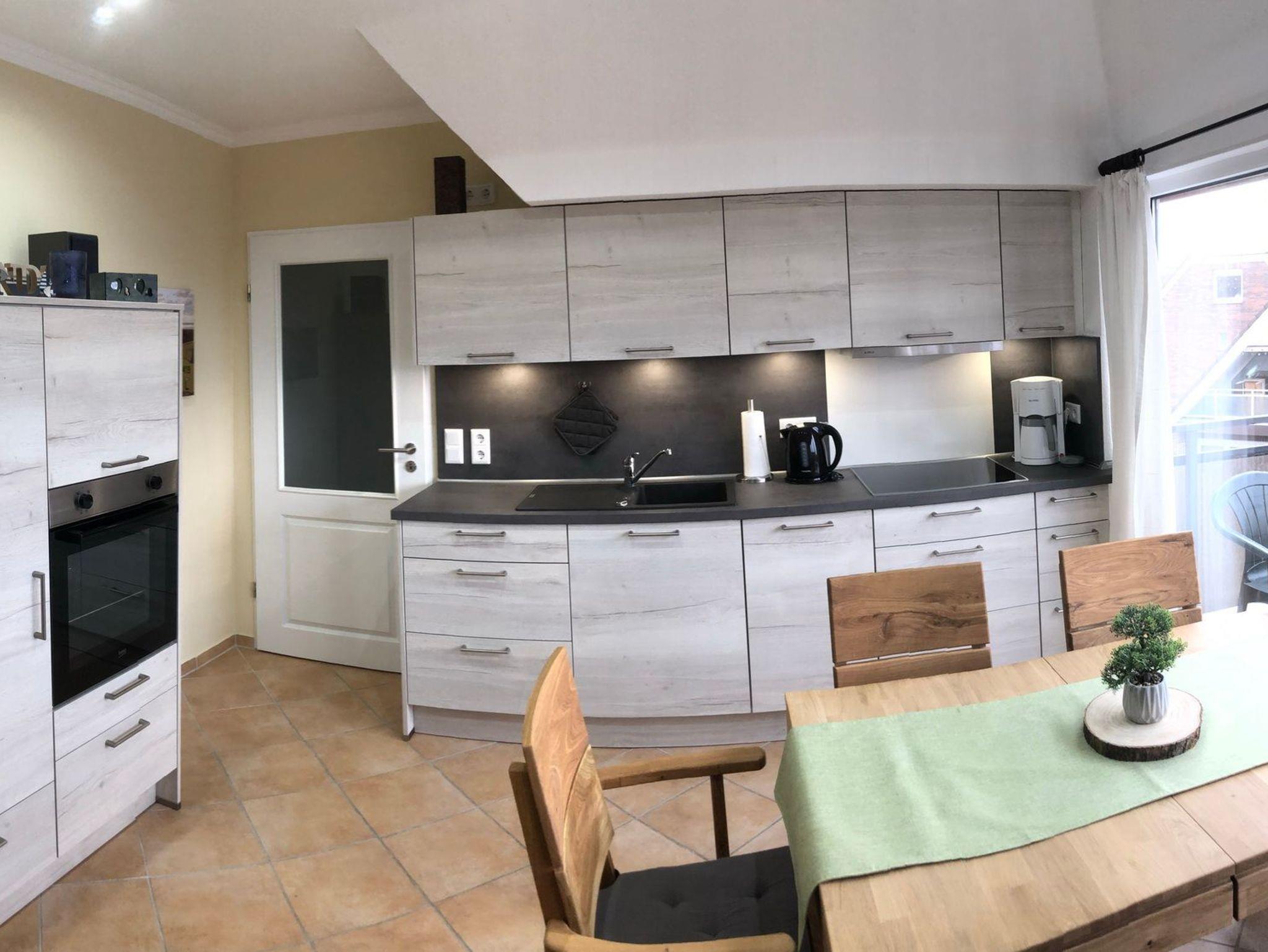Die 2-Zimmer-Wohnungbefindet sich in der obersten Etage (3. Stockwerk), die Sie bequem mit dem Fahrstuhl erreichen. Durch den kleinen Eingangsbereich gelangen Sie in das lichtdurchflutete Wohn-/Esszimmer. Dieses ist eingerichtet mit einer hellen, komplett ausgestatteten komfortablen Einbauküche mit Geschirrspüler, großem Kühl-/Gefrierschrank, Backofen, E-Herd mit Ceranfeld sowie einer Mikrowelle. Zur Ausstattung gehören zusätzlich eine Filter-Kaffeemaschine, eine Senseo-Kaffeemaschine, Milchaufschäumer, Wasserkocher, Toaster sowie ein Eierkocher.
