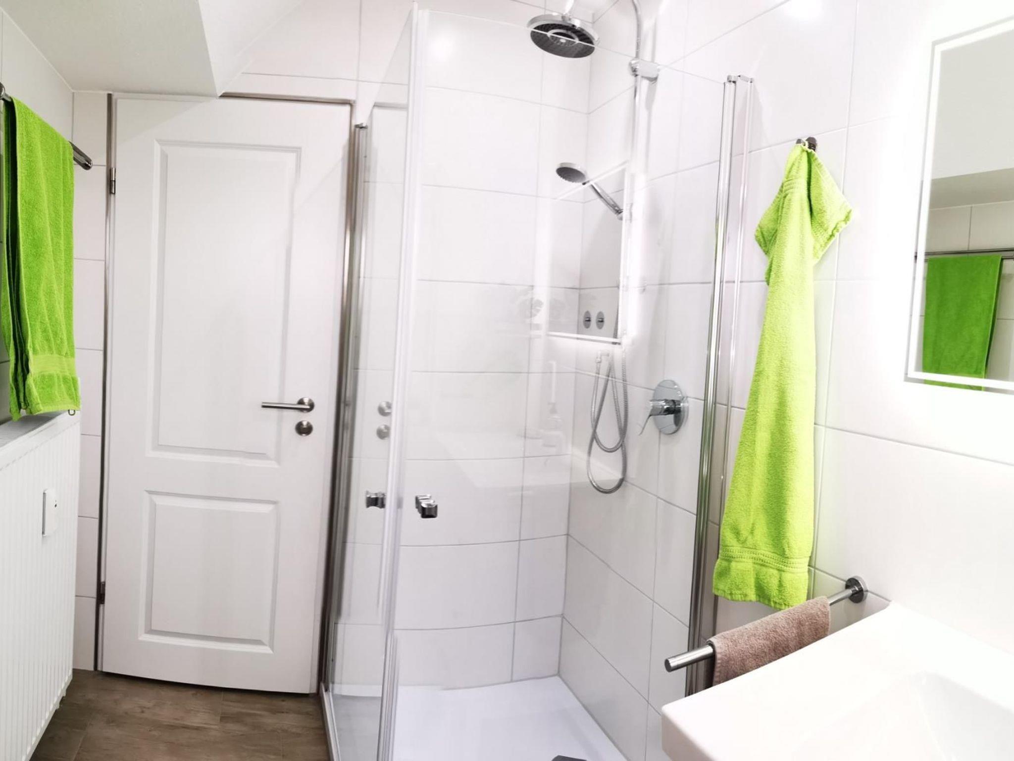 Das helle Tageslichtbad verfügt über eine großzügige Dusche mit niedrigem Einstieg und bietet genügend Stauraum. Ein Föhn ist vorhanden.