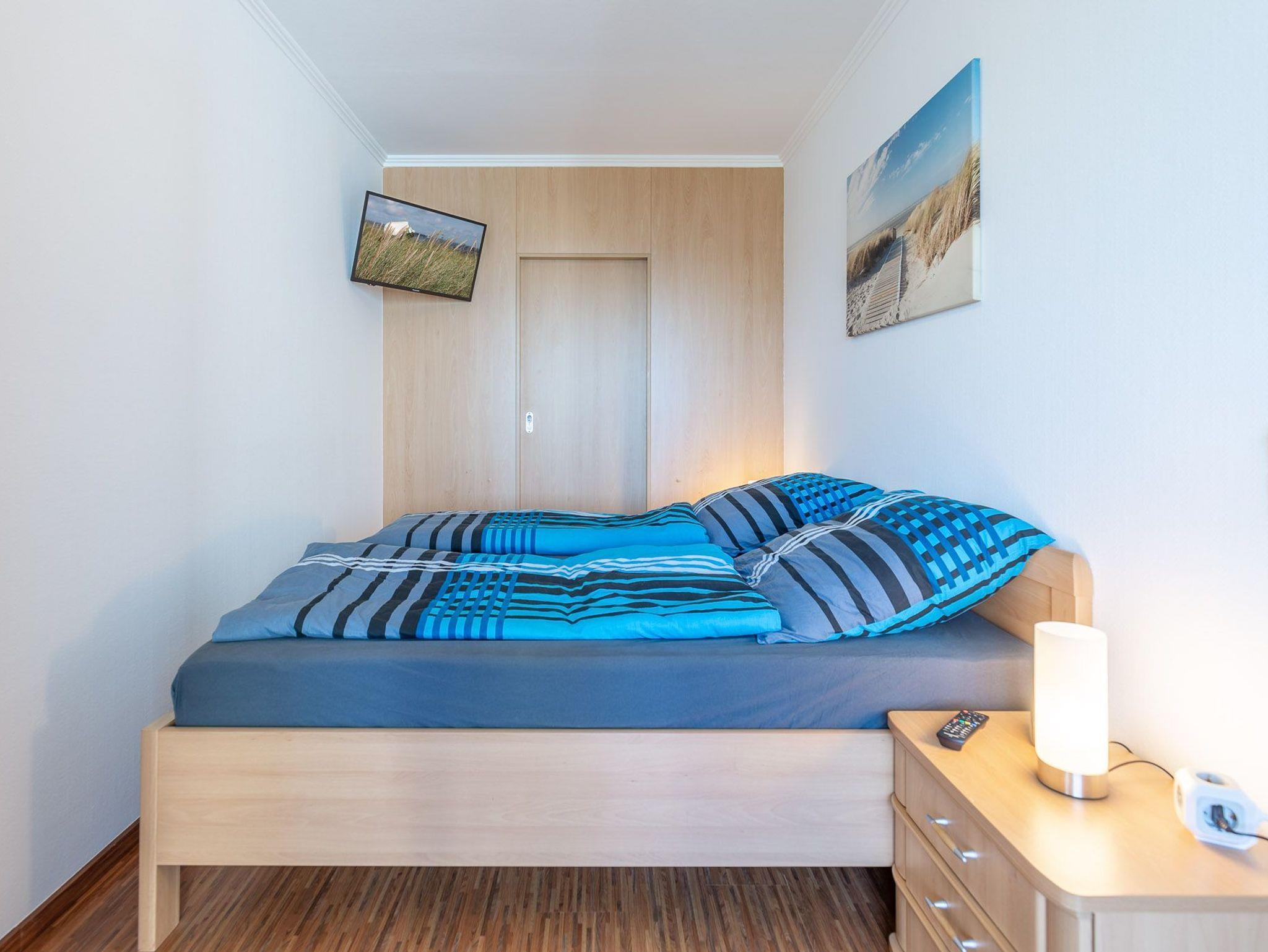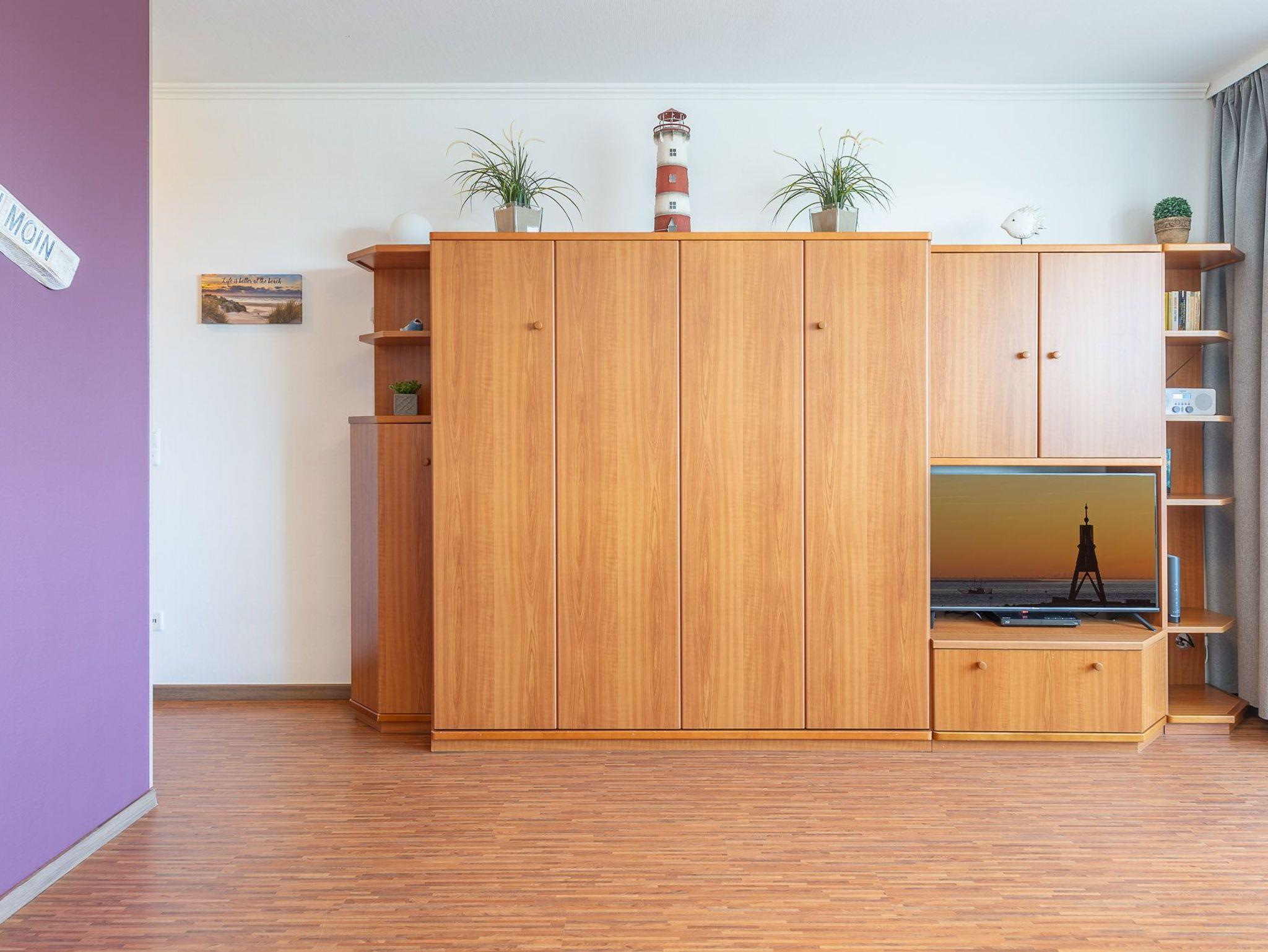 Nach einem erlebnisreichen Tag bietet die 50 m² Ferienwohnung einen erholsamen Rückzugsort für bis zu 2 Personen. Neben einem separaten Schlafzimmer mit Doppelbett gibt es im Wohnzimmer eine weitere Schlafgelegenheit als Schrankbett. Eine offene Küche mit Essplatz im Wohnraum lädt zum gemütlichen Abendessen oder einem langen Spieleabend ein.