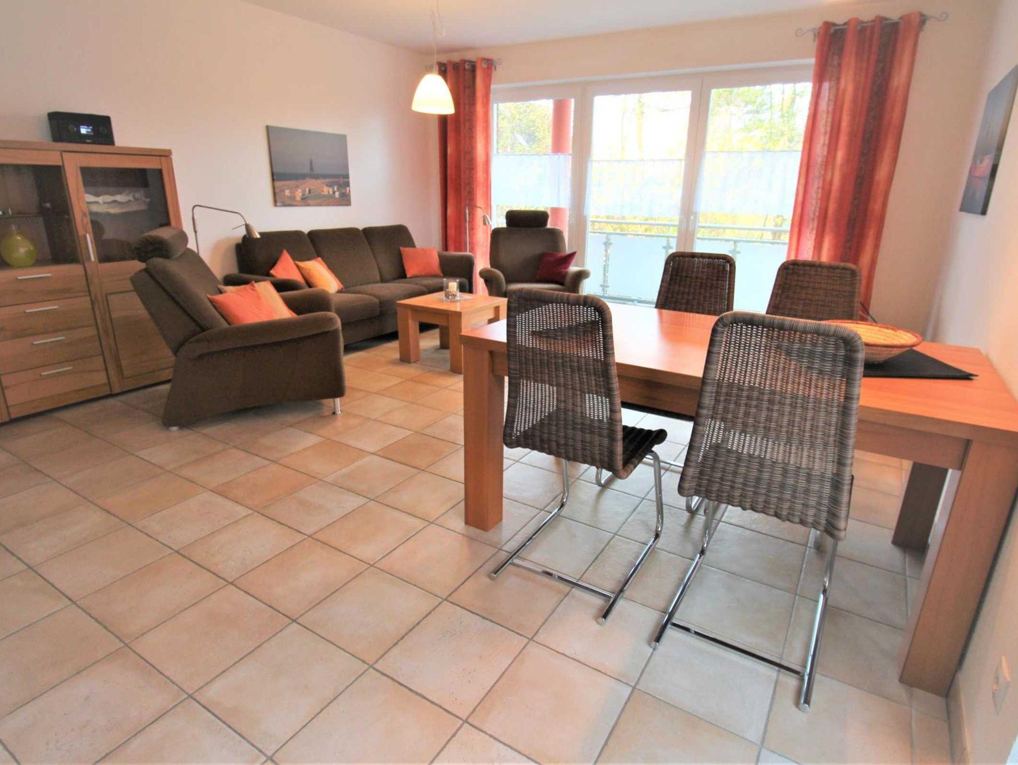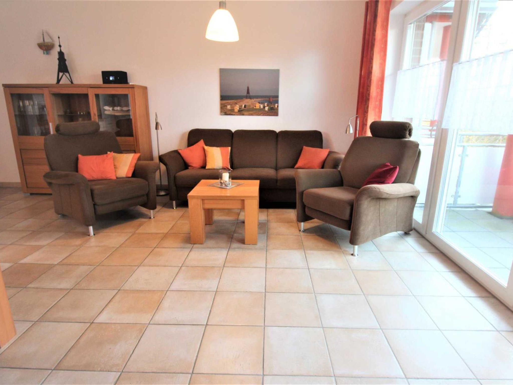 ein Wohnzimmer mit großem West-Balkon, SAT-TV, kostenlosem WLAN und Internet-Radio. Ebenfalls im