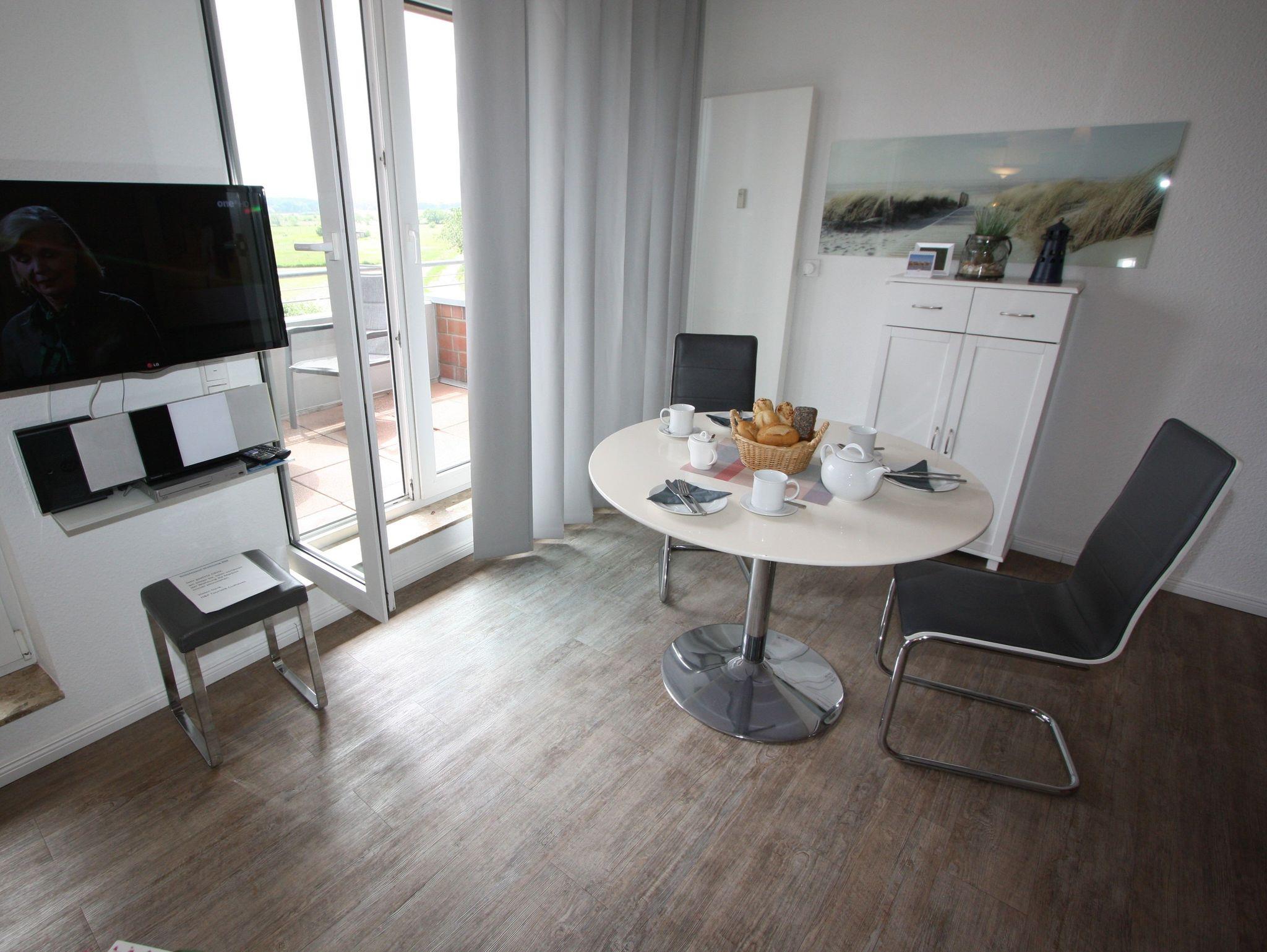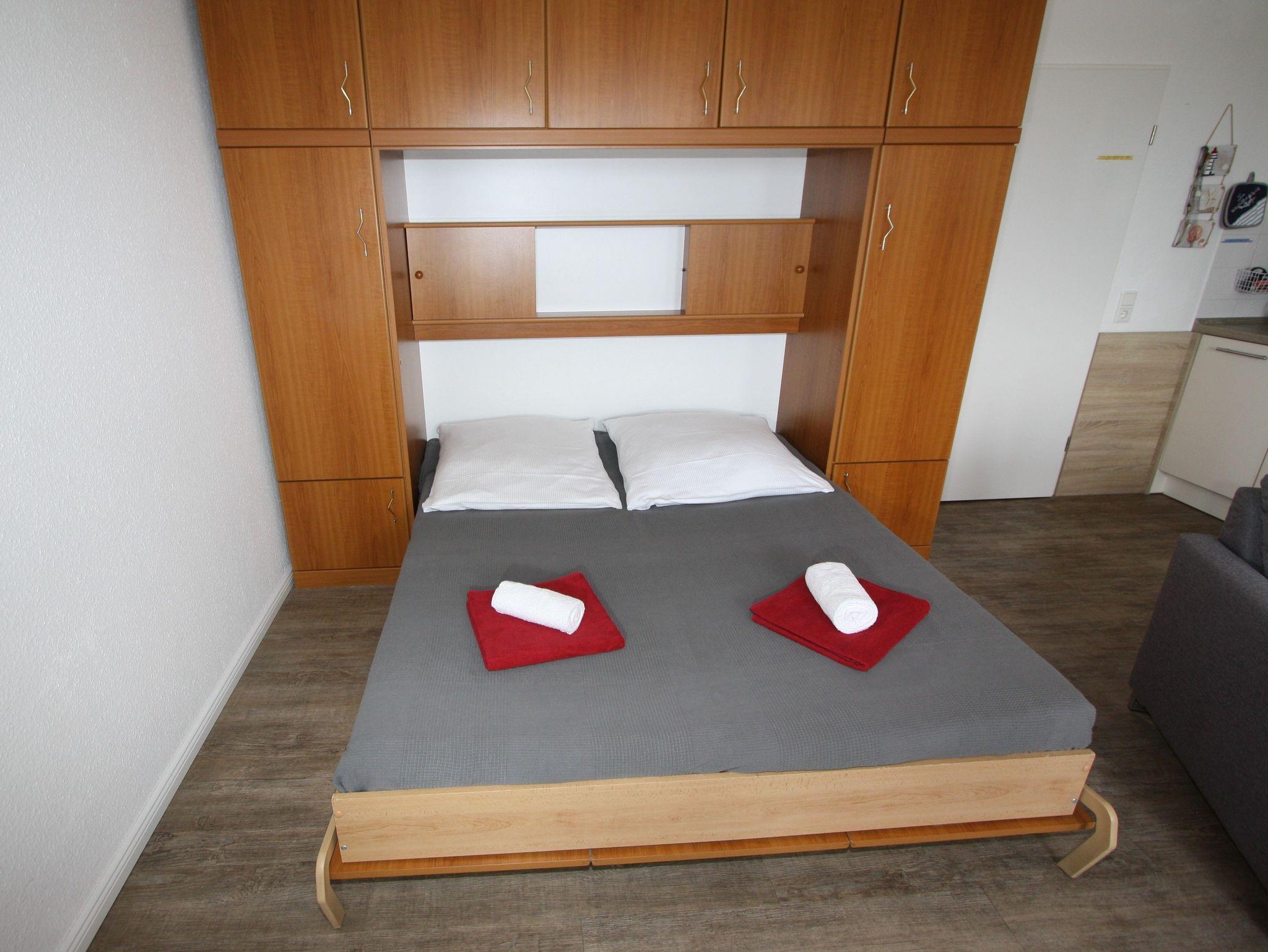 Wohn-/ Schlafraum mit bequemen Doppelschrankbett und LCD-Fernseher, Doppelschlafcouch, separatem Essplatz.