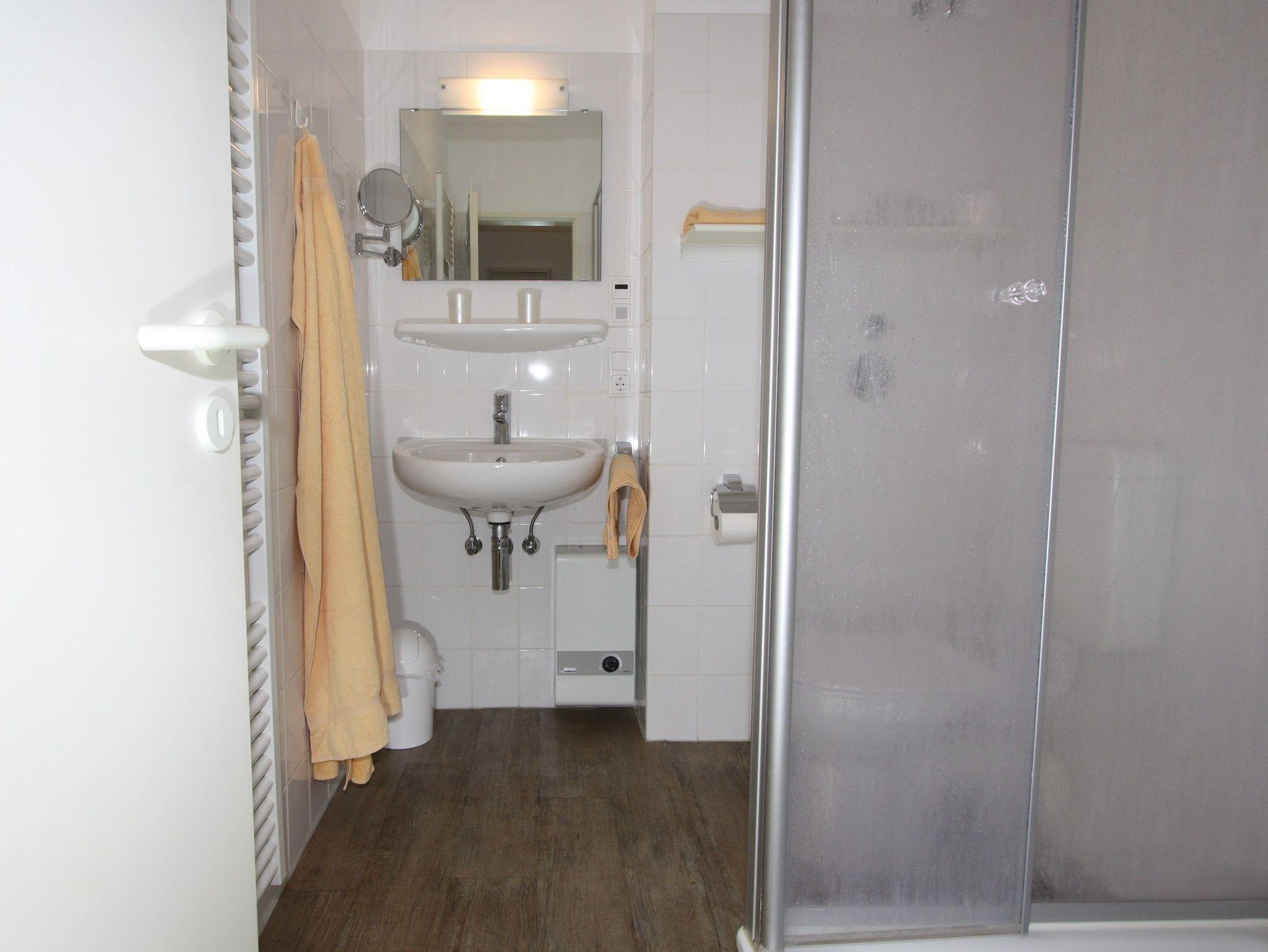 Bad mit Dusche, Handtuchheizungskörper und WC.