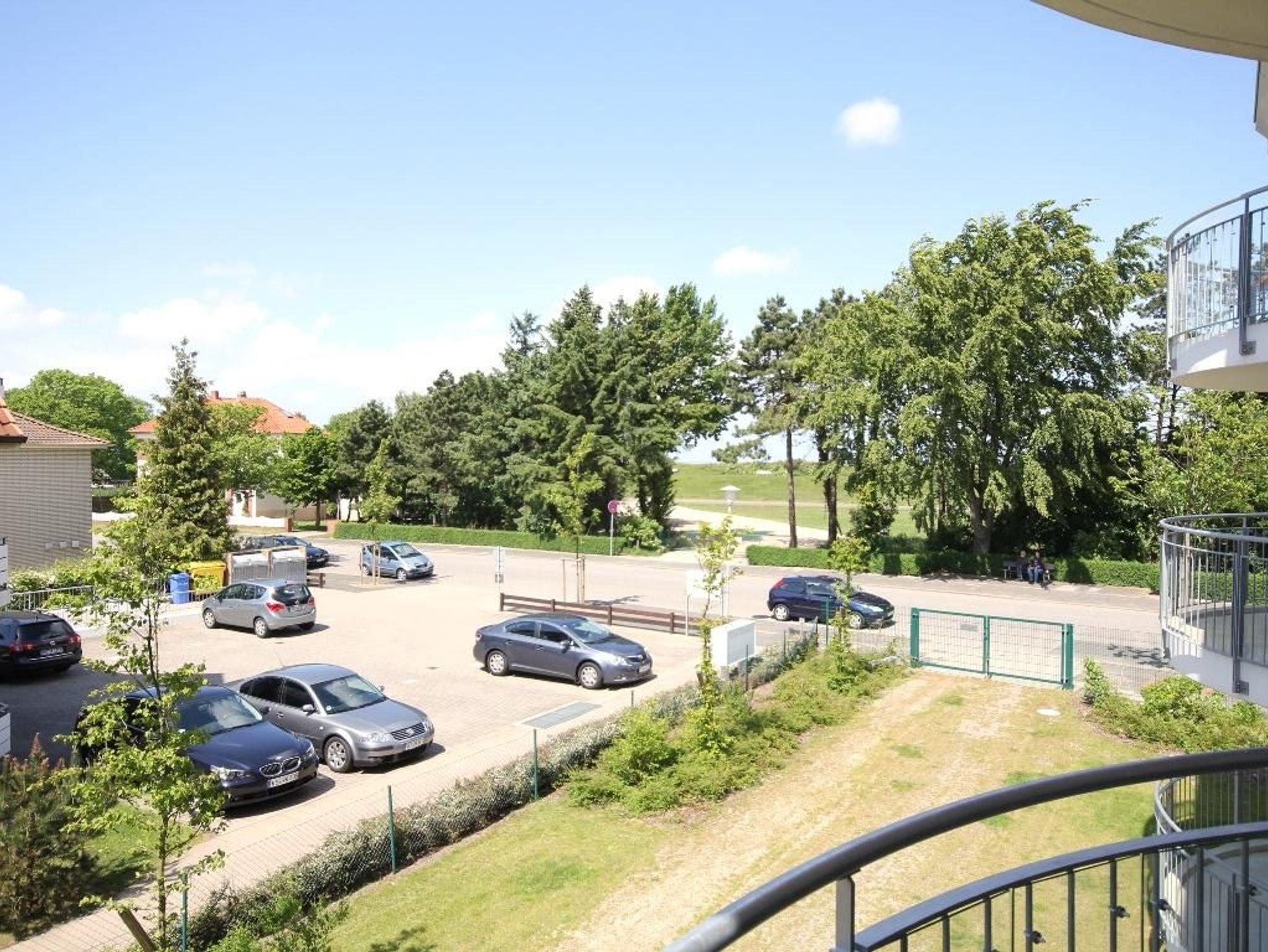 Balkon zur Westseite ? mit Teilseesicht zwischen den Bäumen, Glaselement als Windschutz