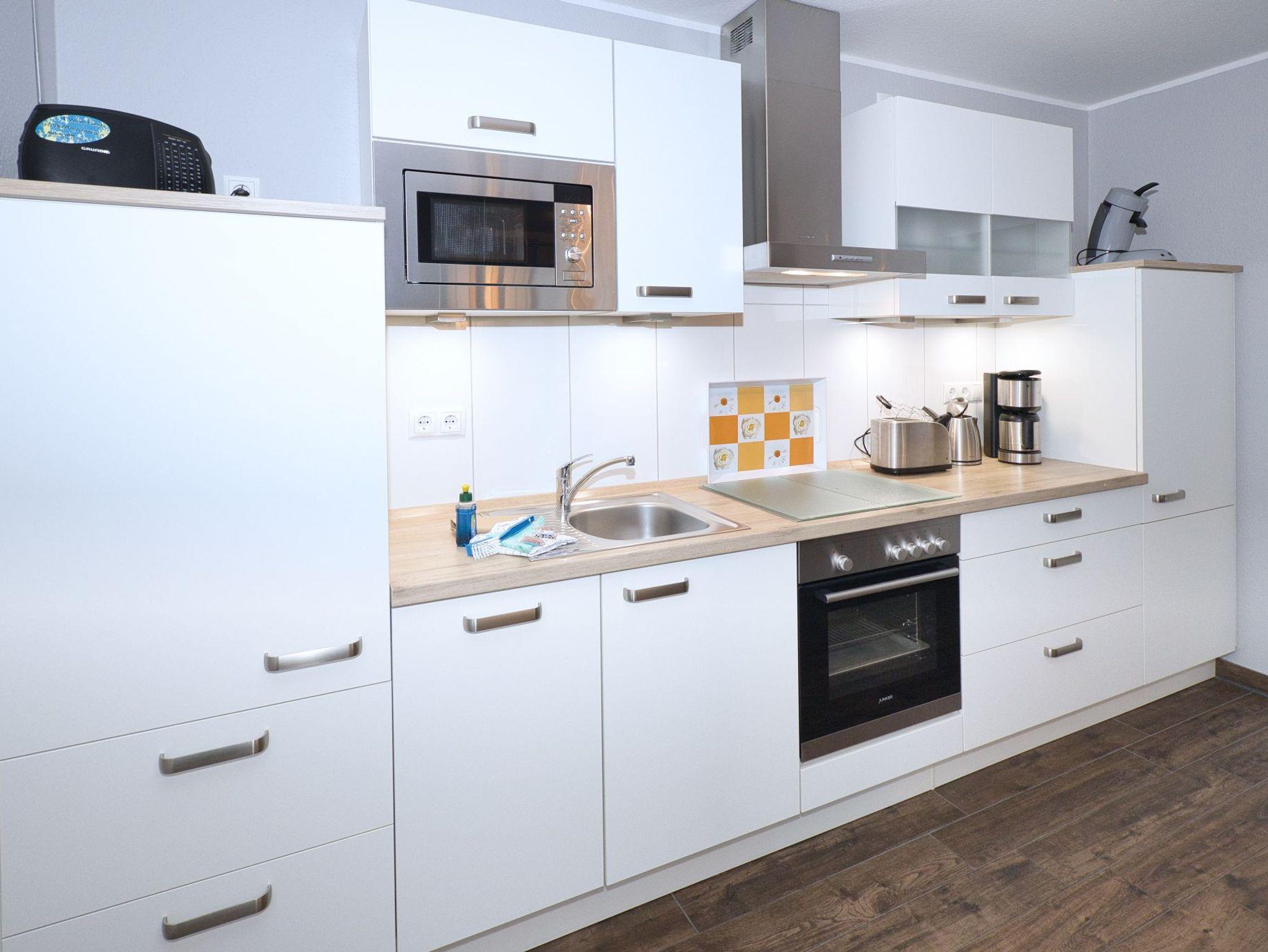 In der komfortablen, vollausgestatteten Einbauküche, die sich direkt am Fenster mit Seeblick im Wohnzimmer befindet, können Sie Ihre kulinarischen Fähigkeiten entfalten. Ein Esstisch lädt zum gemütlichen Beisammensein ein. Im Wohnbereich können Sie in einem Relaxsessel entspannen und sich von Radio, DVD-Player und Flachbildfernseher unterhalten lassen.