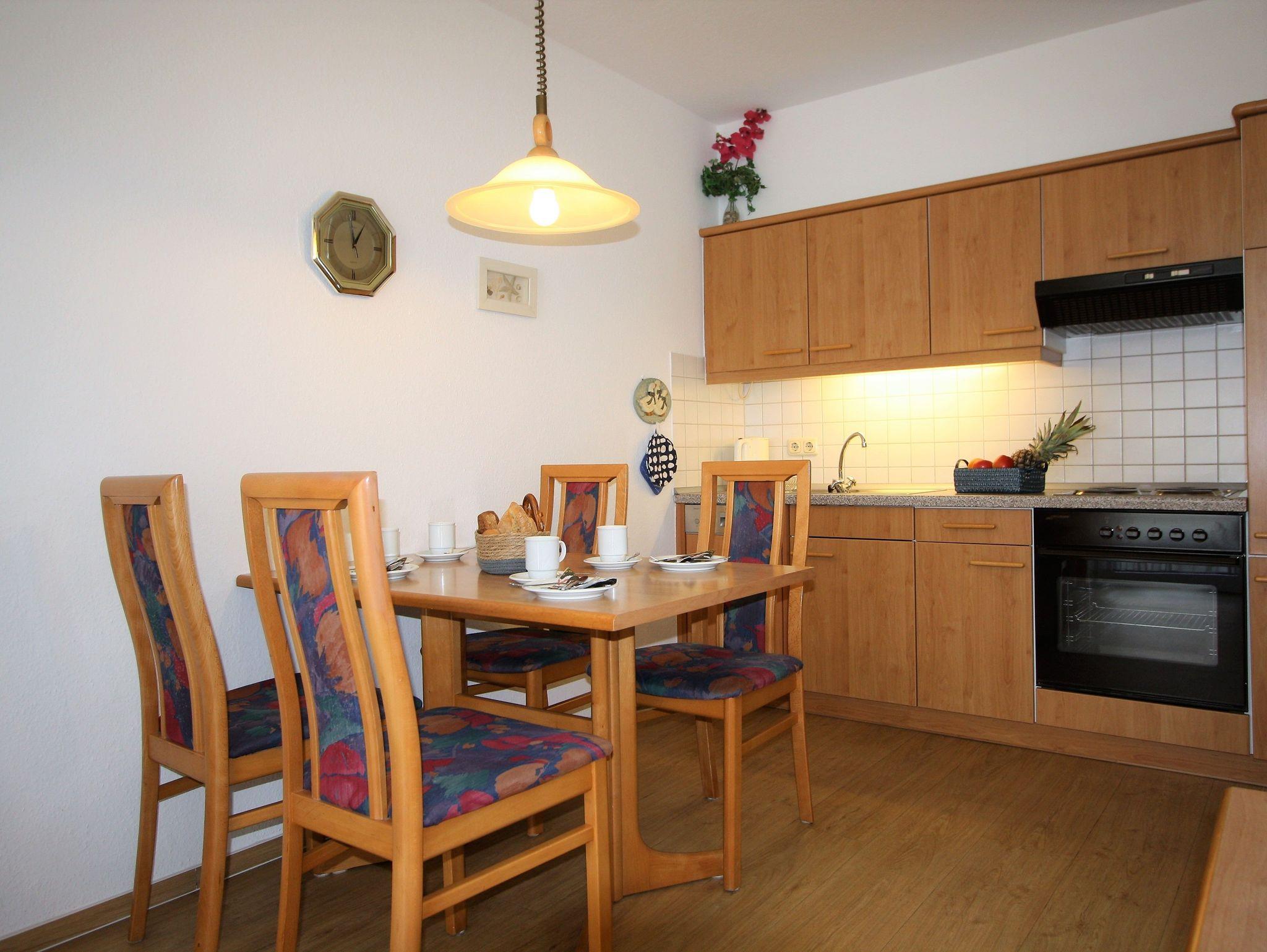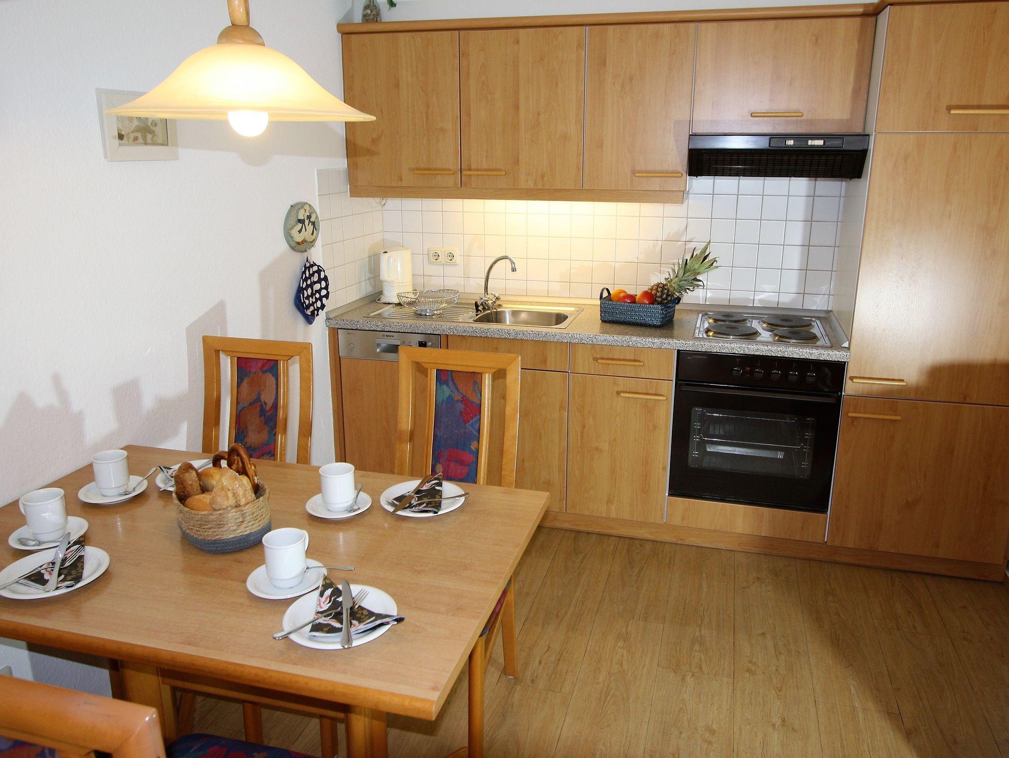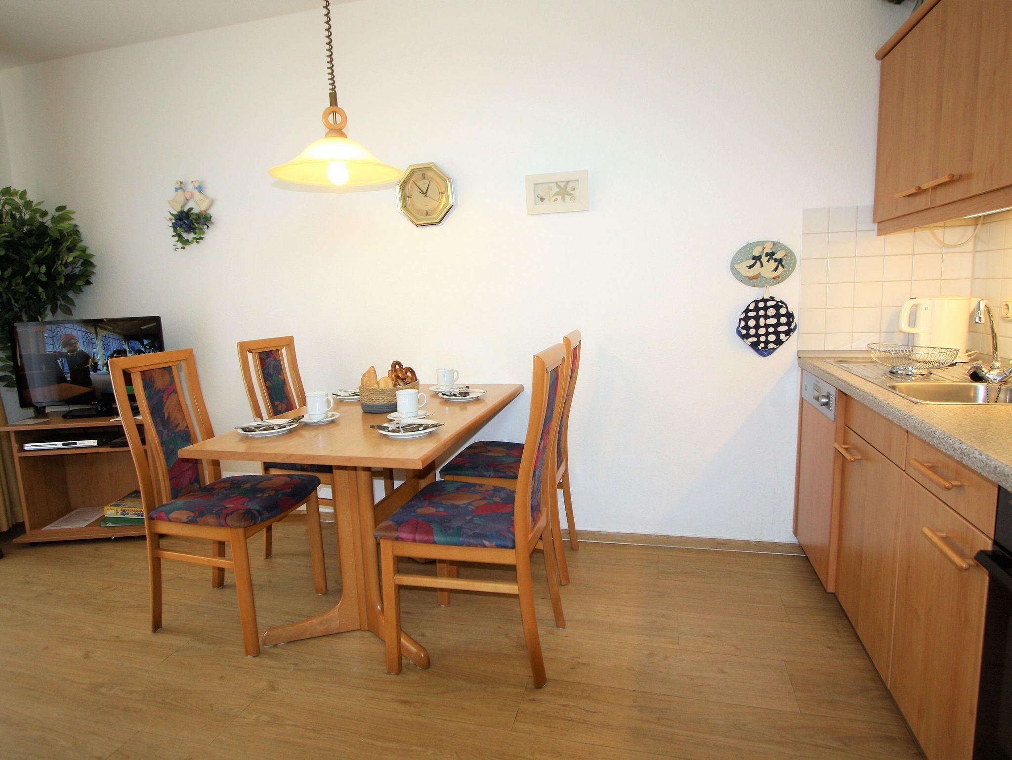 Sie wohnen in einem hellen 2-Zimmer-Appartement für bis zu 4 Personen auf 45 m² Wohnfläche im 1. Obergeschoss. Ein Schlafzimmer mit Doppelbett, Wohn-/Schlafraum mit bequemer Doppelbettcouch, separater Essplatz, voll ausgestatteter Küchenbereich mit Geschirrspüler, Dusche/WC mit Fön, Balkon, SAT-TV und Mini-HiFi-Anlage mit CD-Wechsler und Telefon.