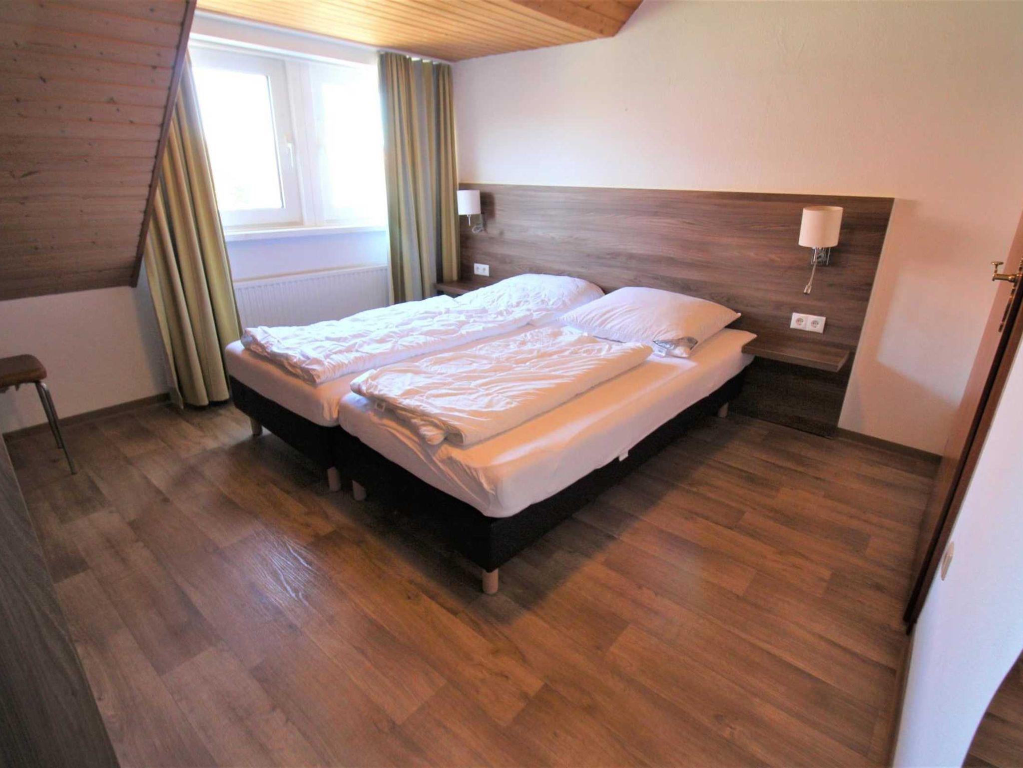 Oben: ein Schlafzimmer mit Doppelbett, Dusche/WC.