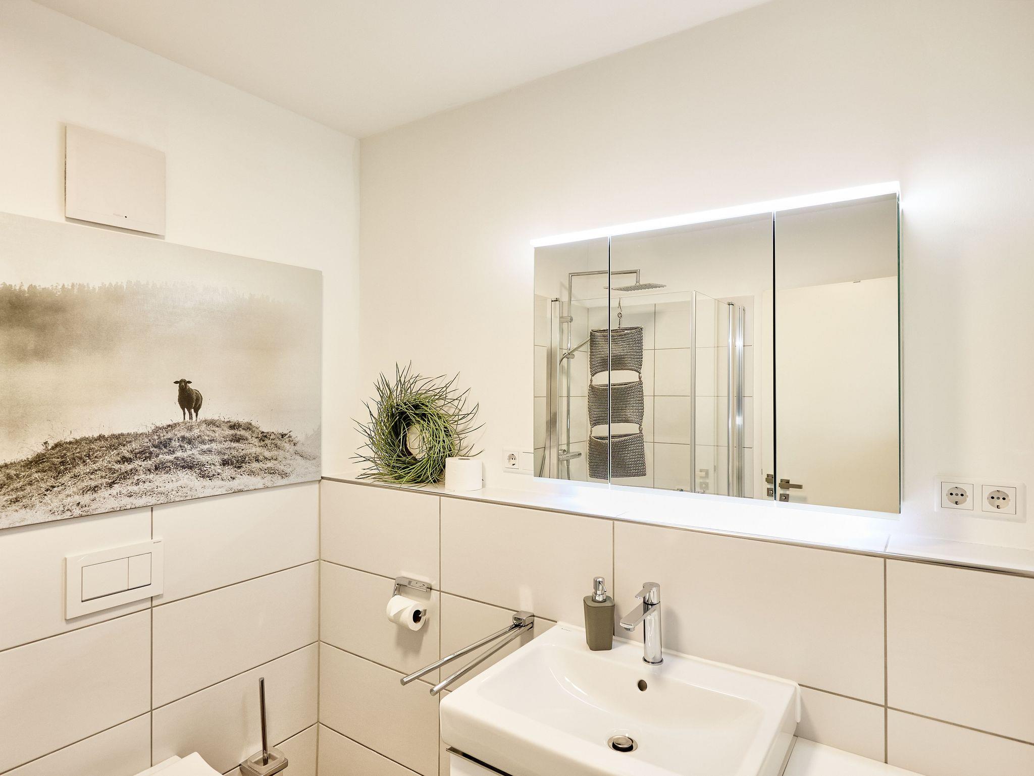 • Duschbad: Modernes Bad mit ebenerdiger Dusche, WC, Handtuchheizkörper