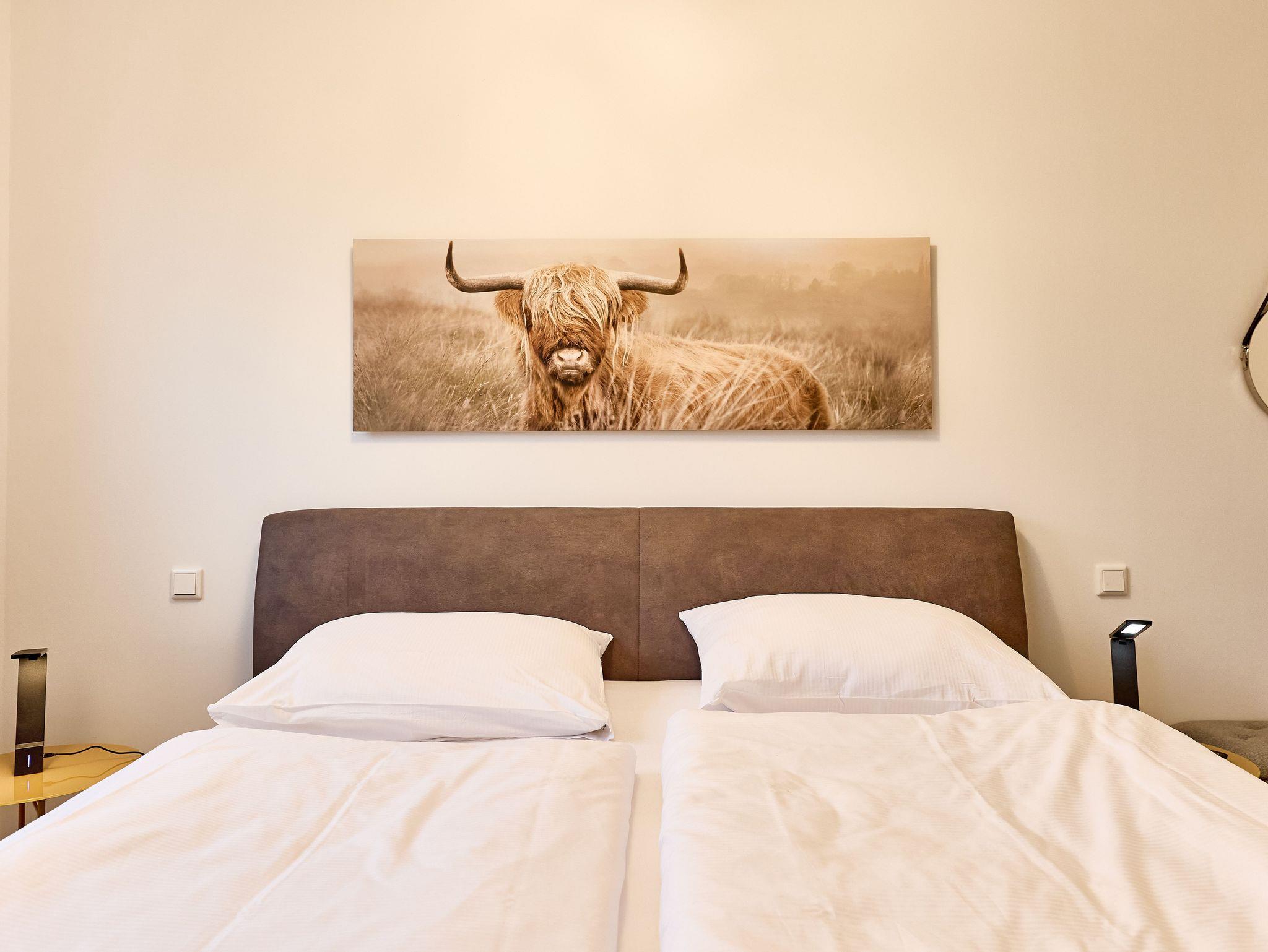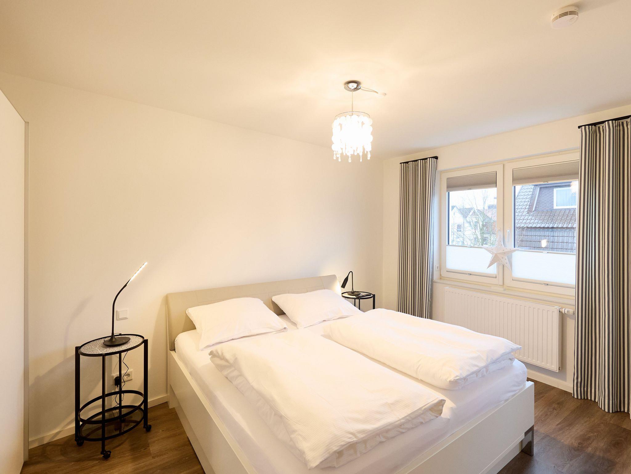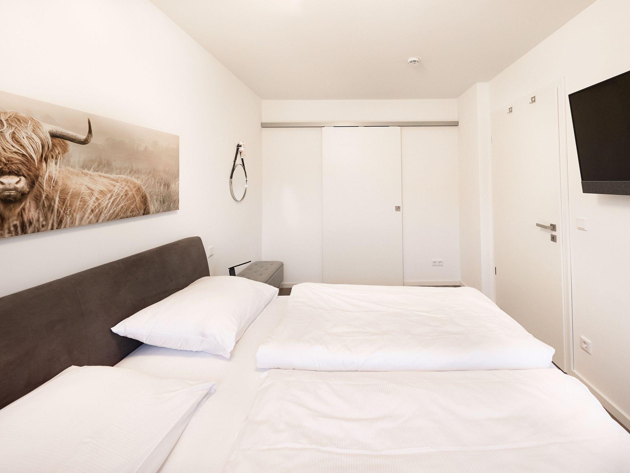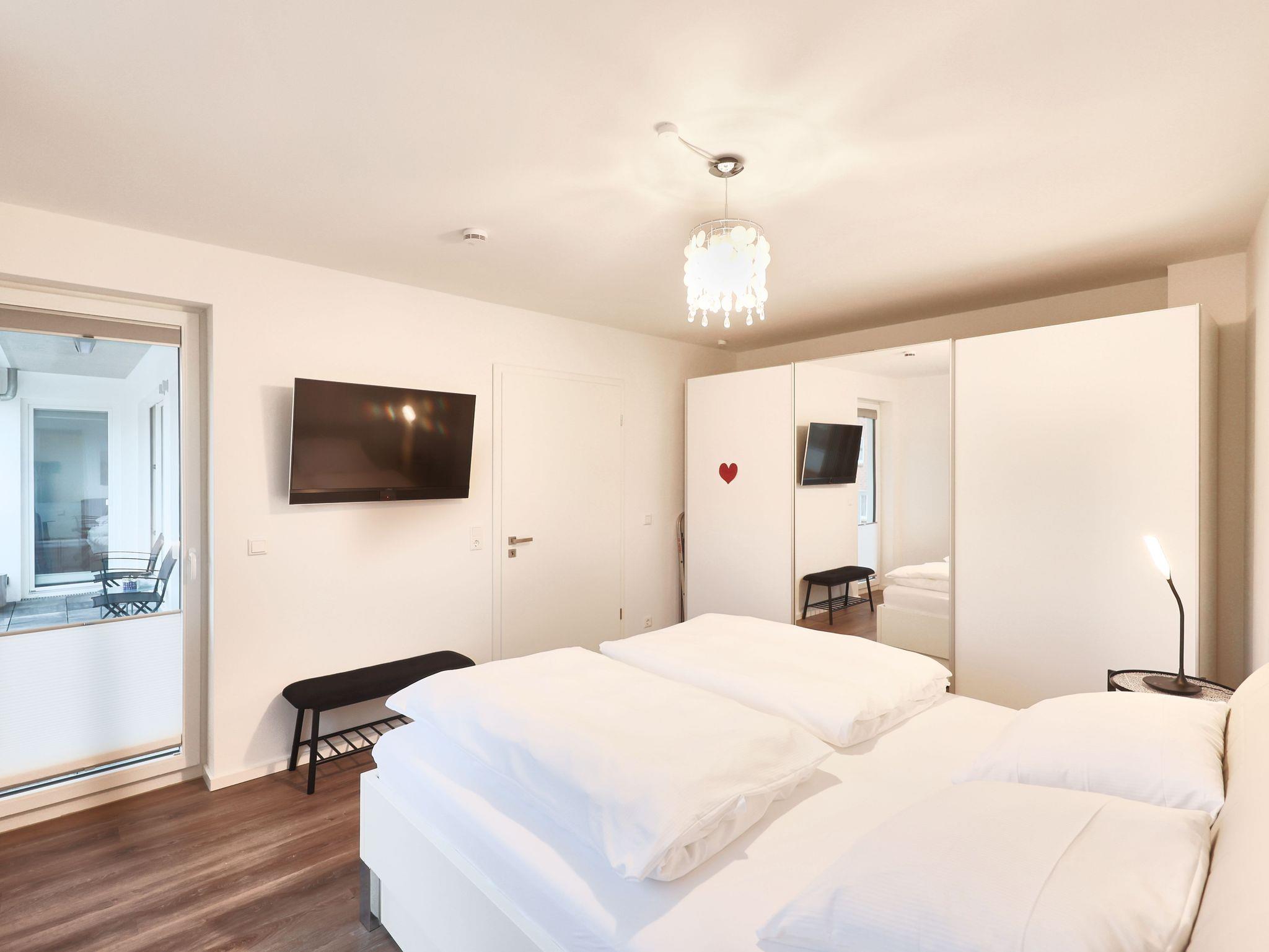 Die großzügige Wohnung bietet auf ca. 82 m² Platz für bis zu 4 Personen und umfasst zwei gemütliche Schlafzimmer. Das erste Schlafzimmer ist mit einem Doppelbett und einem begehbaren Kleiderschrank ausgestattet, während das zweite Schlafzimmer ebenfalls ein komfortables Doppelbett bietet. Beide Schlafzimmer haben direkten Zugang zum West-Balkon, von dem aus Sie den Abend bei einem atemberaubenden Blick ausklingen lassen können.