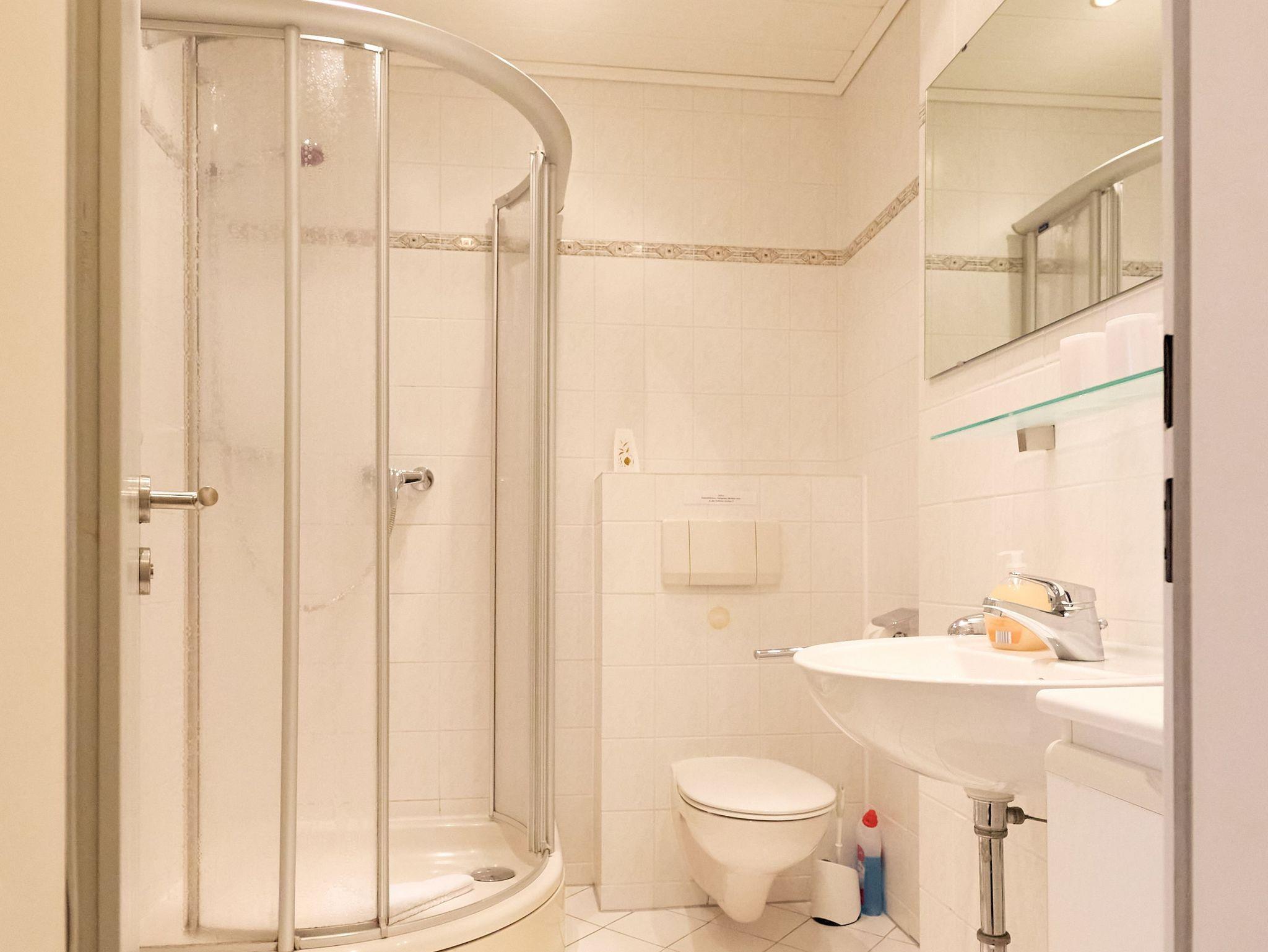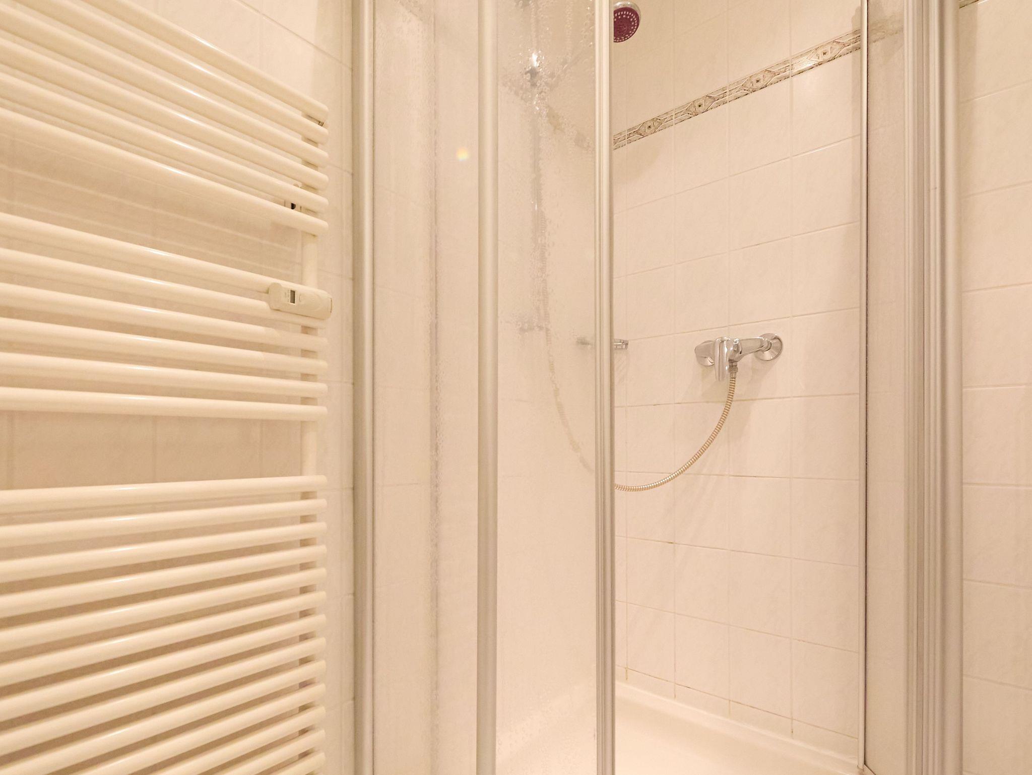 Das moderne Bad ist mit einer Eck-Runddusche, einem großen Handwaschbecken, Hänge-WC und mehreren Ablageschränken ausgestattet. Die hochwertige Fliesenverkleidung an Wänden und Fußboden verleiht dem Raum eine angenehme Atmosphäre. Der Heizkörper dient gleichzeitig als Handtuchtrockner.