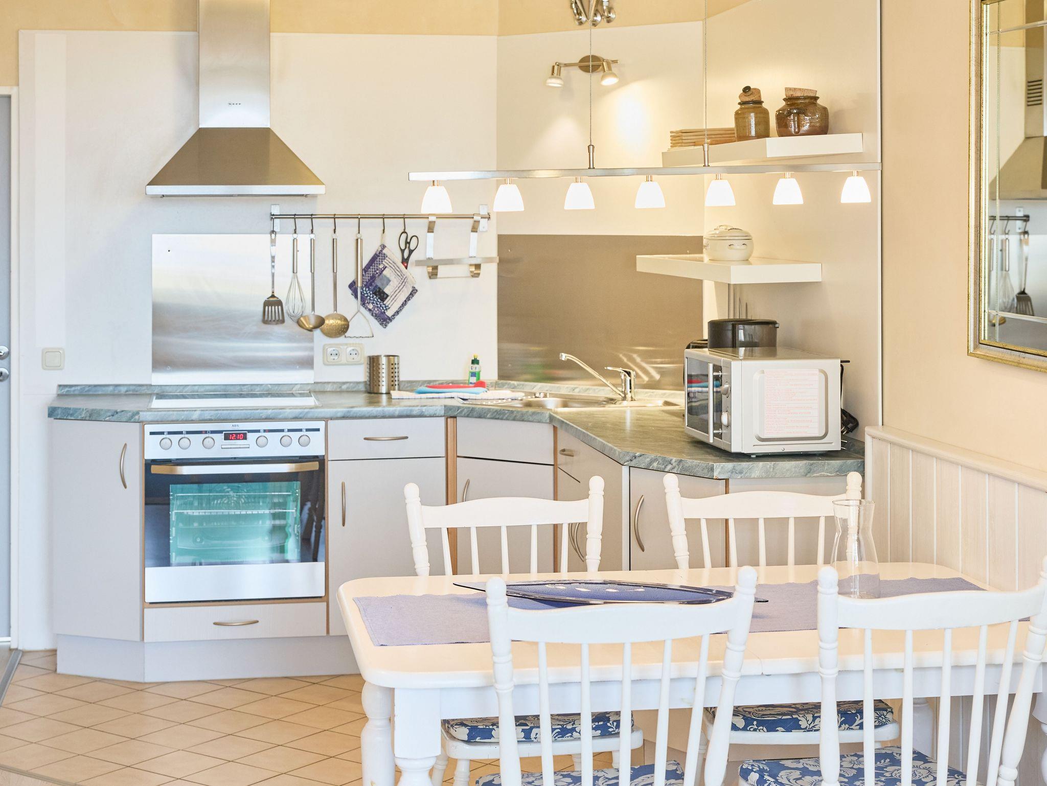 Die gemütliche Couchgarnitur mit einem Sofa und zwei Sesseln lädt zum Entspannen, Fernsehen, Lesen, Spielen oder einfach nur zum Aus-dem-Fenster-Schauen ein. Der Essbereich, mit einem ausziehbaren Esstisch und fünf Stühlen, bietet Platz für die ganze Familie. Der Kochbereich in der großzügigen Einbauküche über Eck im Holzdekor verfügt über einen Ceranfeld-Herd, Backofen, teilweise Dunstabzugshaube, Kühlschrank und Edelstahlspüle. Das Kochen macht hier selbst im Urlaub Spaß, dank der vielen praktischen Ausstattungsgegenstände.