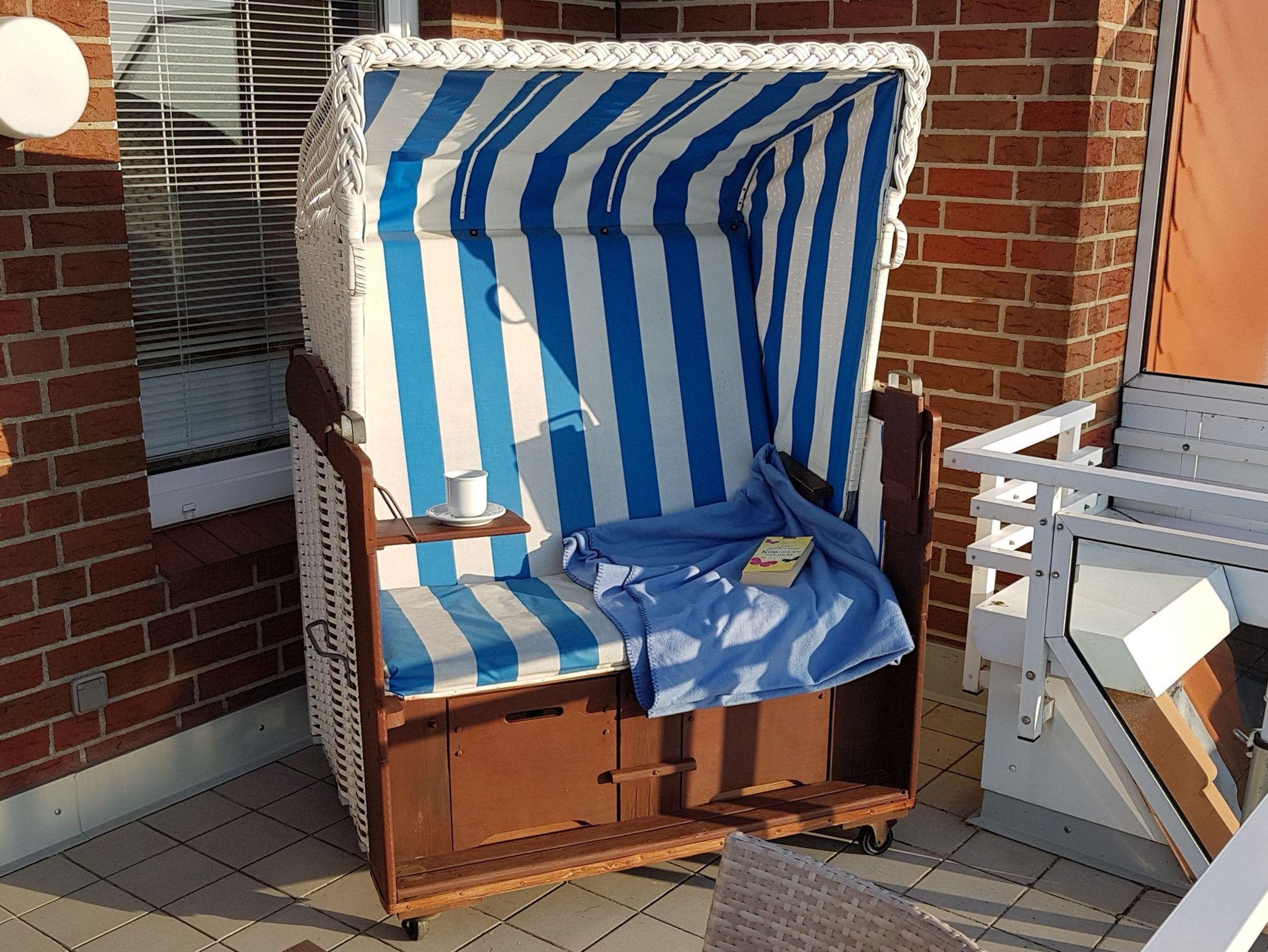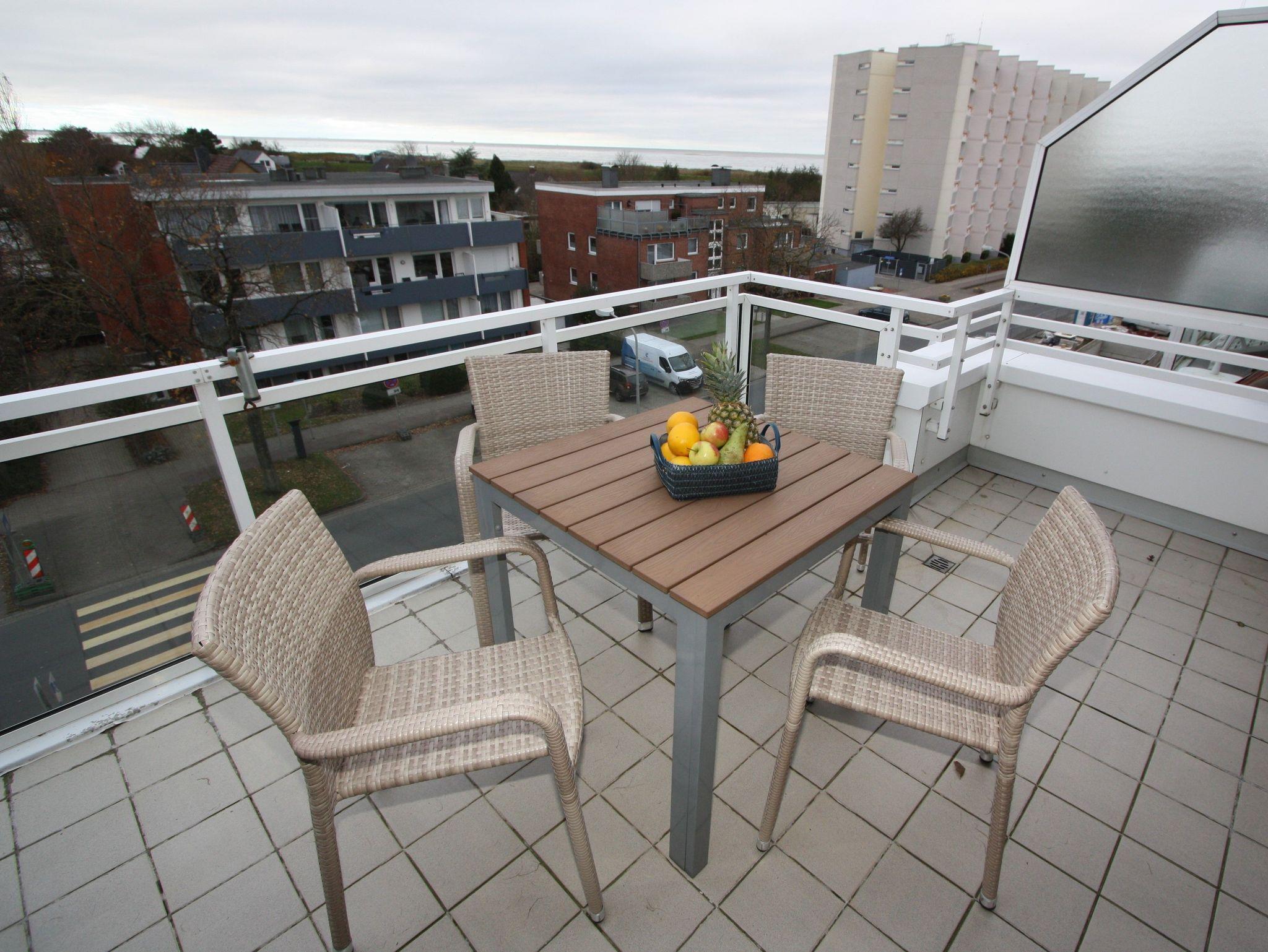 Vom Wohnzimmer geht es auf die große Dachterrassemit Strandkorb. Durch die optimale Anordnung der Dachterrassen in der Residenz Albatros können Sie hier schon ab dem späten Vormittag in der Sonne frühstücken.