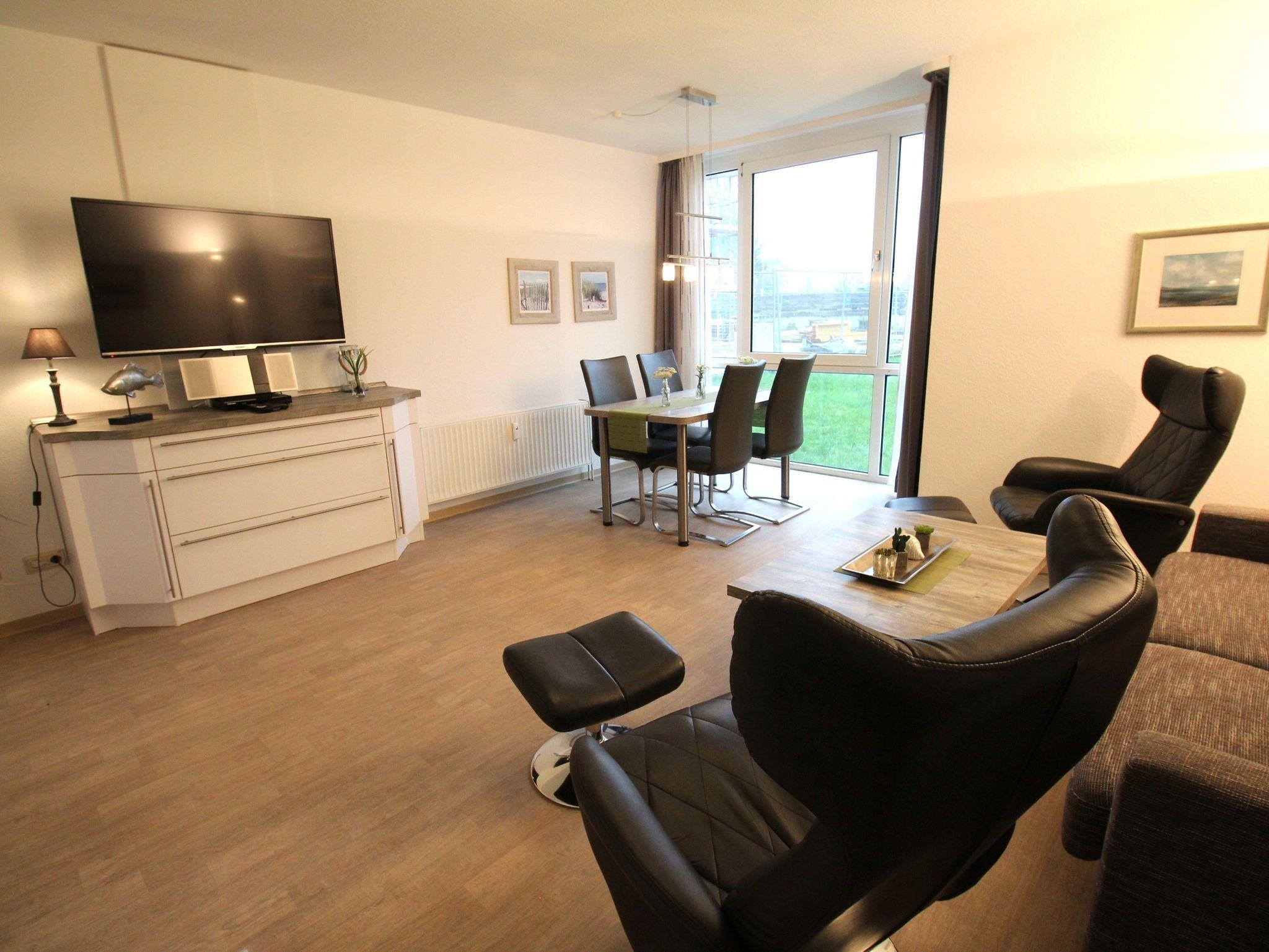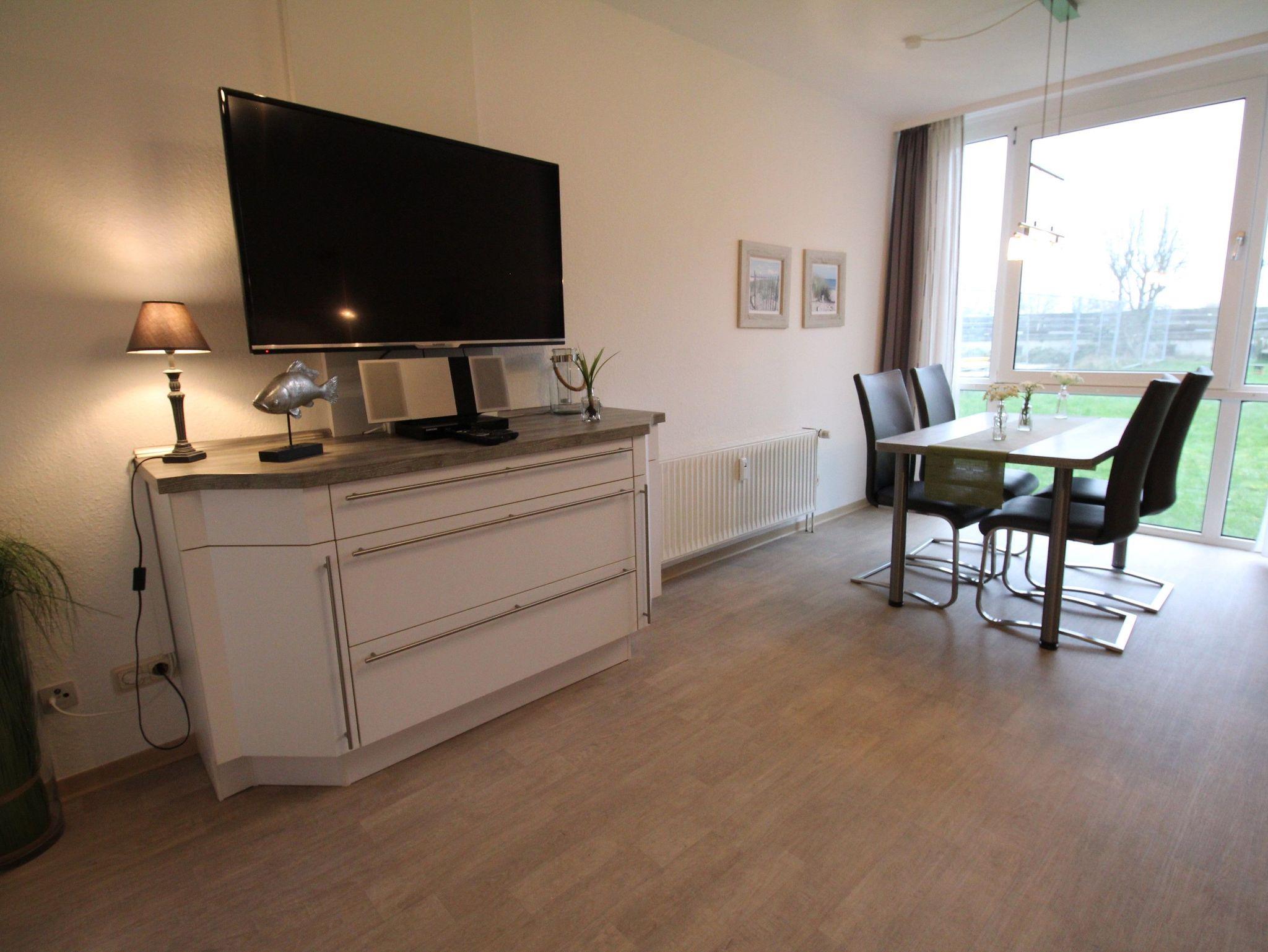 Im gemütlichen Wohnraum, mit bequemer Doppelbettcouch (150 cm x 200 cm) und den modernen Relaxsesseln genießen Sie entspannte Fernsehmomente mit Blick auf das komfortable TV (49 Zoll). Vom Essplatz aus, durch die große Fensterfront, haben Sie Blick auf Garten und Deich