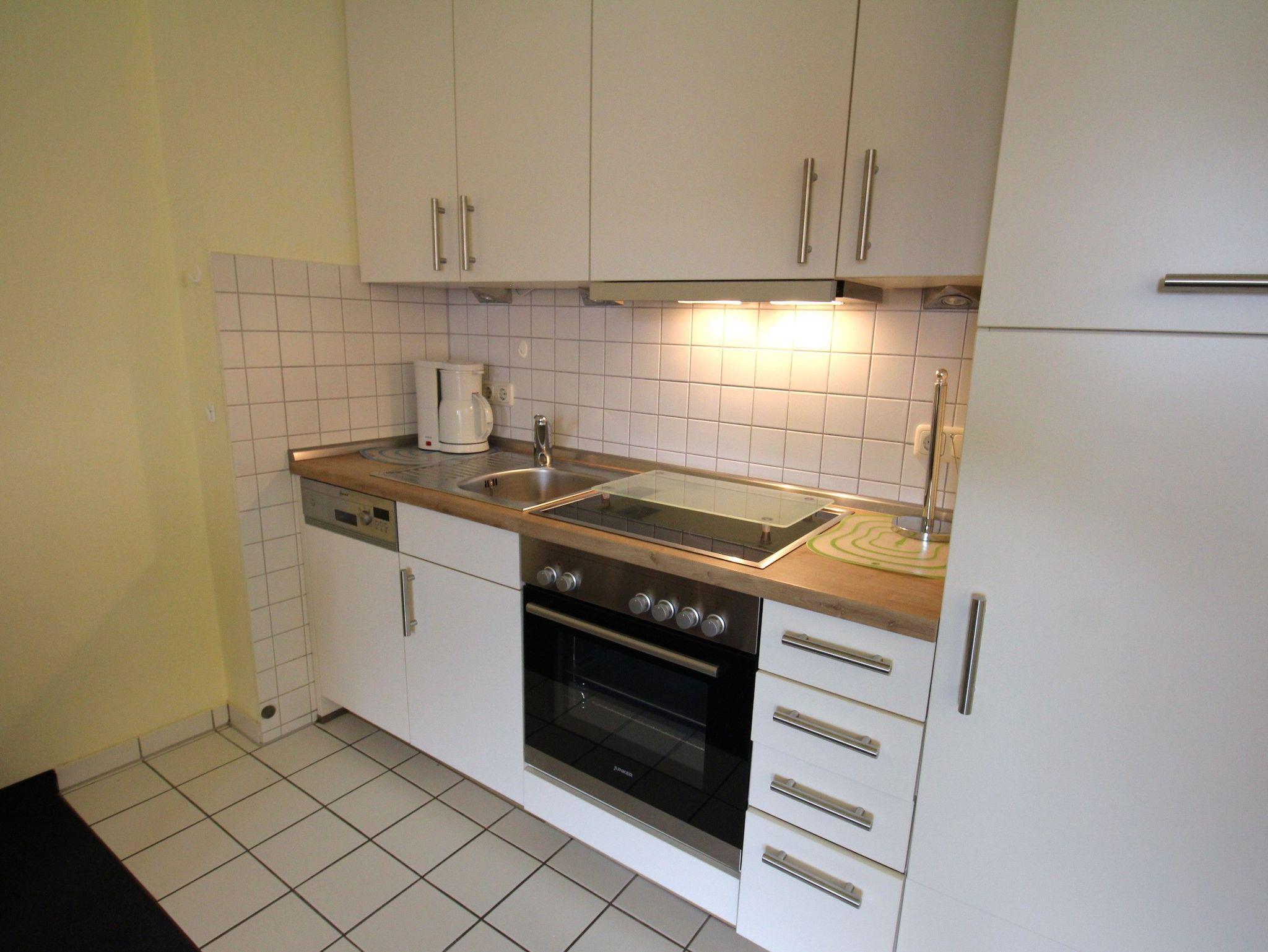 • Eine Einbauküche mit Backofen, Ceranfeld, Kaffeemaschine mit Thermoskanne, Mikrowelle mit Grillfunktion, höher gelegten Kühlschrank mit Gefrierfach, leiser Geschirrspülmaschine und ausreichend Kaffee- und Essgeschirr, sowie Töpfe und Pfannen