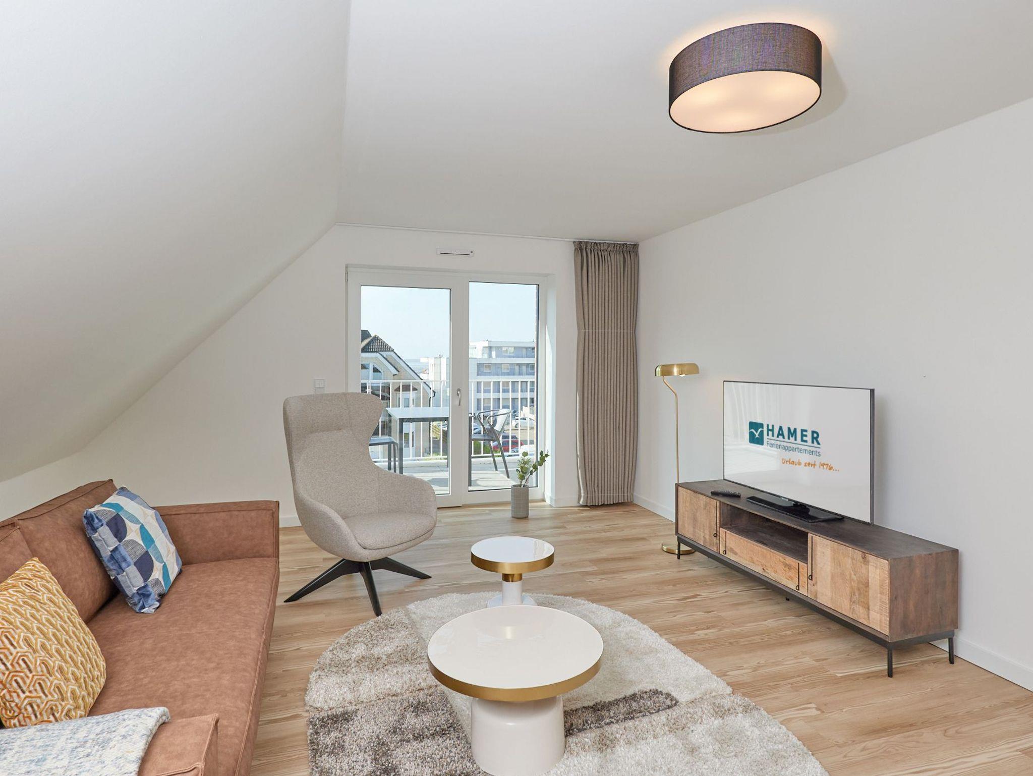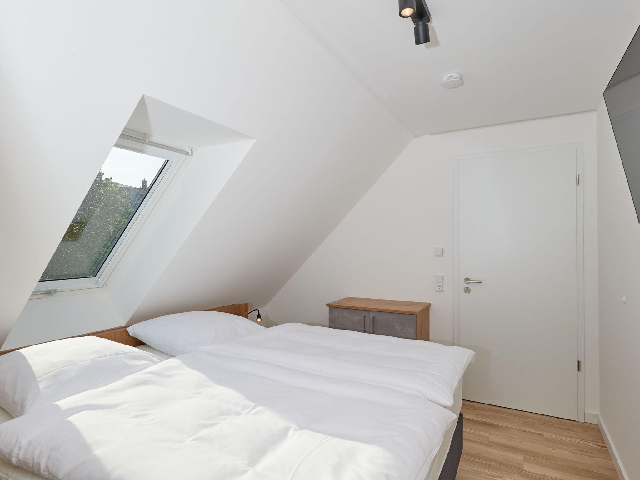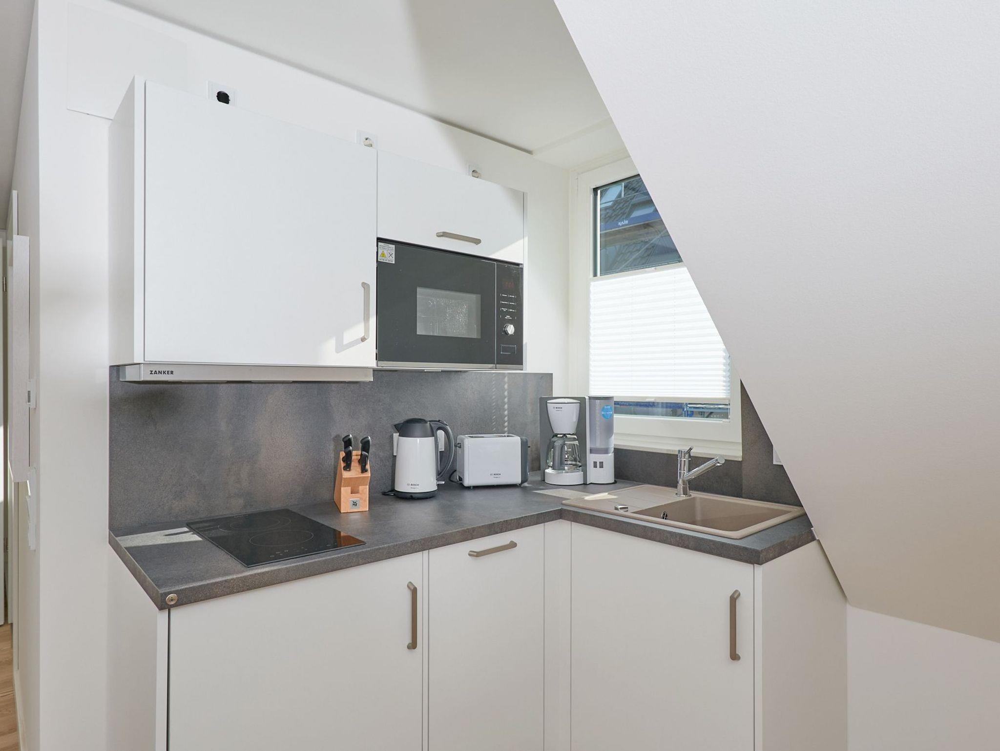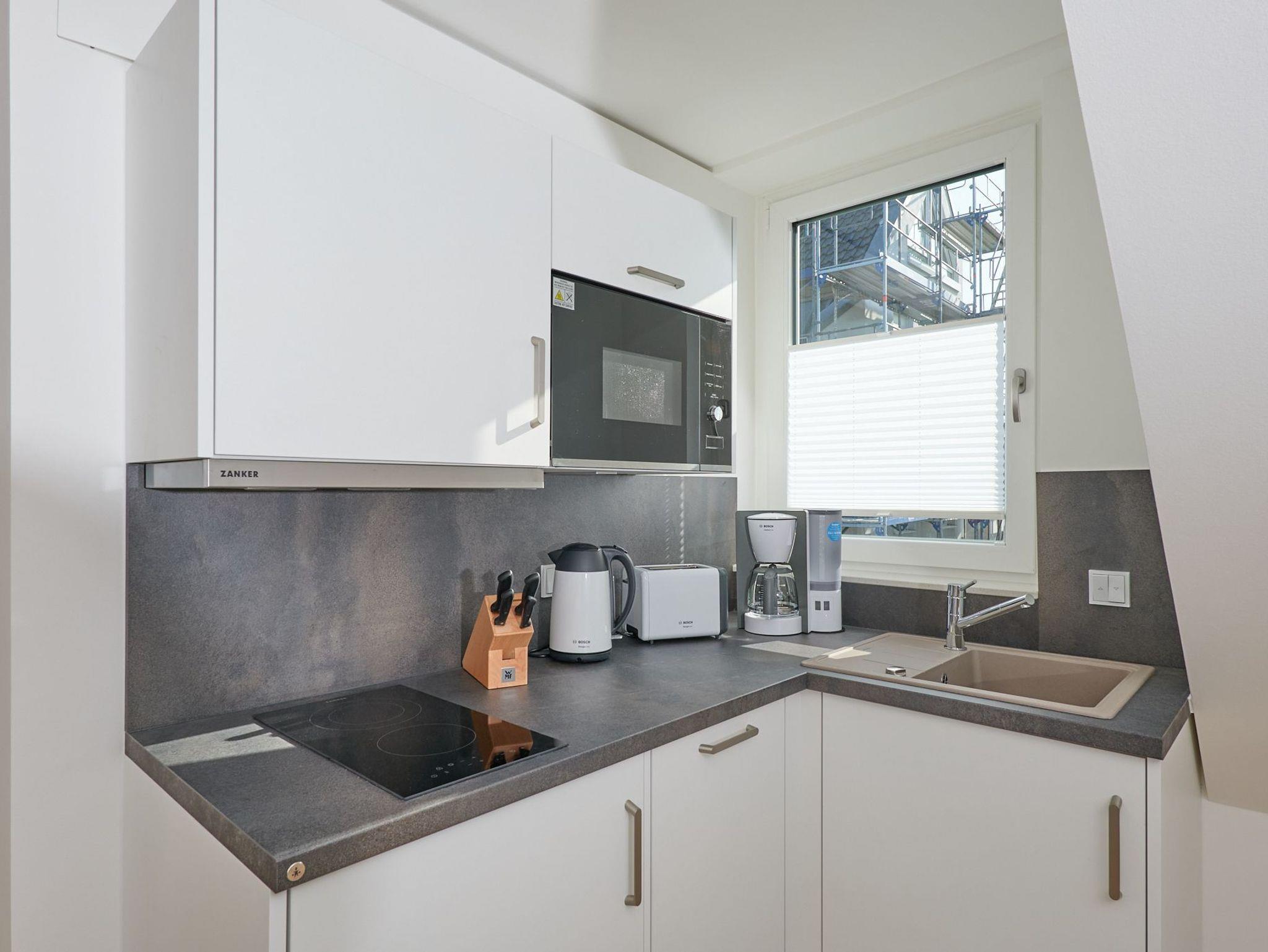 Neubau Mai 2023! Sehr schöne, moderne 2-Raum-Wohnung bis 2 Pers. voll ausgestattet auf ca. 49 m² in der 3.Etage gelegen, 1 Schlafzimmer mit komfortablen Doppelbett (Bettwäsche inkl.) und Außenjalousien an allen Fenstern (Veluxfenster mit Rollo innen), ebenerdige Dusche/WC, Wohnzimmer mit Küchenzeile (2 Platte, Mikrowelle/Backkombi, Geschirrspüler) 2x Kabel-TV, Radio, kostenfreies W-LAN-Internet, großer Balkon mit Teilseesicht (nord/west), beide Zimmer mit Dachschrägen, Personenaufzug, die Wohnung ist barrierefrei erreichbar, reservierter Pkw-Stellplatz in der Tiefgarage inkl., es sind keine Haustiere erlaubt und natürlich Nichtraucher. Durchfahrtshöhe Tiefgarage: 2,05m.