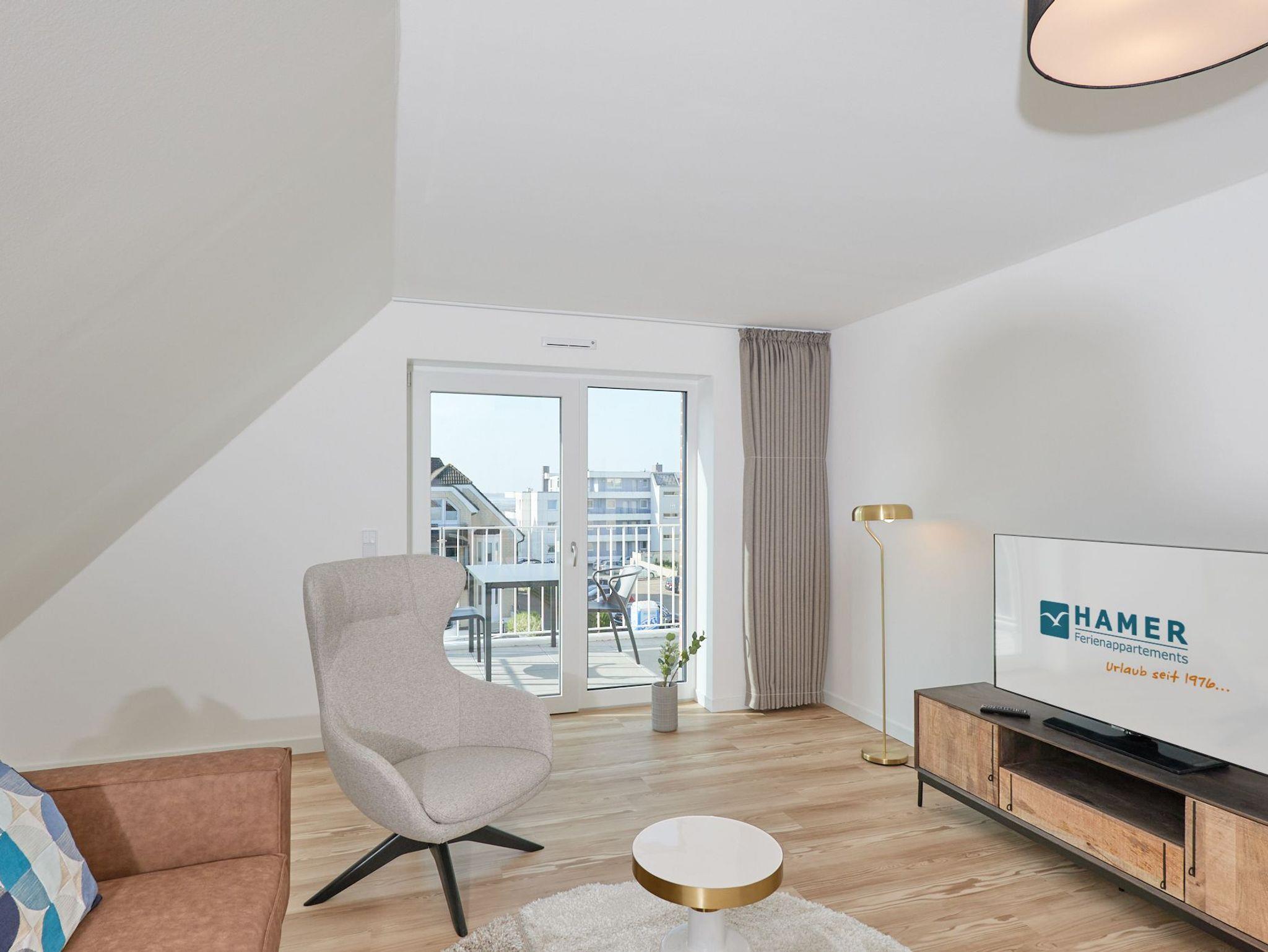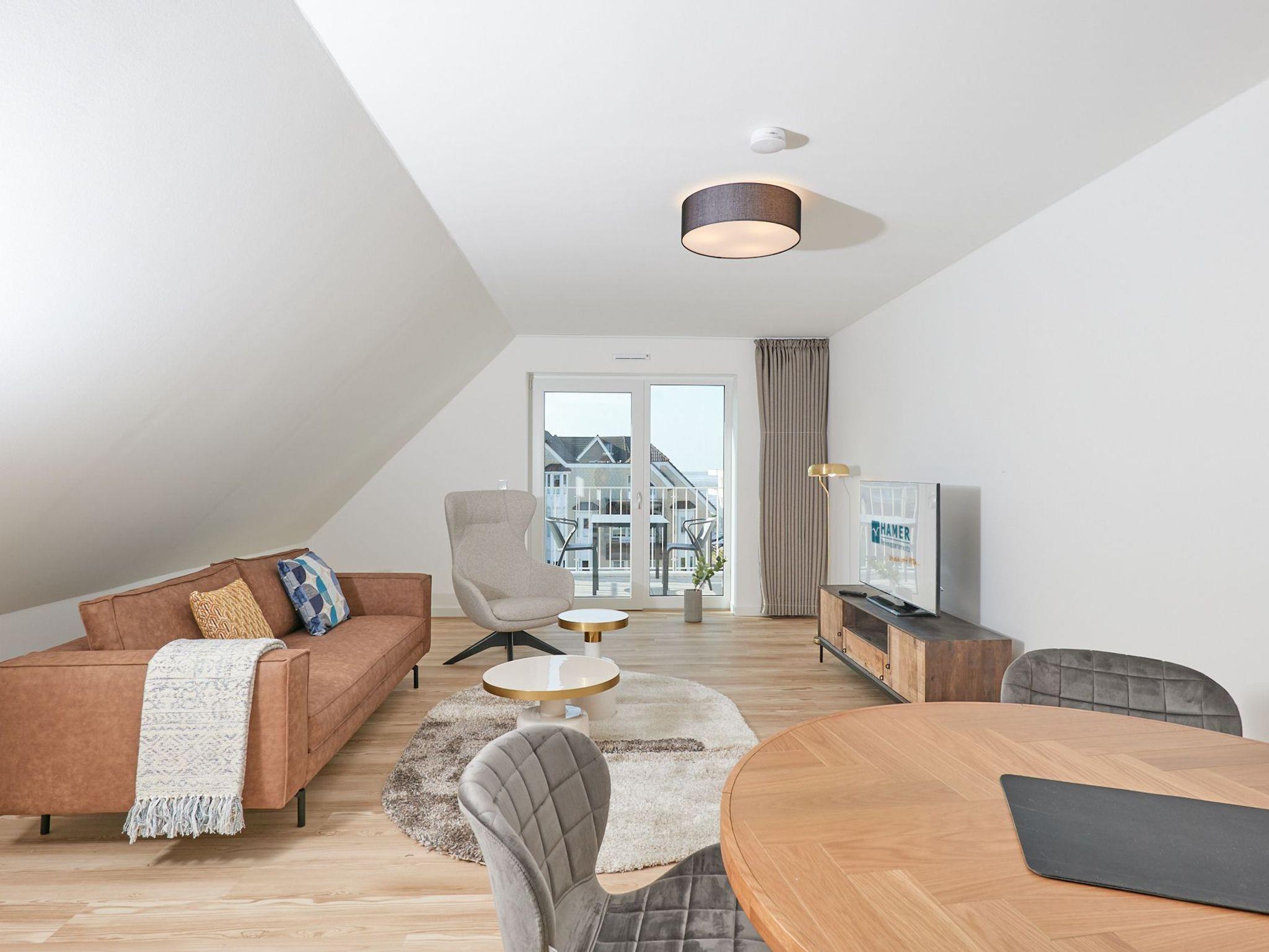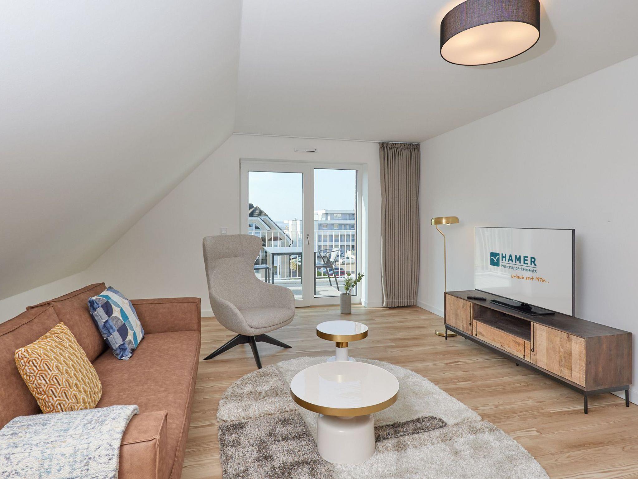 Neubau Mai 2023! Sehr schöne, moderne 2-Raum-Wohnung bis 2 Pers. voll ausgestattet auf ca. 49 m² in der 3.Etage gelegen, 1 Schlafzimmer mit komfortablen Doppelbett (Bettwäsche inkl.) und Außenjalousien an allen Fenstern (Veluxfenster mit Rollo innen), ebenerdige Dusche/WC, Wohnzimmer mit Küchenzeile (2 Platte, Mikrowelle/Backkombi, Geschirrspüler) 2x Kabel-TV, Radio, kostenfreies W-LAN-Internet, großer Balkon mit Teilseesicht (nord/west), beide Zimmer mit Dachschrägen, Personenaufzug, die Wohnung ist barrierefrei erreichbar, reservierter Pkw-Stellplatz in der Tiefgarage inkl., es sind keine Haustiere erlaubt und natürlich Nichtraucher. Durchfahrtshöhe Tiefgarage: 2,05m.