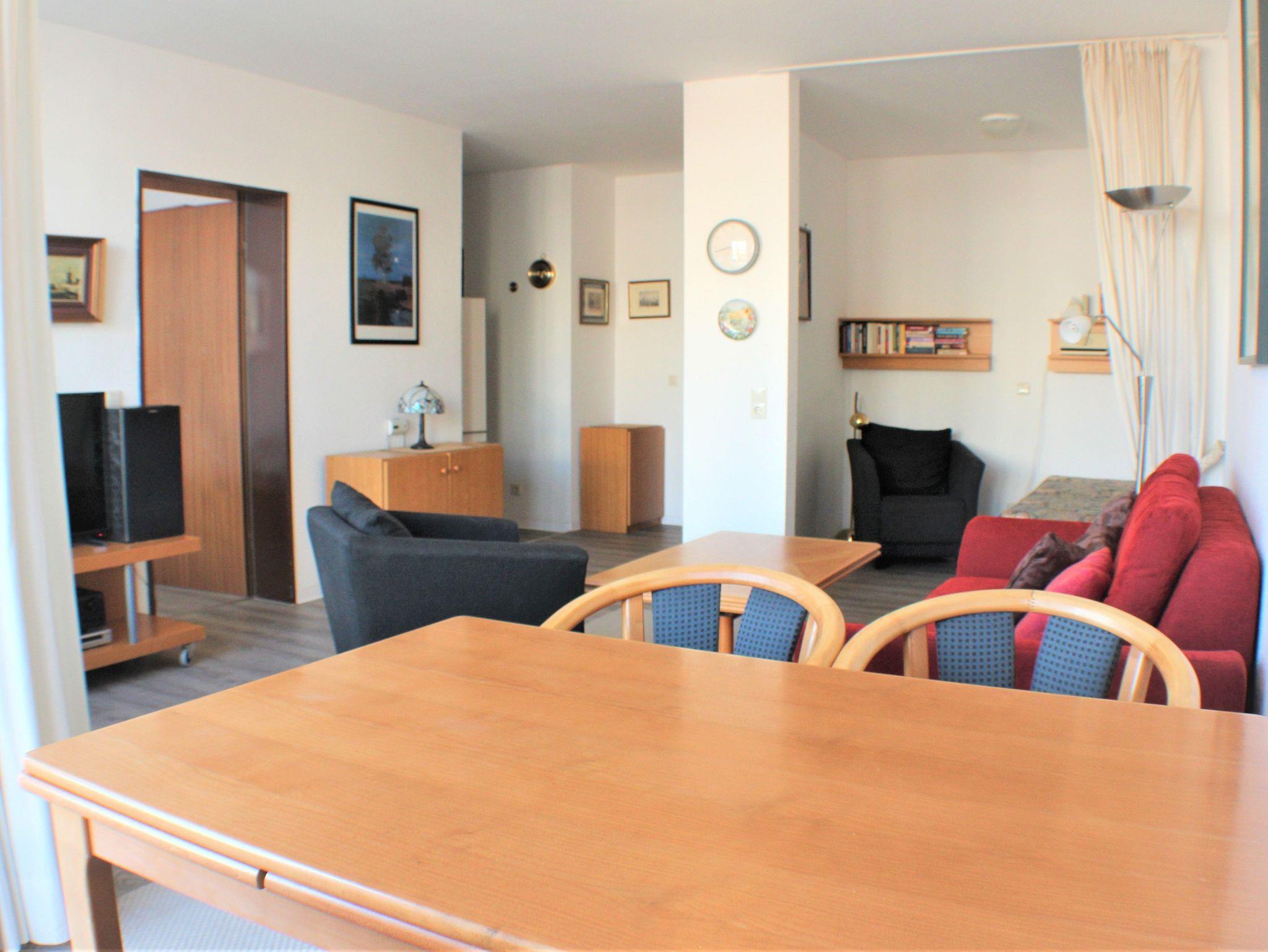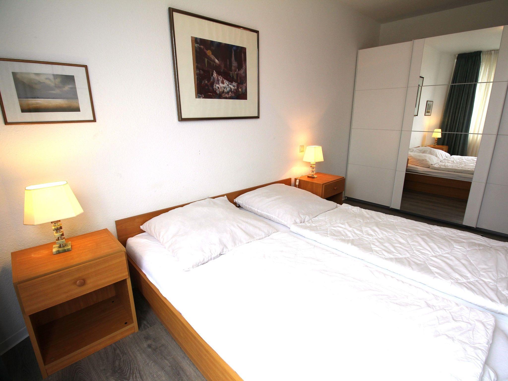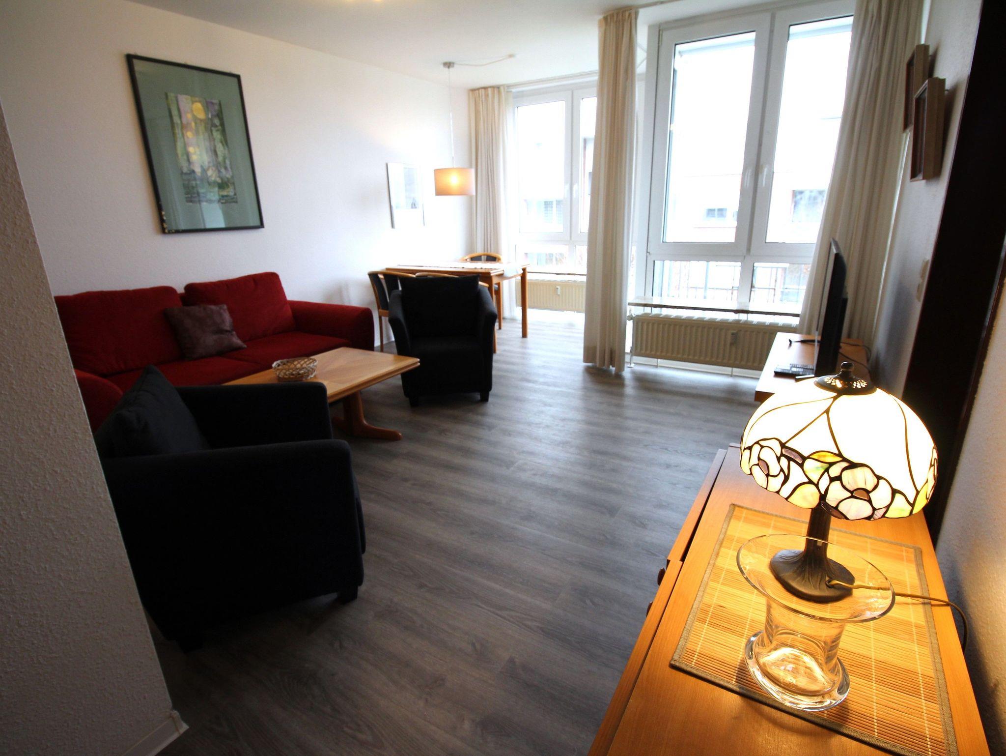Sie wohnen in einem großzügigem 2-Zimmer-Appartement für bis zu 5 Personen auf 57 m² Wohnfläche. Ein Schlafzimmer mit Doppelbett (180 cm x 200 cm, durchgängige Matratze), großer heller Wohn-/Schlafraum mit bequemer Bettcouch, offene Schlafnische mit Einzelbett, heller separater Essplatz, voll ausgestatteter Küchenbereich mit Mikrowelle, Dusche/WC, Balkon, SAT-TV, Telefon und Aussenstellplatz für PKW.