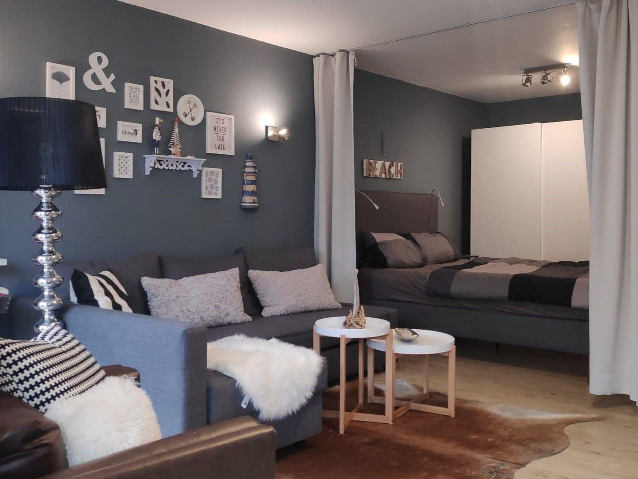 1-Zimmer-Appartement für 1 bis 3 Personen mit ca. 37 m². Großzügiger Wohn-Schlafraum mit zwei Betten bzw. einem Doppelbett in der Schlafnische, getrennt vom Wohnbereich durch einen Raumteiler. Separater Essplatz im Erker und voll ausgestatteter Küchenbereich. Bad mit Dusche/WC. WLAN und PKW-Stellplatz vorhanden.