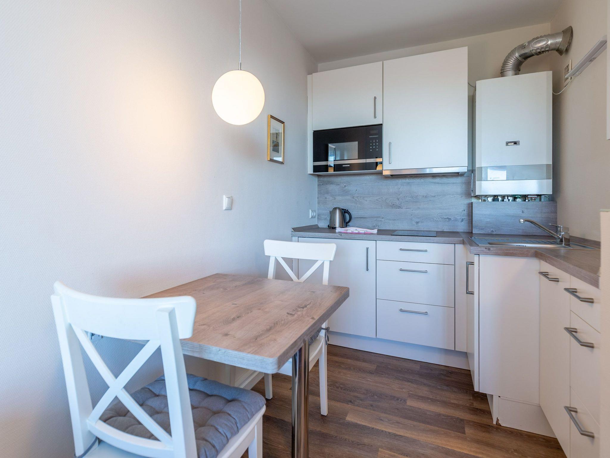 Die 32 m² Ferienwohnung bietet ausreichend Platz für 2 Personen. Der kombinierte Wohn- und Schlafbereich ist mit einem komfortablem Doppelbett ausgestattet. Ein Sofa lädt zum Verweilen ein. Währenddessen sorgen kostenloses WLAN und ein Flachbild-TV für beste Unterhaltung. Die integrierte Küche ist mit einem 2-Zonen Cerankochfeld, einer Mikrowelle, einer Spülmaschine sowie einem Kühlschrank mit Gefrierfach ausgestattet. Zudem lädt ein verglaster Balkon auch bei Wind und Wetter zum Verweilen ein. Die Verglasung des Balkons lässt sich auf Wunsch jederzeit öffnen. Ferienwohnung 513 verfügt über ein Bad mit Dusche und WC. Der Wohnung ist ein KFZ-Stellplatz zugeordnet.