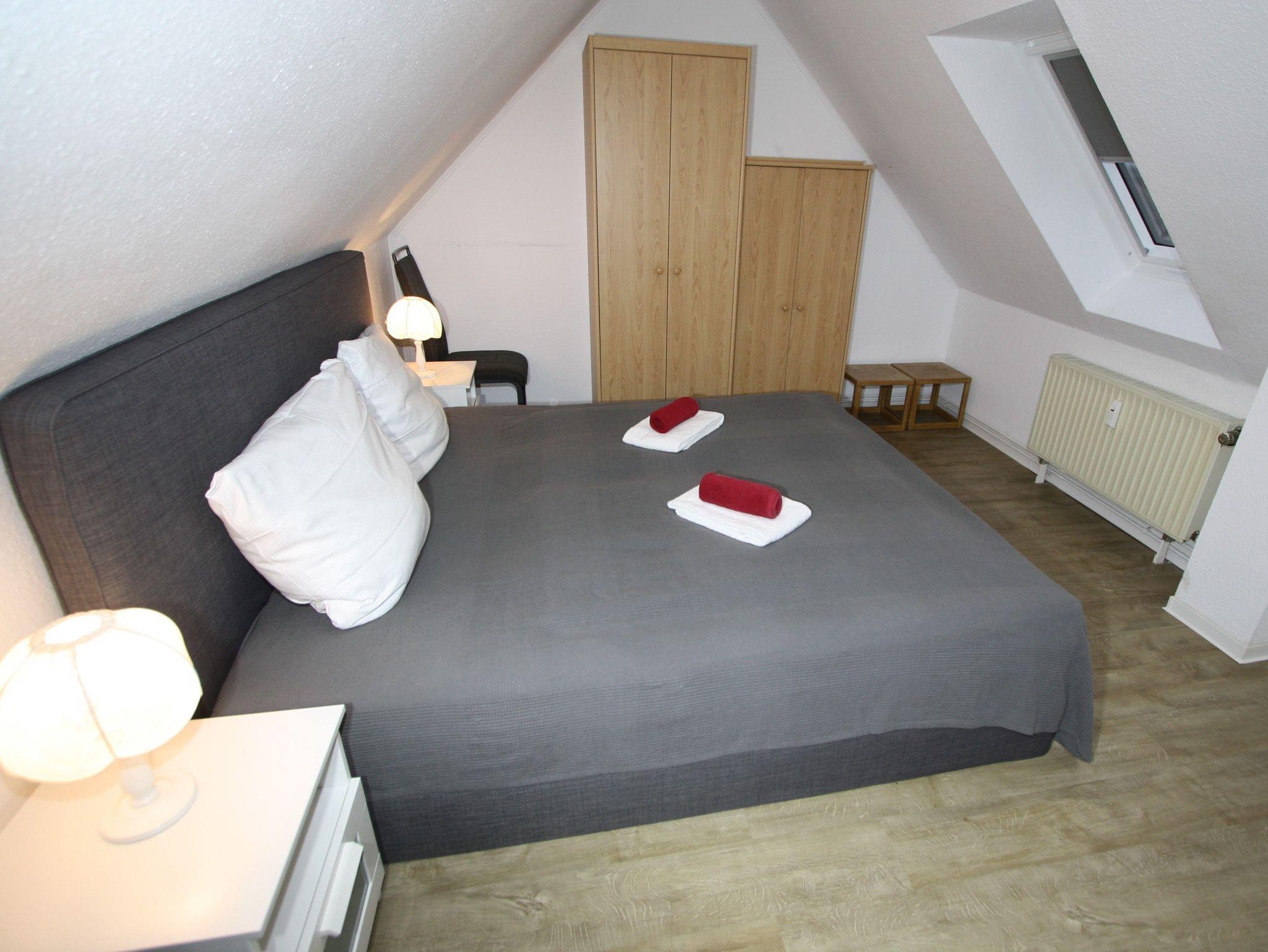 Schlafraum mit Doppelbett, ein Schlafraum im Spitzboden mit Doppelbett (einteilige Matratze) sowie