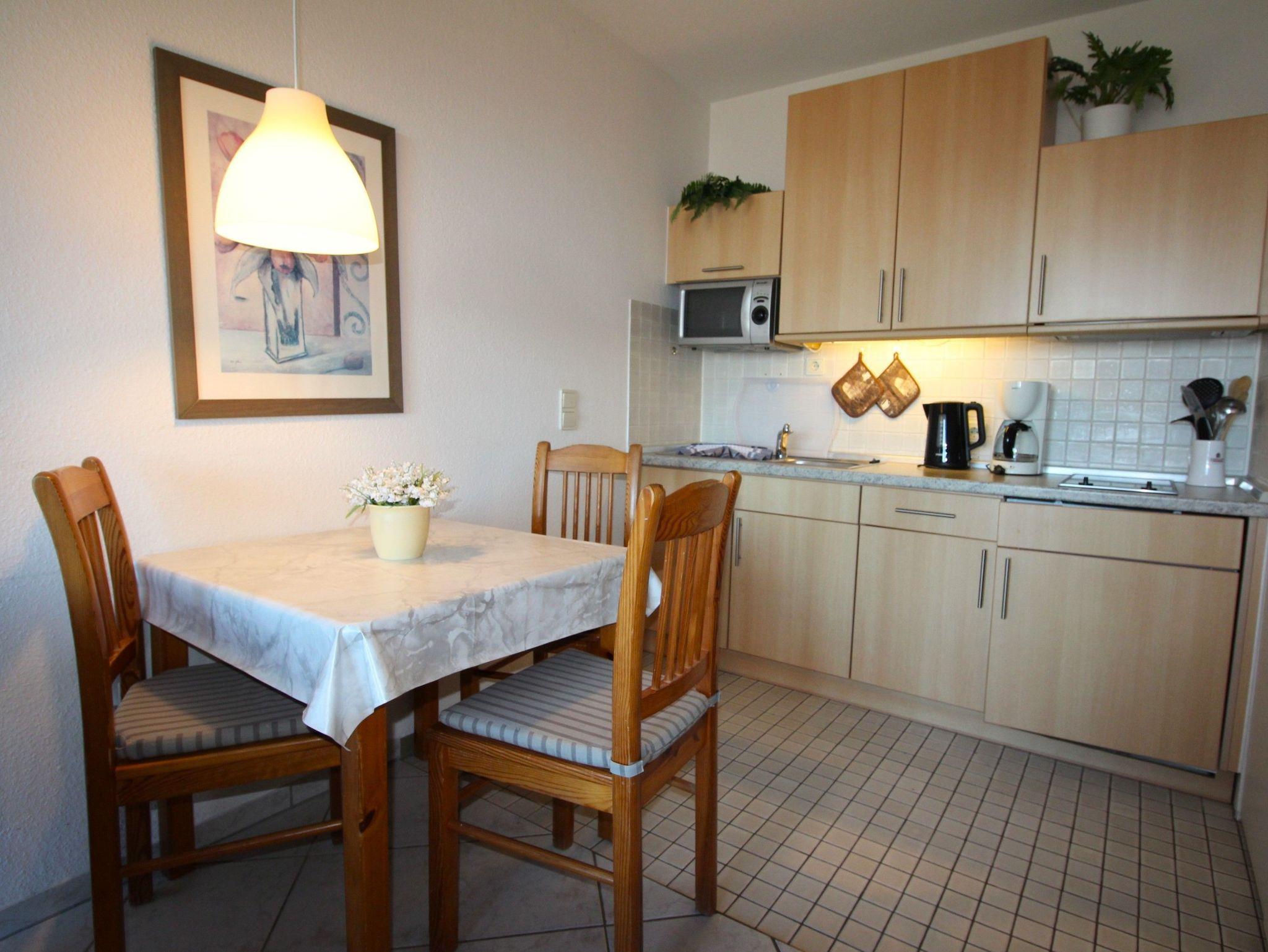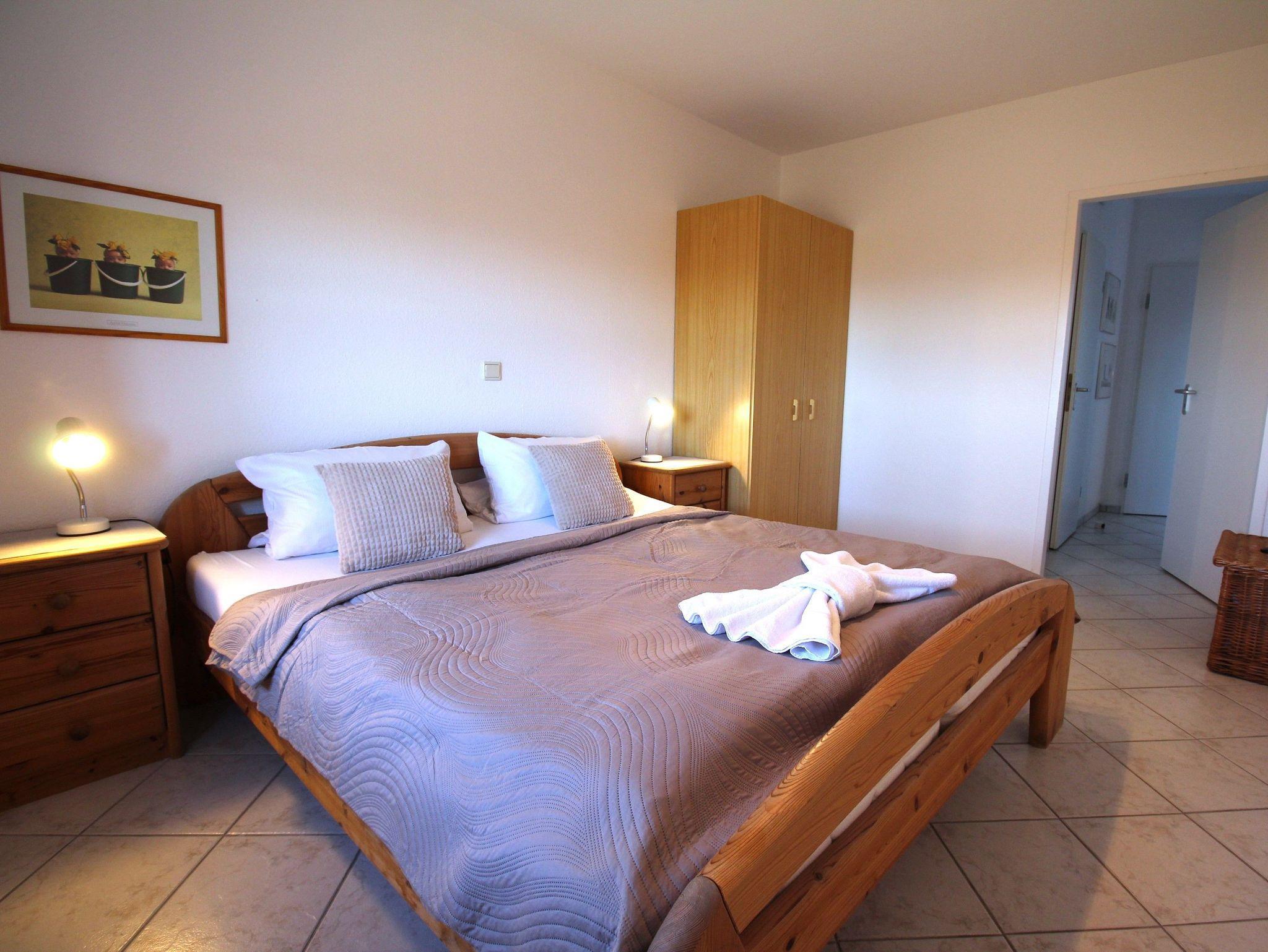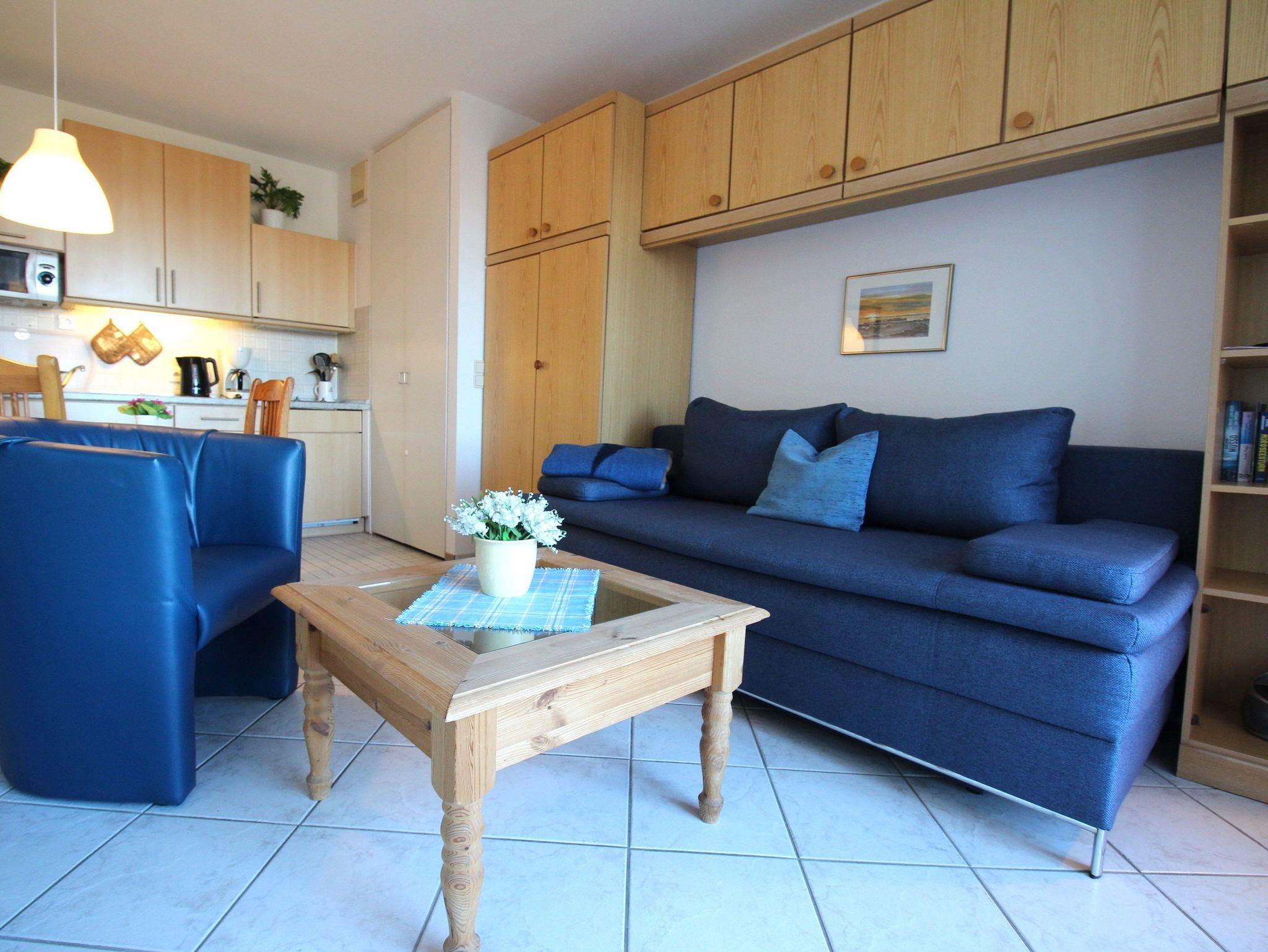 Willkommen in Ihrer Ferienwohnung mit Meerblick. Das gemütliche Apartment verfügt über einen Wohnraum mit offener Küche und Balkon, sowie ein Schlafzimmer mit Doppelbett und ein Bad mit Dusche und WC. Eine zweite Schlafmöglichkeit ist das Doppelschlafsofa im Wohnraum. Die Küche ist voll ausgestattet mit Kaffeemaschine, Wassserkocher, Mikrowelle, Toaster und Kühlschrank mit Gefrierfach.