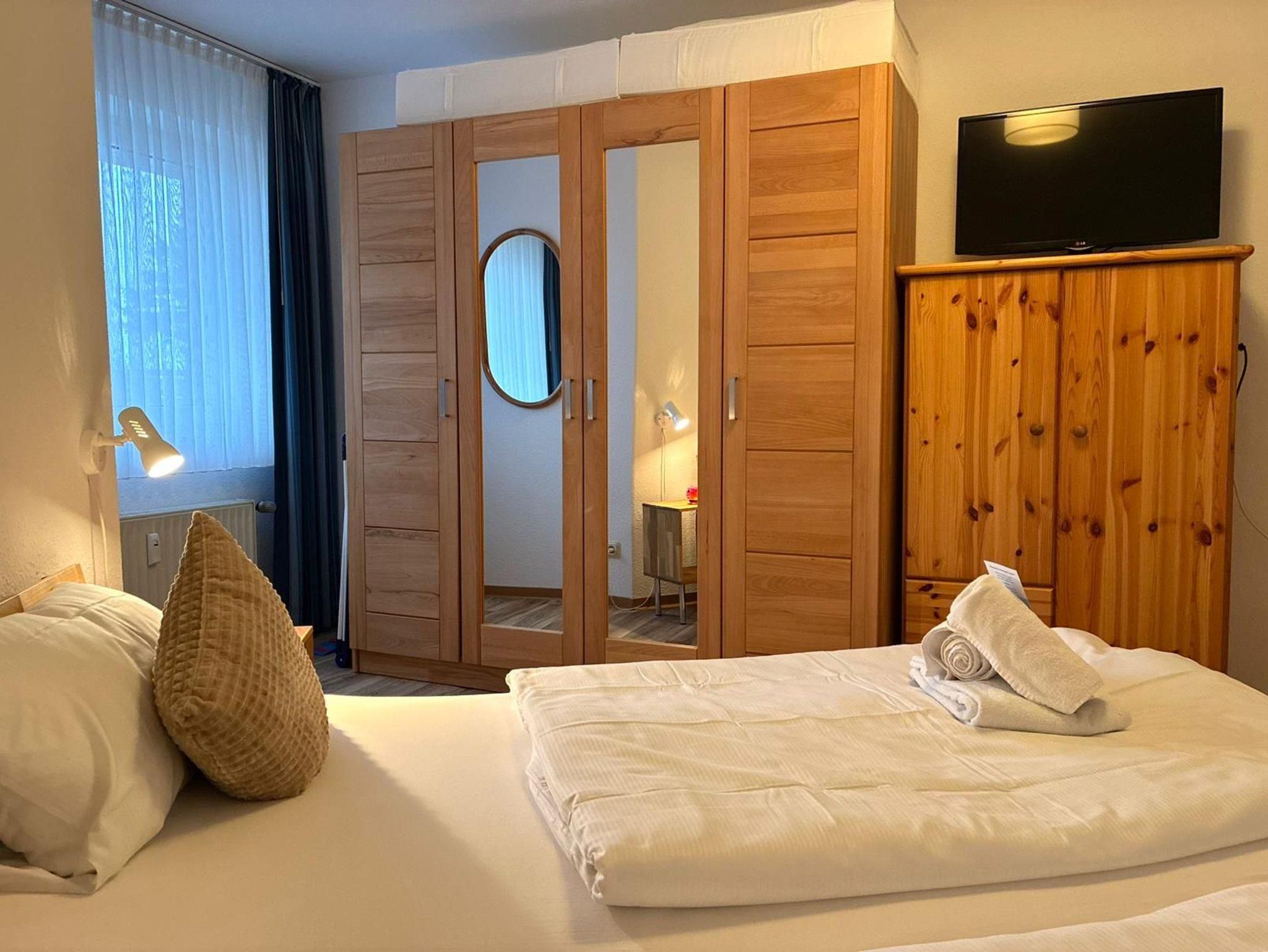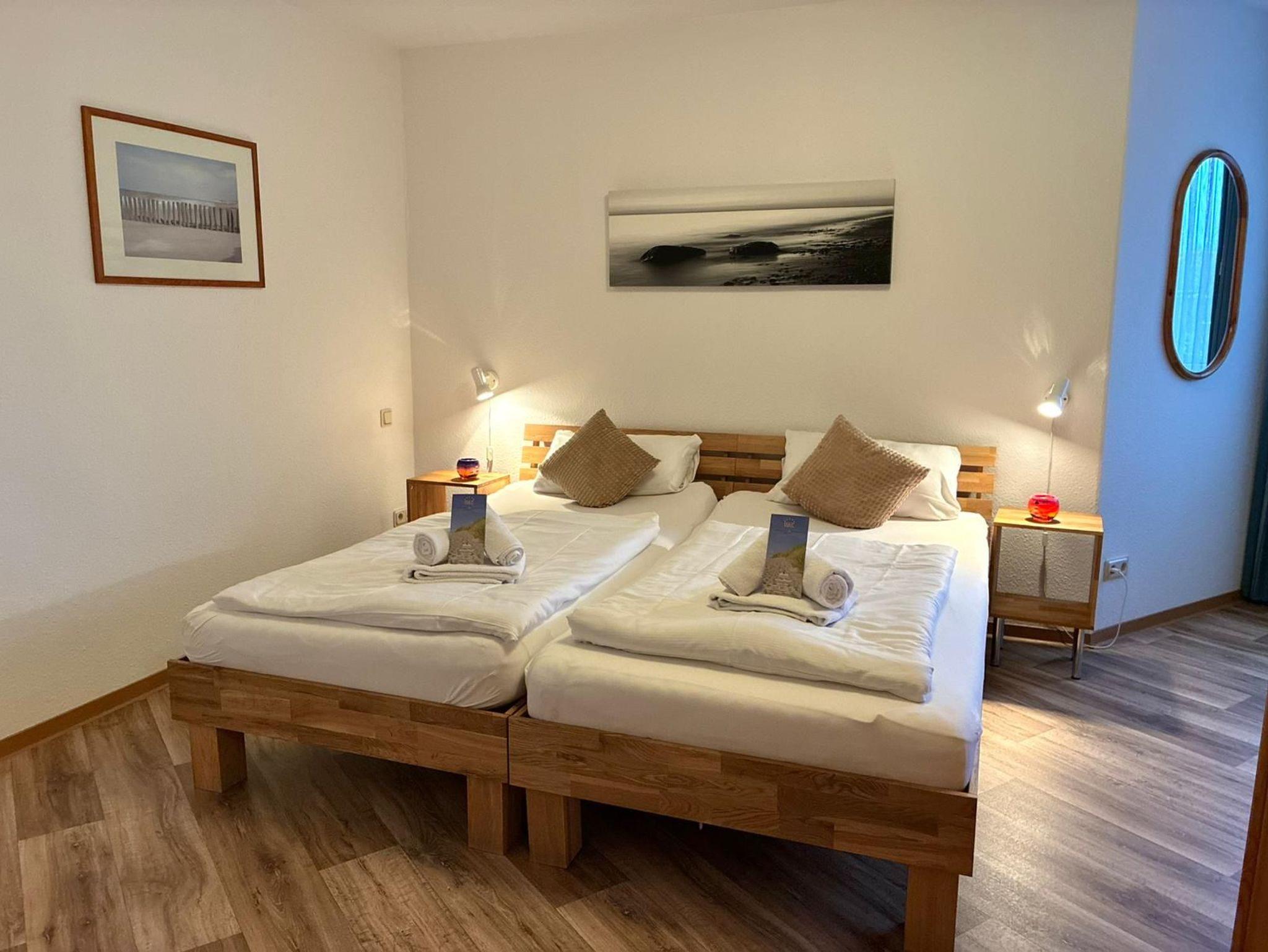 2-Zimmer-Appartement für bis zu 4 Personen auf ca. 46 m². Schlafzimmer mit Doppelbett, Wohn-Schlafraum mit Doppelbettcouch, TV, separatem Essplatz, voll ausgestattetem Küchenbereich, Balkon oder Terrasse, Bad mit Dusche/WC. WLAN und PKW-Stellplatz vorhanden.