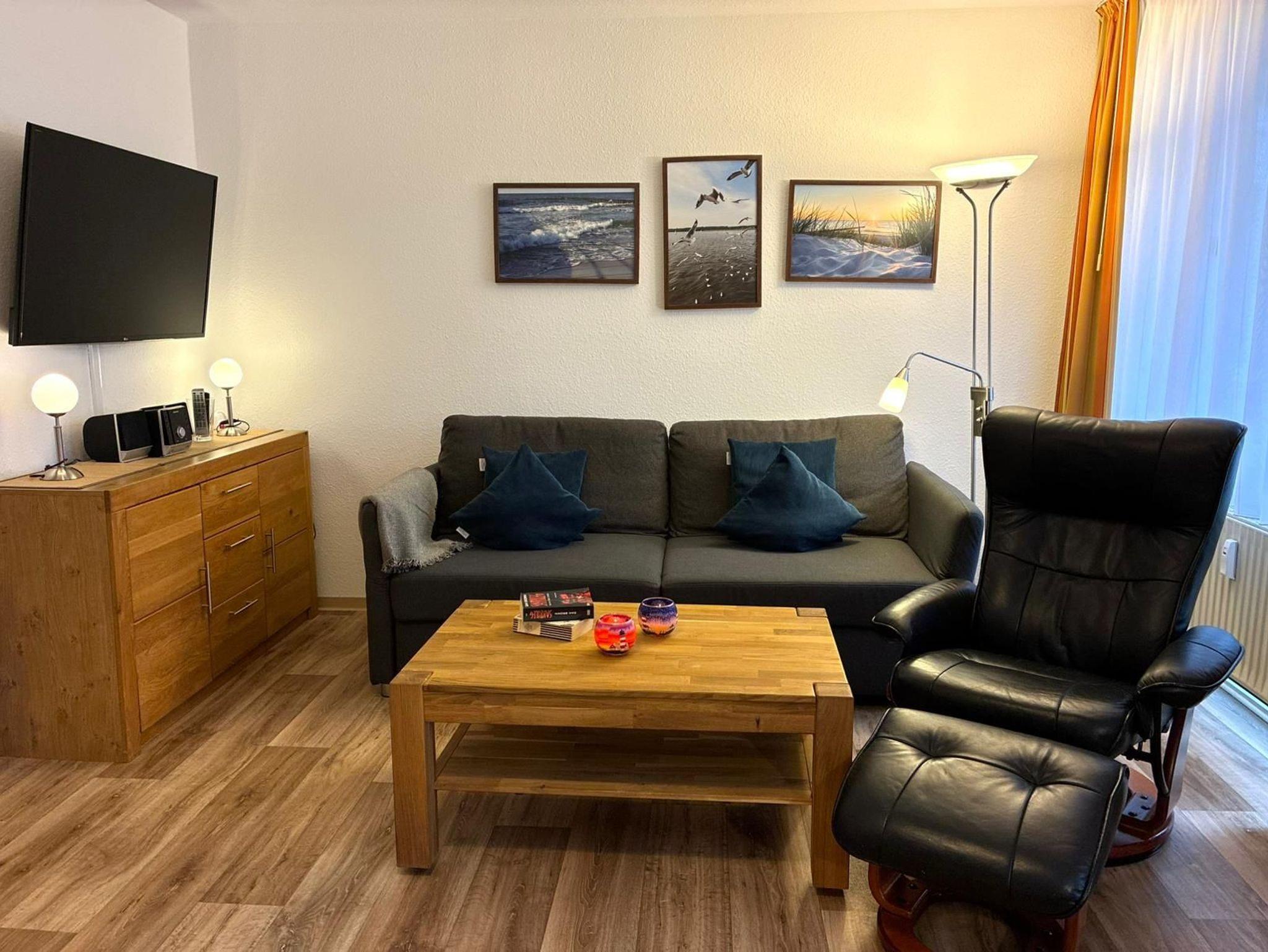 Wohnraum: Sitzecke mit bequemer Doppelbettcouch (Liegefläche einzeln 90 cm x 210 cm bzw. doppelt 180 cm x 210 cm, Liegehöhe=Sitzhöhe), LED-TV (Flachbildschirm), Radio (mit CD-Player, für Wiedergabe per USB-Stick, mit DVD-Player für den Fernseher), separater Essplatz, sehr gute Verdunklungsvorhänge