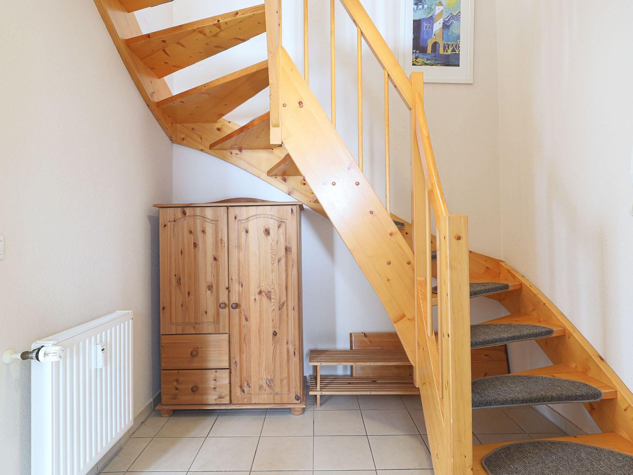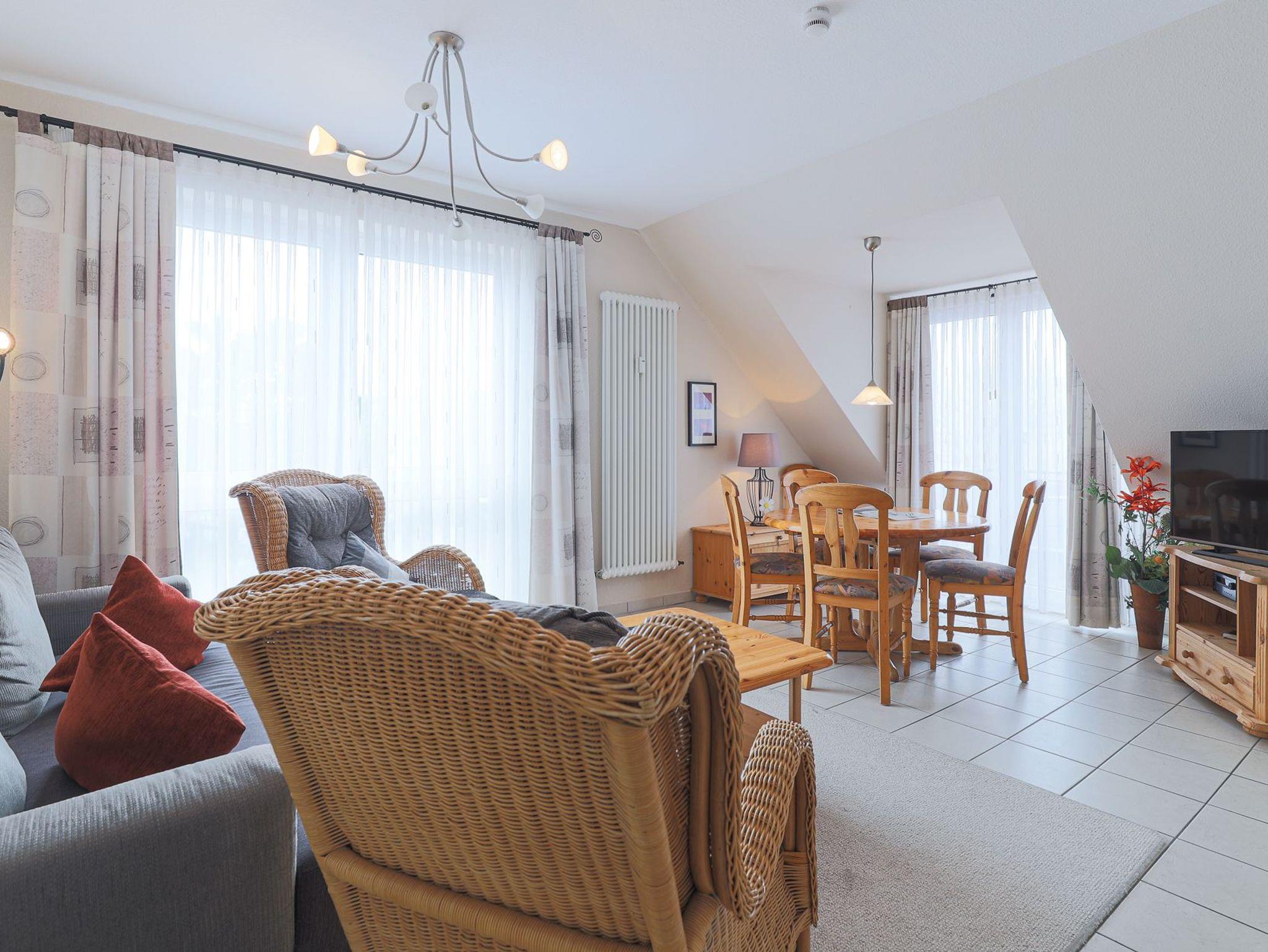 Im oberen Wohnbereich erwartet Sie ein offener, großzügiger Wohn-, Ess- und Küchenbereich mit direktem Zugang zum Westbalkon ? hier genießen Sie die Nachmittagssonne in vollen Zügen nach einem Spaziergang am Meer. Die Einbauküche ist komplett ausgestattet und lädt zu gemeinsamen Kochmomenten ein. Ebenfalls im Dachgeschoss befindet sich ein praktisches Gäste-WC.
