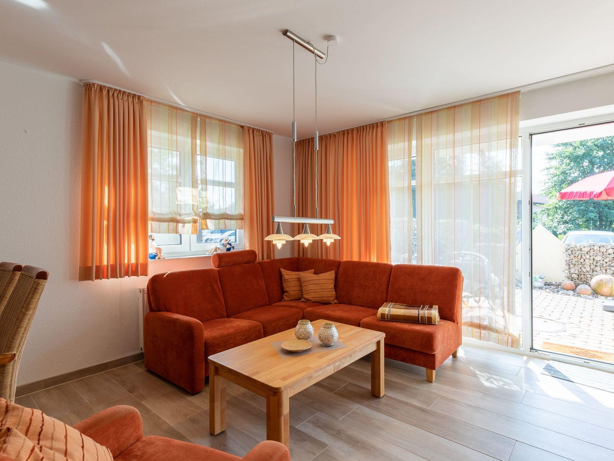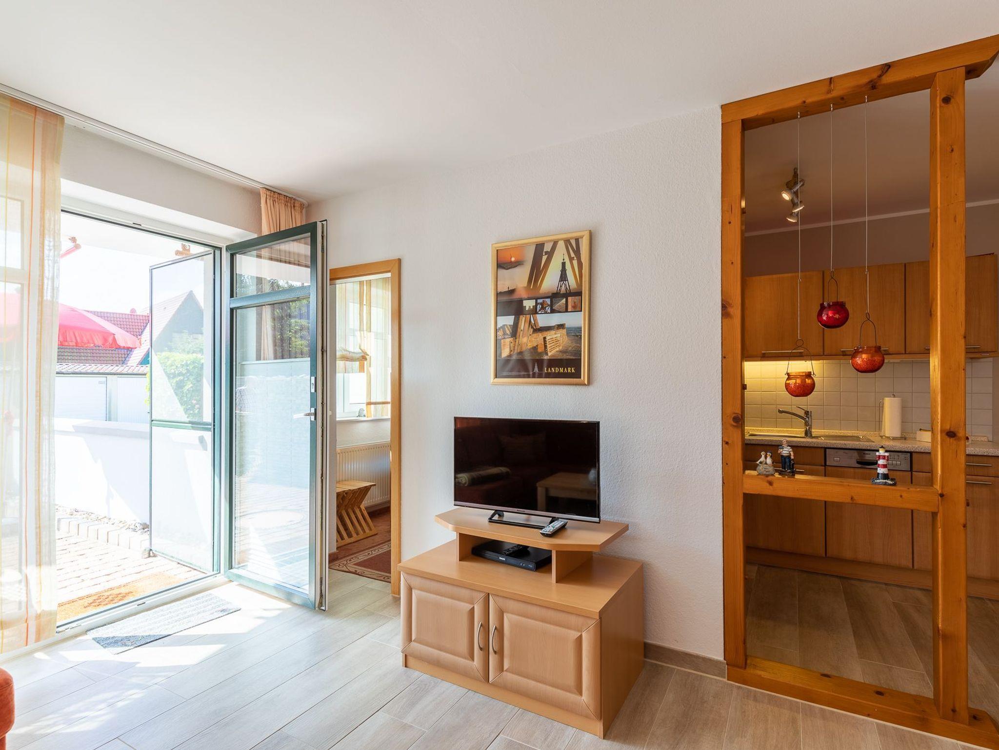 Die modern eingerichtete Ferienwohnung mit einer Größe von ca. 65 m² Wohnfläche ist komplett bis zu 4 Personen ausgestattet. 1 Schlafzimmer mit Doppelbett, 1 Schlafzimmer mit Etagenbett, 1 Wohnzimmer mit Küchenzeile (Cerankochfeld, Backofen, Geschirrspüler, Kaffeemaschine, Toaster, Wasserkocher, Kühlschrank mit Gefrierfach), Essplatz für 4 Personen, gemütliche Sofa-Ecke, 1 Flatscreen und direktem Zugang zur Terrasse, 1xDusche mit WC, Nichtraucherhaus, keine Haustiere, PKW-Stellplatz direkt am Haus.