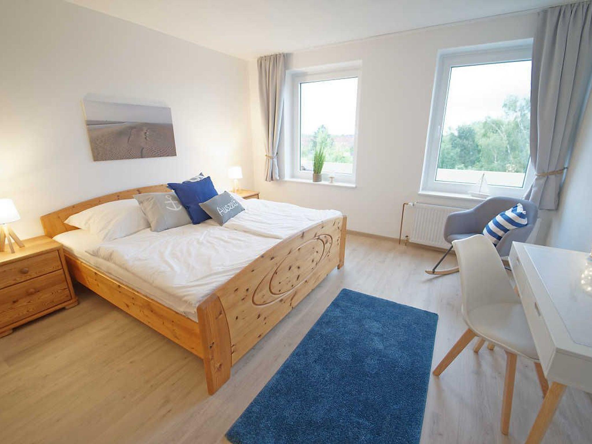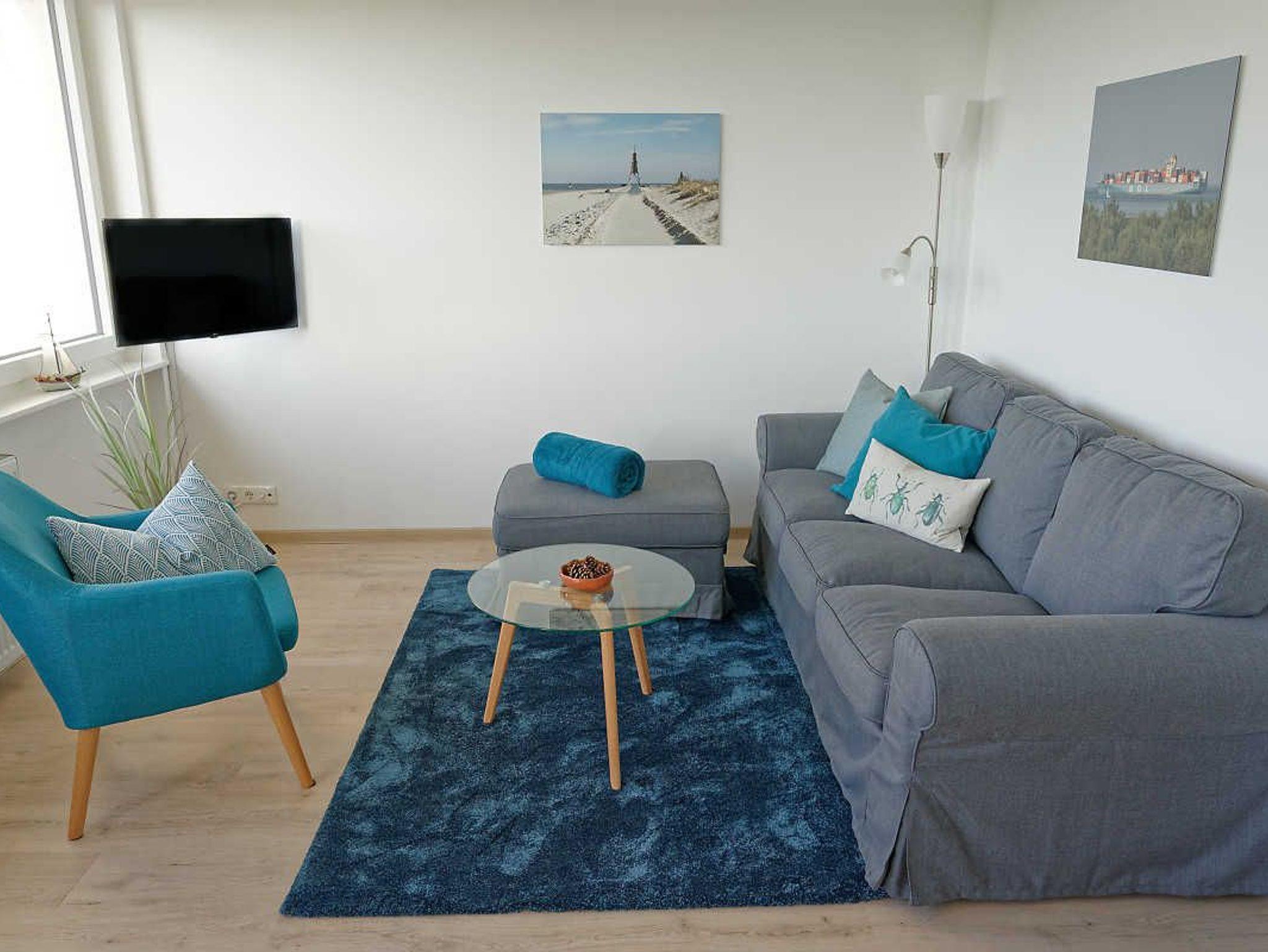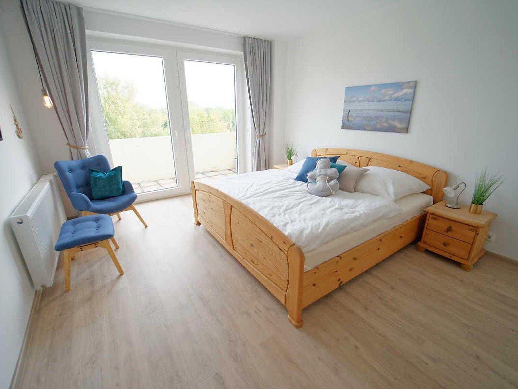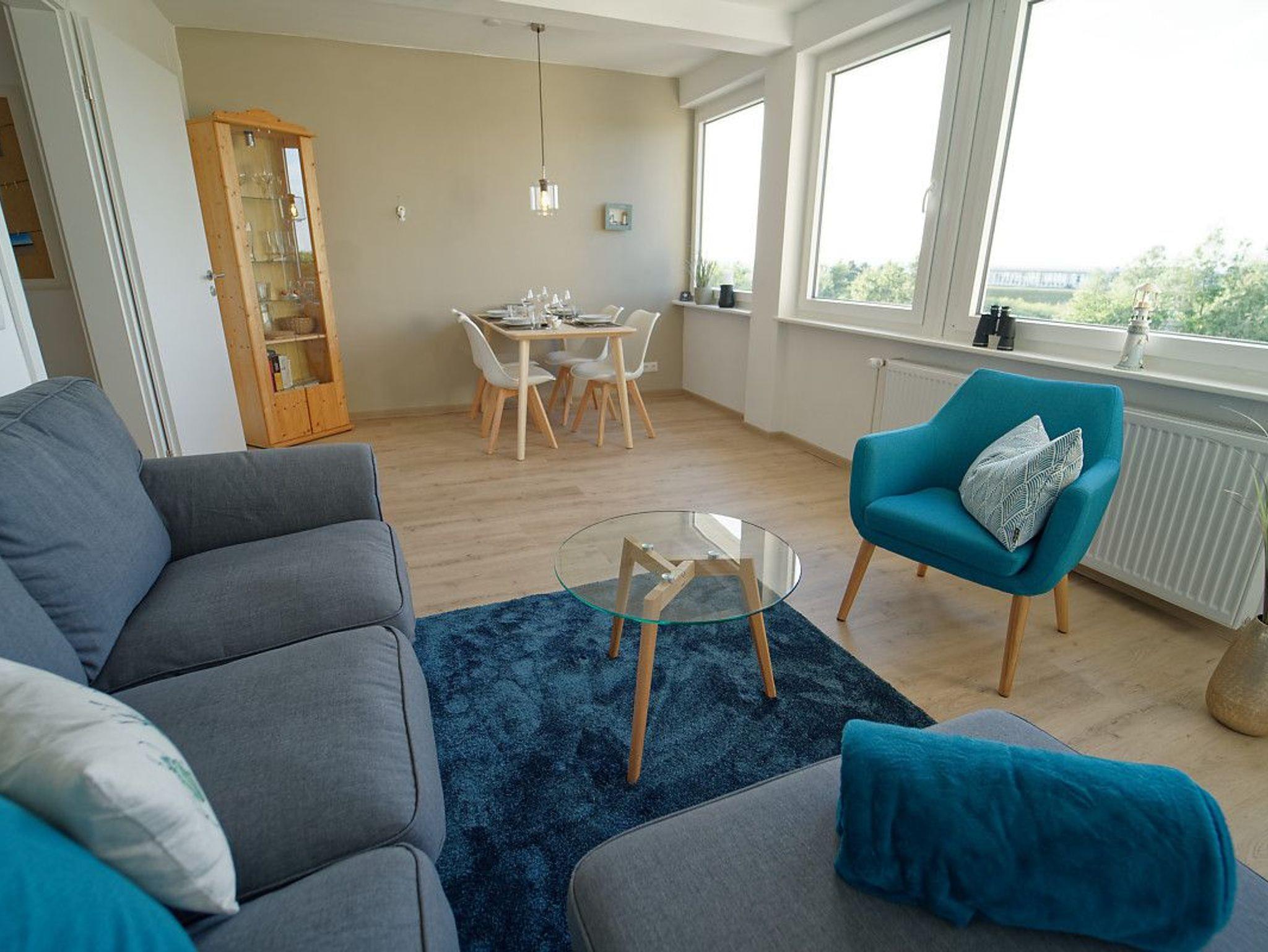 Zwei großzügige Schlafzimmer mit Doppelbetten sorgen für erholsame Nächte. Im Wohn- und Esszimmer genießen Sie dank der großen Fensterfront einen herrlichen Panoramablick auf die Nordsee und den Weltschifffahrtsweg. Das modern renovierte Badezimmer verfügt über Dusche, WC und eine Waschmaschine. Die voll ausgestattete Küche bietet mit Cerankochfeld, Backofen, Mikrowelle, Spülmaschine und Kühlschrank mit Gefrierfach allen Komfort für Ihren Aufenthalt. Auf dem sonnigen Südbalkon blicken Sie ins Grüne und können wunderbar entspannen.