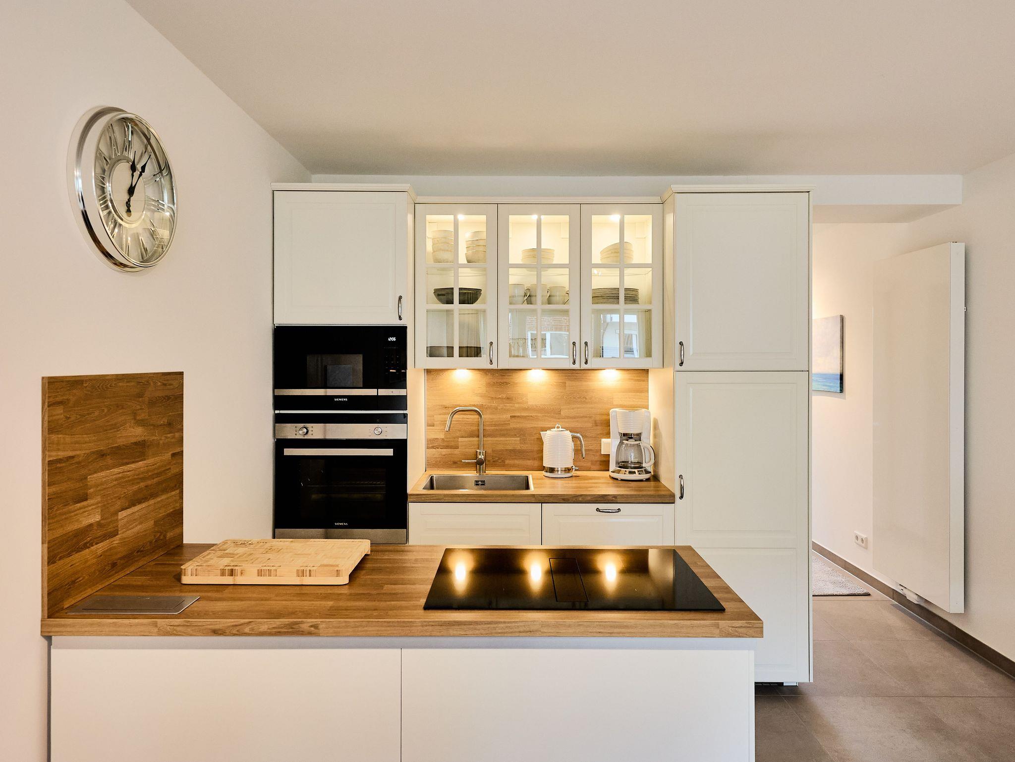 • Separate, moderne Einbauküche mit Kochinsel: Induktionskochfeld mit integriertem Abzug, Backofen, Mikrowelle, Geschirrspüler, Kühlschrank mit Gefrierfach, eingelassene Steckdosenleiste