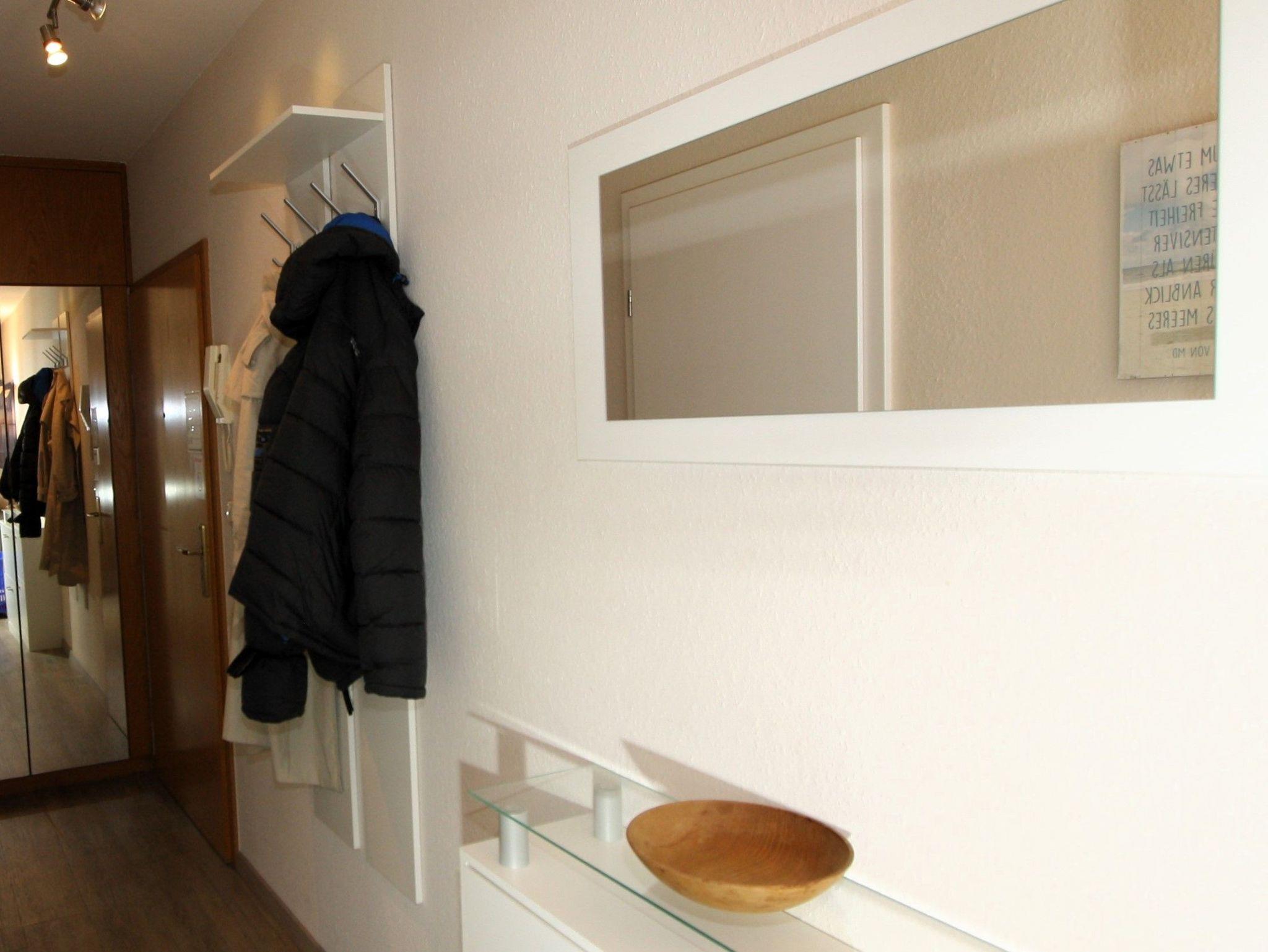 In der Diele befinden sich ein großer Ganzkörperspiegel sowie ausreichend Platz für Schuhe und Garderobe.