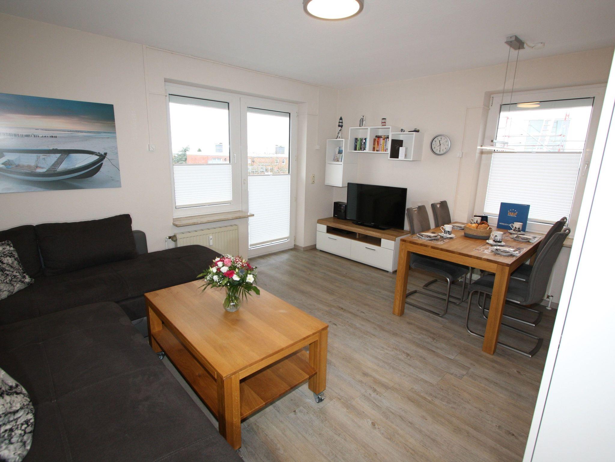 Sie wohnen in einem 2-Zimmer-Appartement für bis zu 4 Personen im 3. OG auf ca. 44 m² mit teilweisem Meerblick.