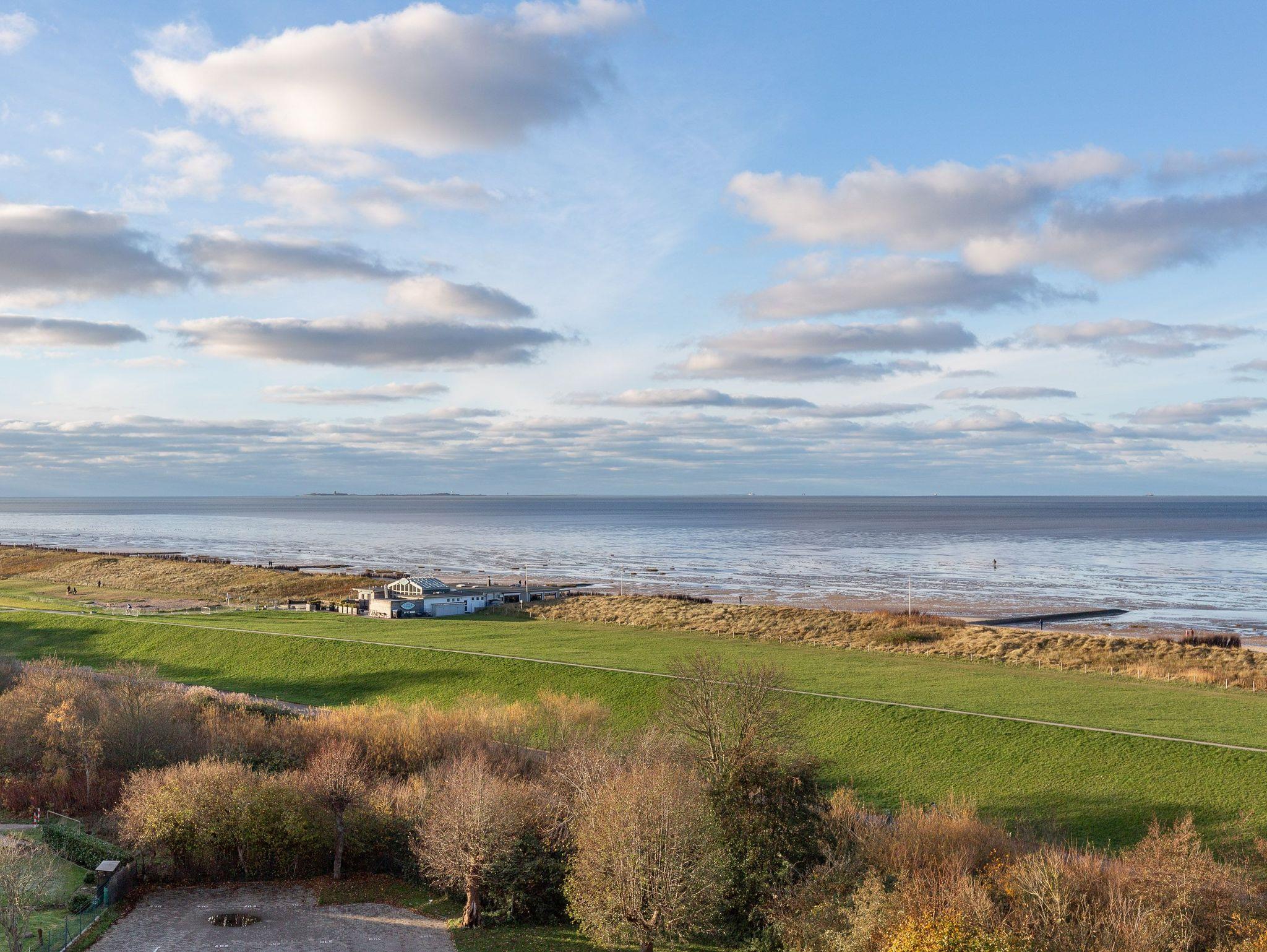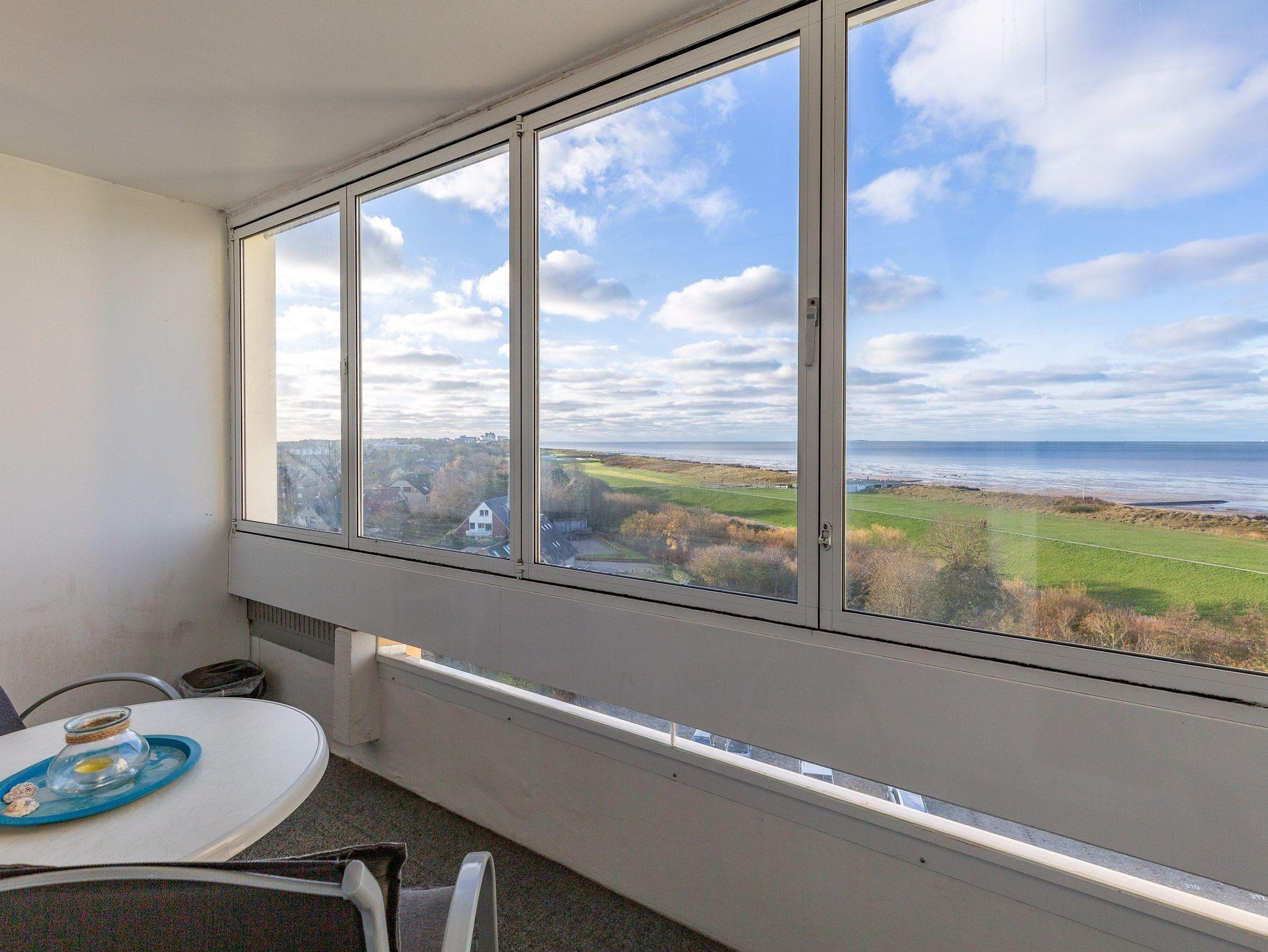 Genießen Sie im Haus Atlantic, FeWo 703, in Cuxhaven einen traumhaften Meerblick und entspannen Sie auf dem verglasten Balkon direkt am Sandstrand.