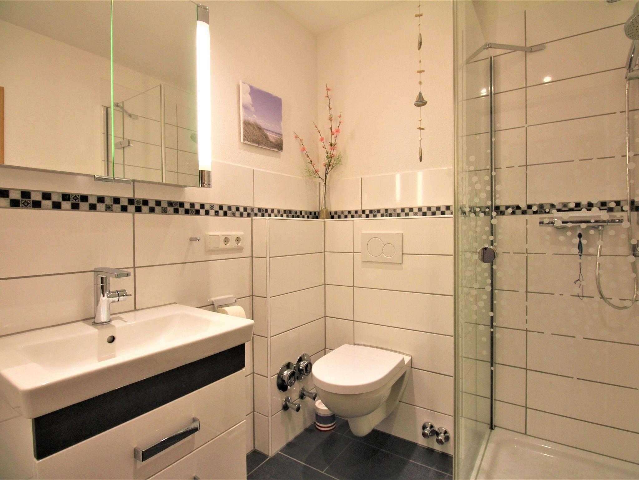 Modernes Bad mit Dusche/ WC, Föhn. Süd-Balkon mit Sitzecke und Sonnenschirm, die auch im Winterhalbjahr von der Sonne beschienen wird.