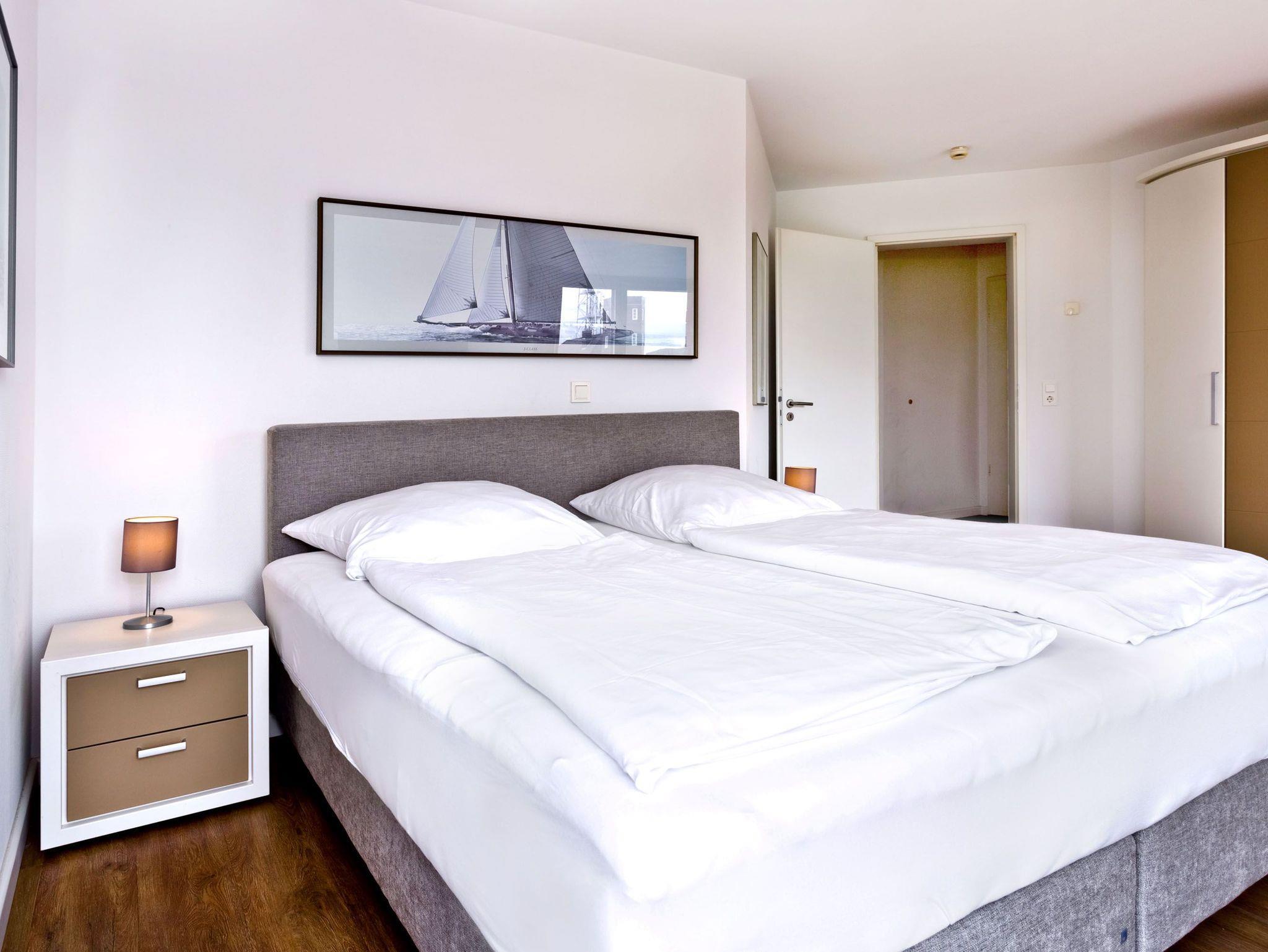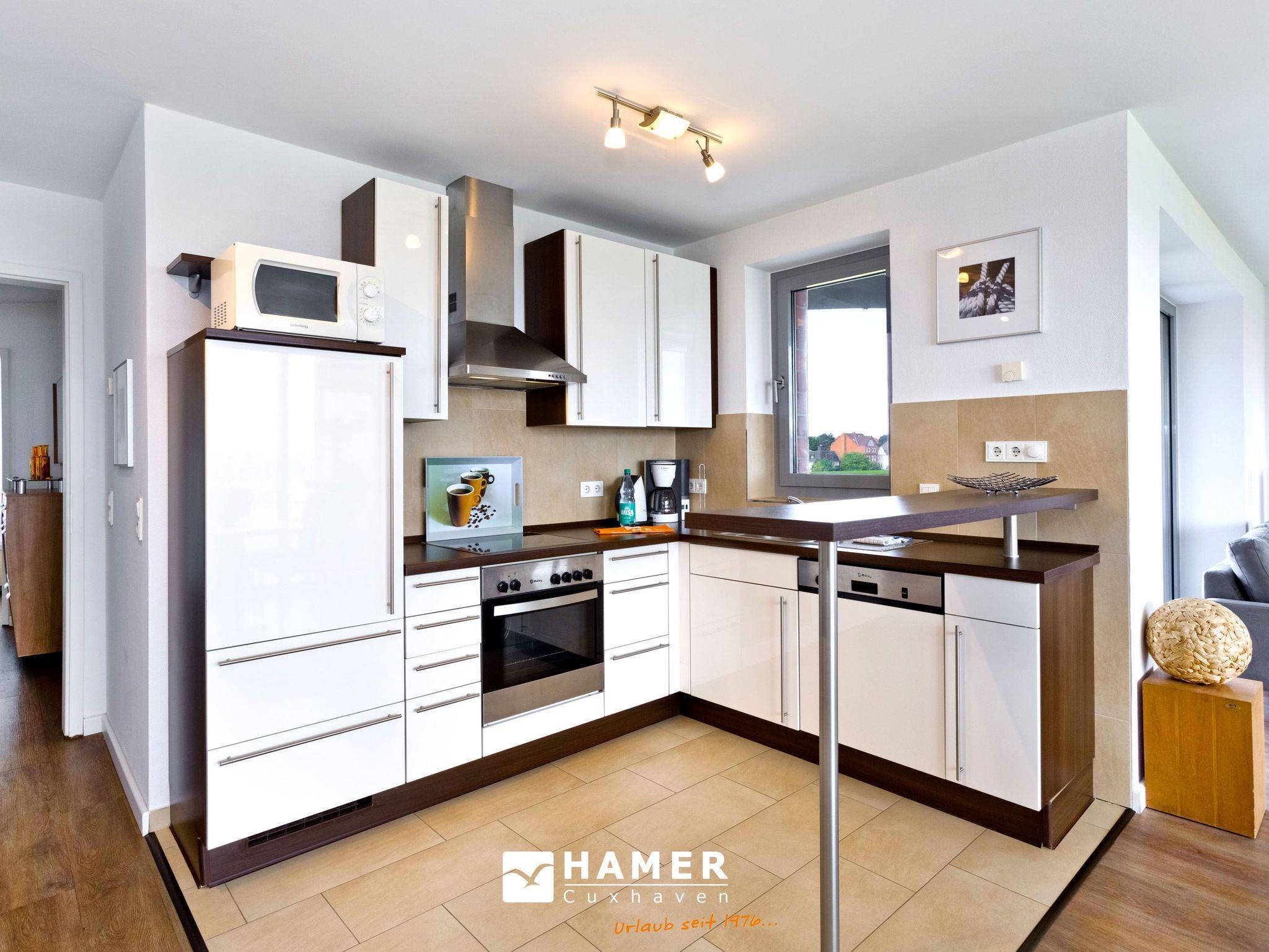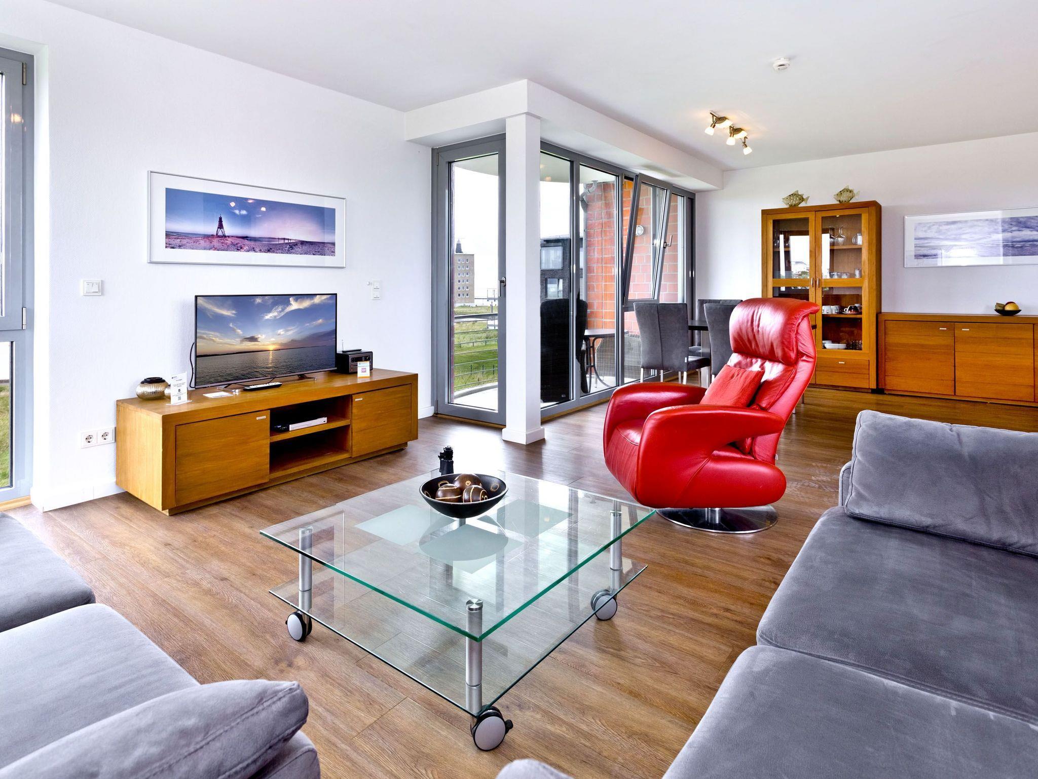 Aus allen drei Räumen dieser 105m² Wohnung in der 1.Etage haben Sie die Traumseesicht auf den Weltschifffahrtsweg. 2 Schlafzimmer jeweils mit Doppelbett (Boxspringbett), Bad/Du/Wc, Gäste-WC, großes Wohnzimmer mit komplett ausgestatteter Küchenzeile, 2xKabel/TV/DVD, 2 Balkone (nord+süd) mit Balkonmöbeln und Sonnenschirm (saisonabhängig). Alle Räume sind hochwertig gestaltet und verfügen über Rollladen. Wama i.d. Whg. Zur Wohnung gehört ein nummerierter Stellplatz auf dem Außengelände. Nichtraucher und keine Haustiere.