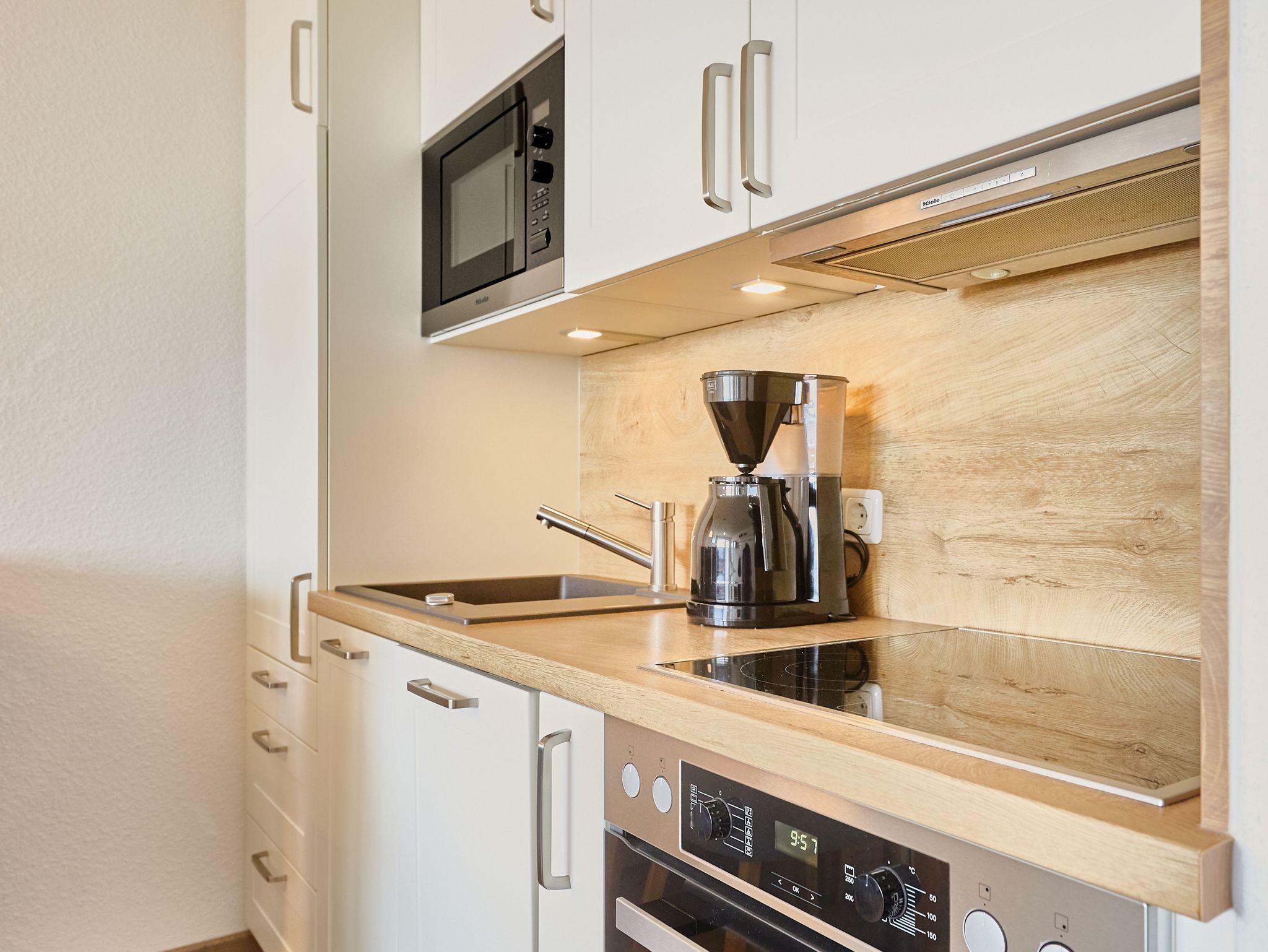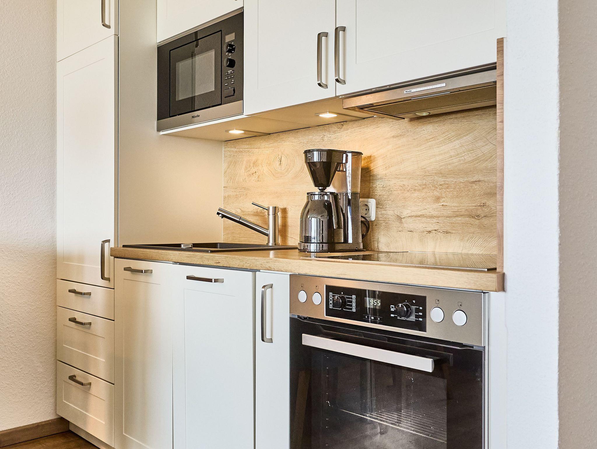 Die Küche ist vollständig eingerichtet und bietet alles für die Selbstverpflegung. Der Essbereich grenzt direkt an und eignet sich für gemeinsame Mahlzeiten.