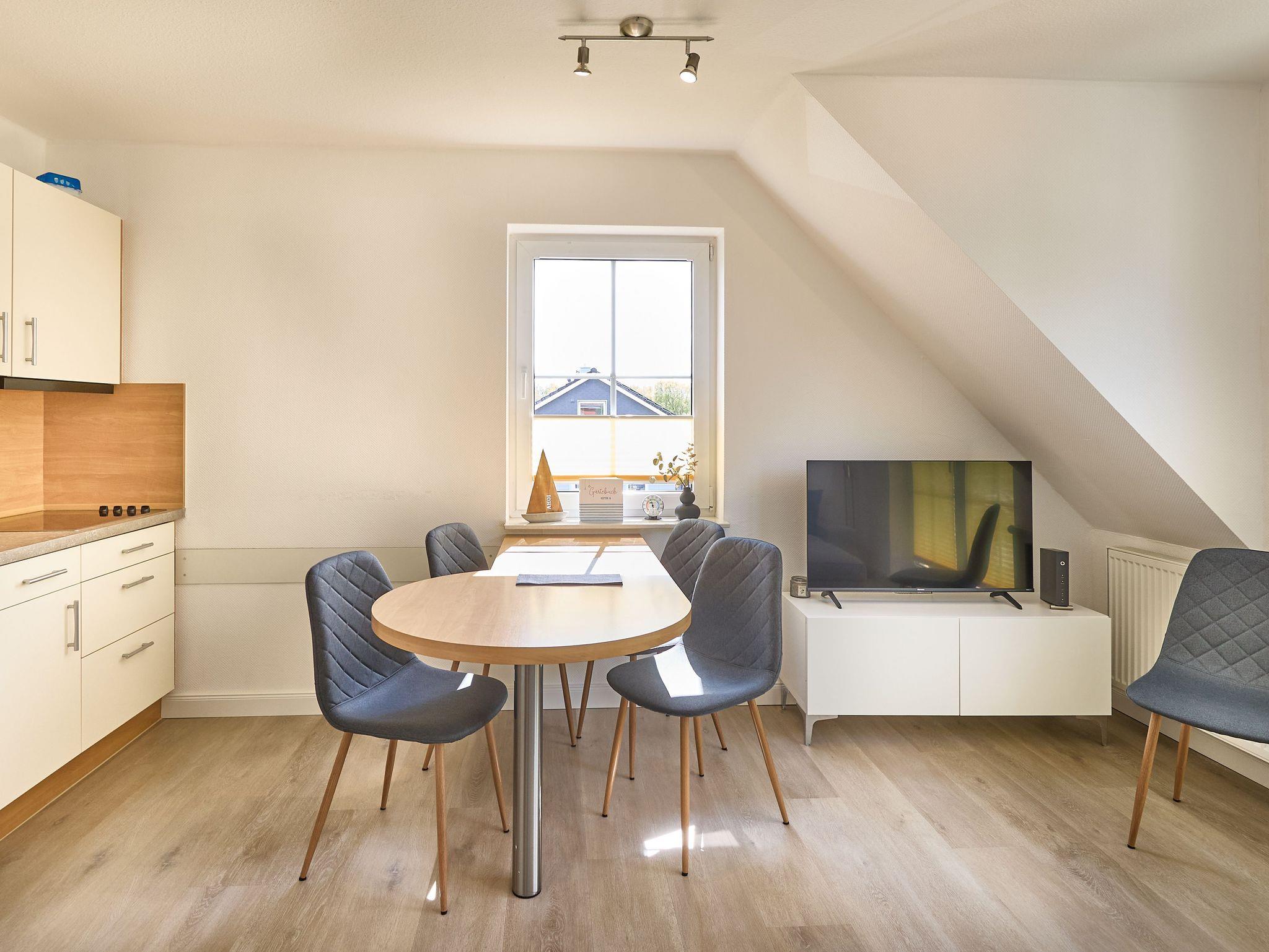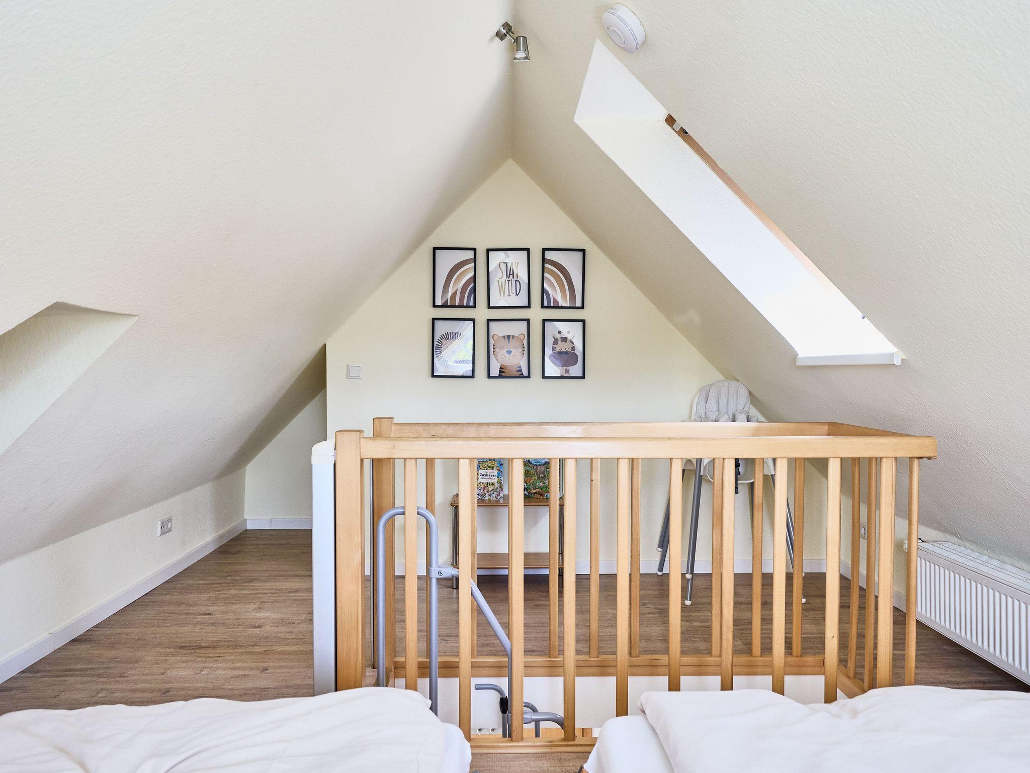 Die geräumige 3-Raum-Ferienwohnung erstreckt sich über ca. 64m² und bietet Platz für bis zu 4 Personen. Sie verfügt über ein separates Schlafzimmer mit einem gemütlichen Doppelbett sowie ein Kinderzimmer mit zwei Einzelbetten im Dachgeschoss. Für die kleinen Gäste gibt es einen speziellen Spielbereich im ausgebauten Dachgeschoss, wo sie sich austoben können.