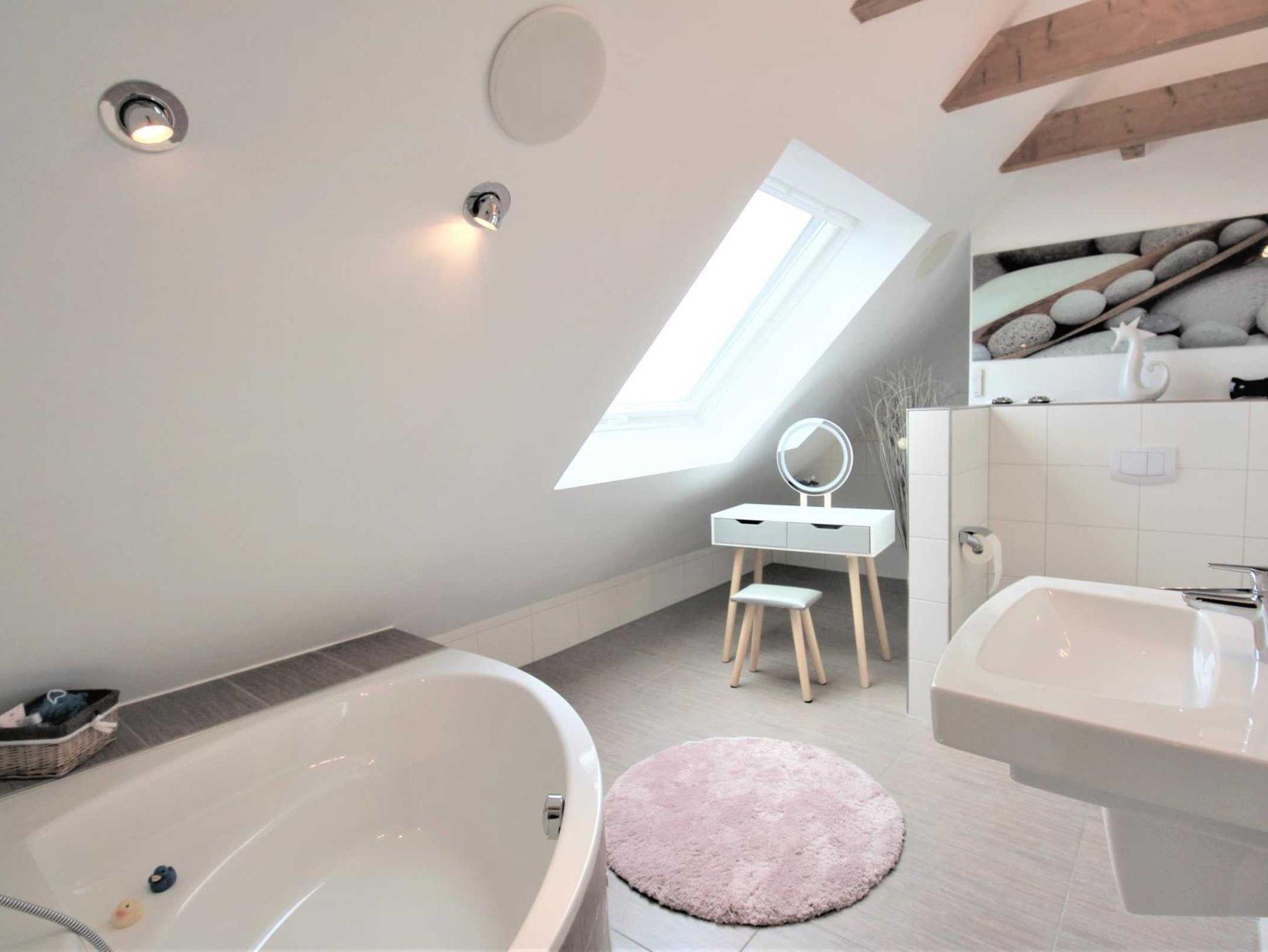 Obere Ebene: Großzügiges Wohlfühlbad mit beleuchteter Eckbadewanne, Kosmetiktisch sowie Föhn sind vorhanden. Optimaler Radioempfang durch große Lautsprecher.